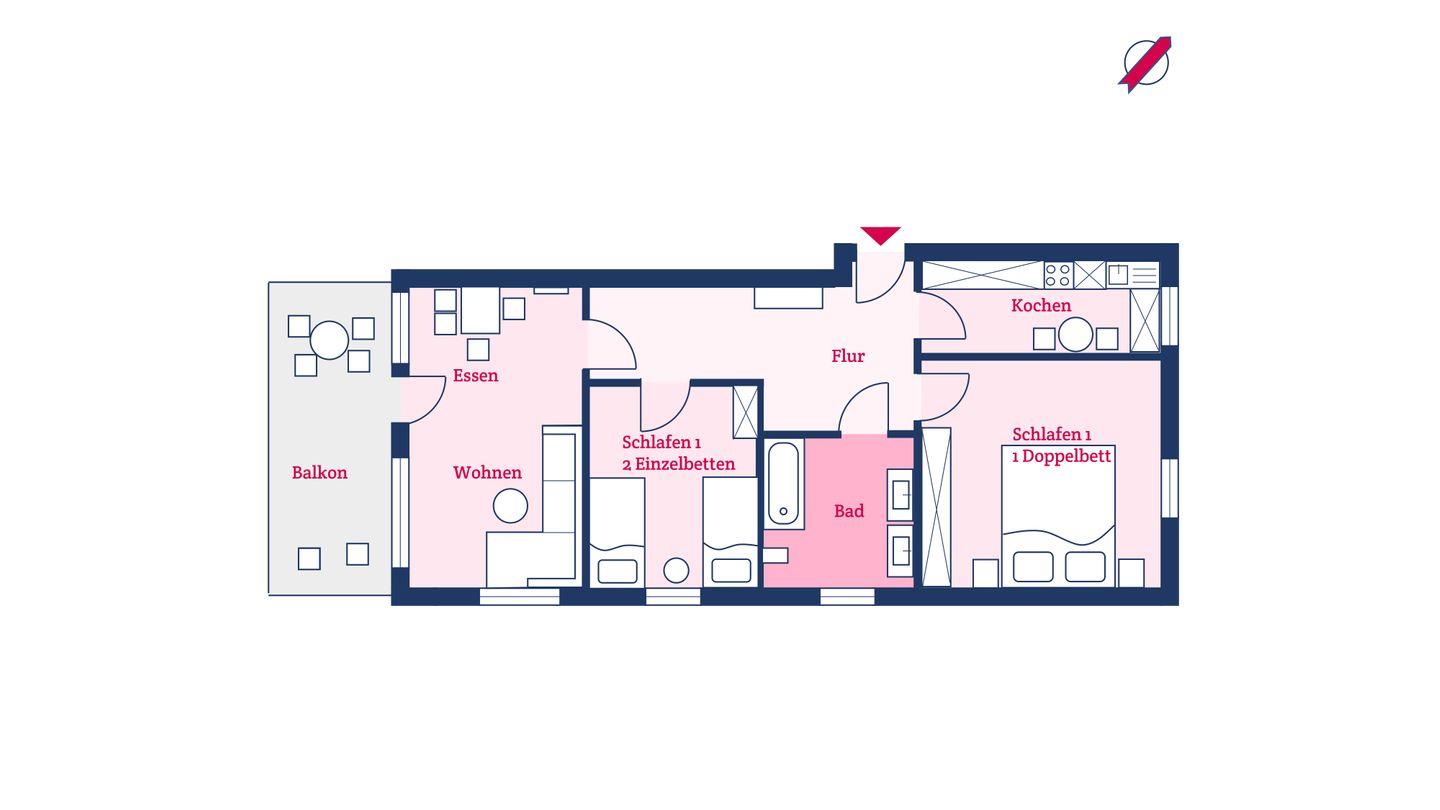 In dieser modernen Ferienwohnung finden Sie ein lichtdurchflutetes Wohnzimmer vor, von welchem Sie direkt auf den Balkon gelangen. Des Weiteren erwartet Sie eine separate Küche und ein Badezimmer mit Dusche. Ein Schlafzimmer enthält ein Doppelbett und eines zwei Einzelbetten.