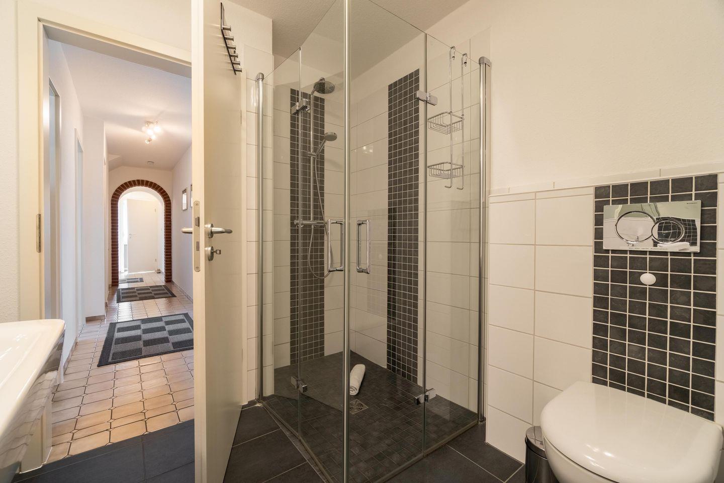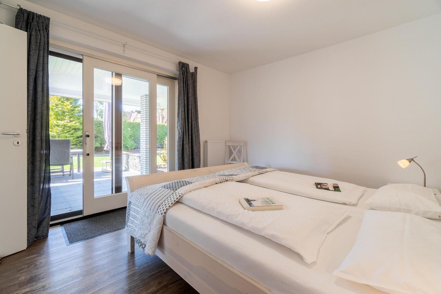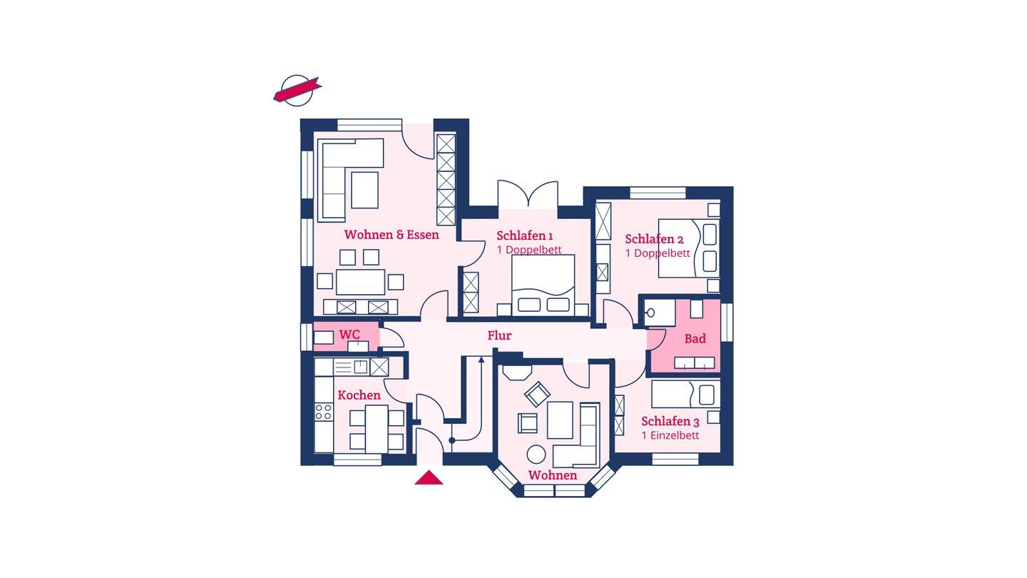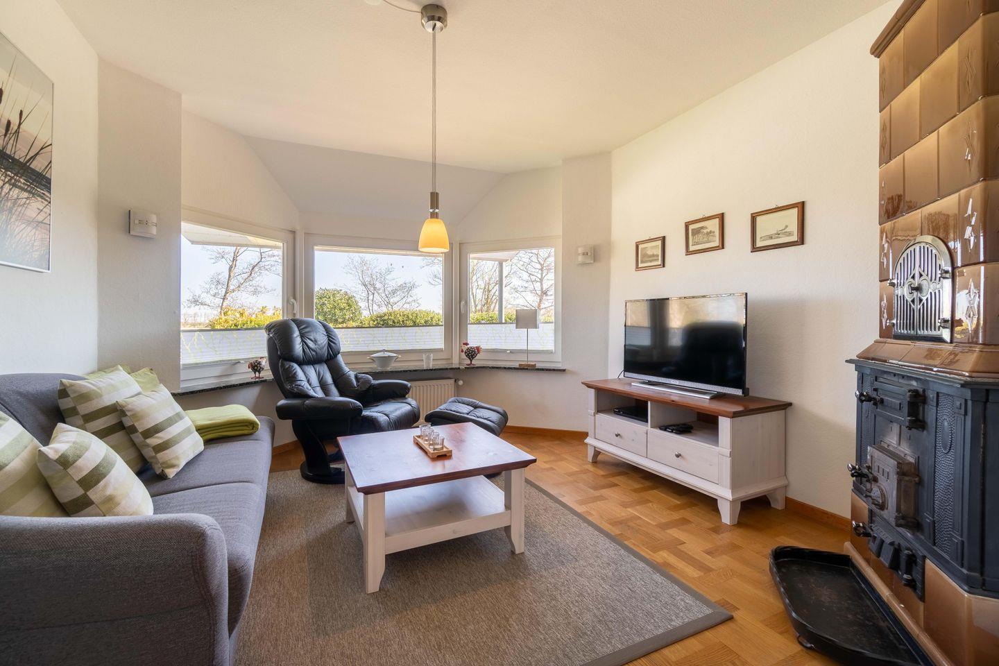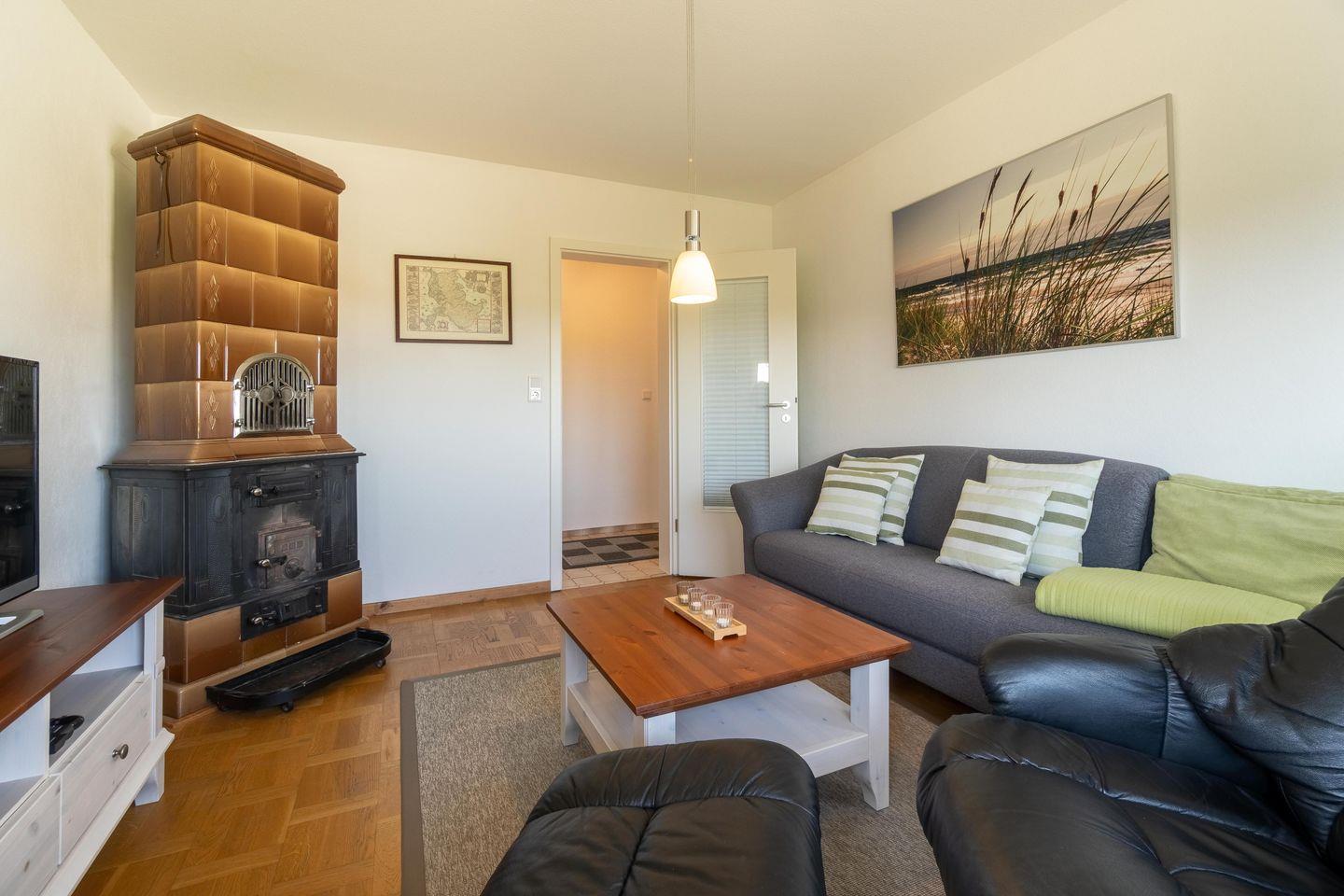 Das große Wohn-/Esszimmer bildet das Herzstück der Erdgeschosswohnung. Von hier und vom angrenzendem Schlafzimmer aus gelangen Sie auf Ihre eigene Terrasse mit Strandkorb. In der Küche steht ein weiterer Esstisch. Neben einem Bad mit bodengleicher Dusche gibt es in der Wohnung noch ein Gäste-WC. Highlight ist sicherlich, dass ein zweites kleines Wohnzimmer mit Ofen in der Wohnung vorhanden ist. Der Waschraum befindet sich im Keller und steht den Gästen beider Wohnungen gemeinschaftlich zur Verfügung.