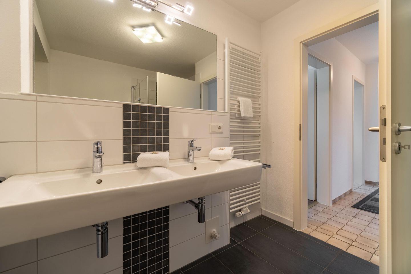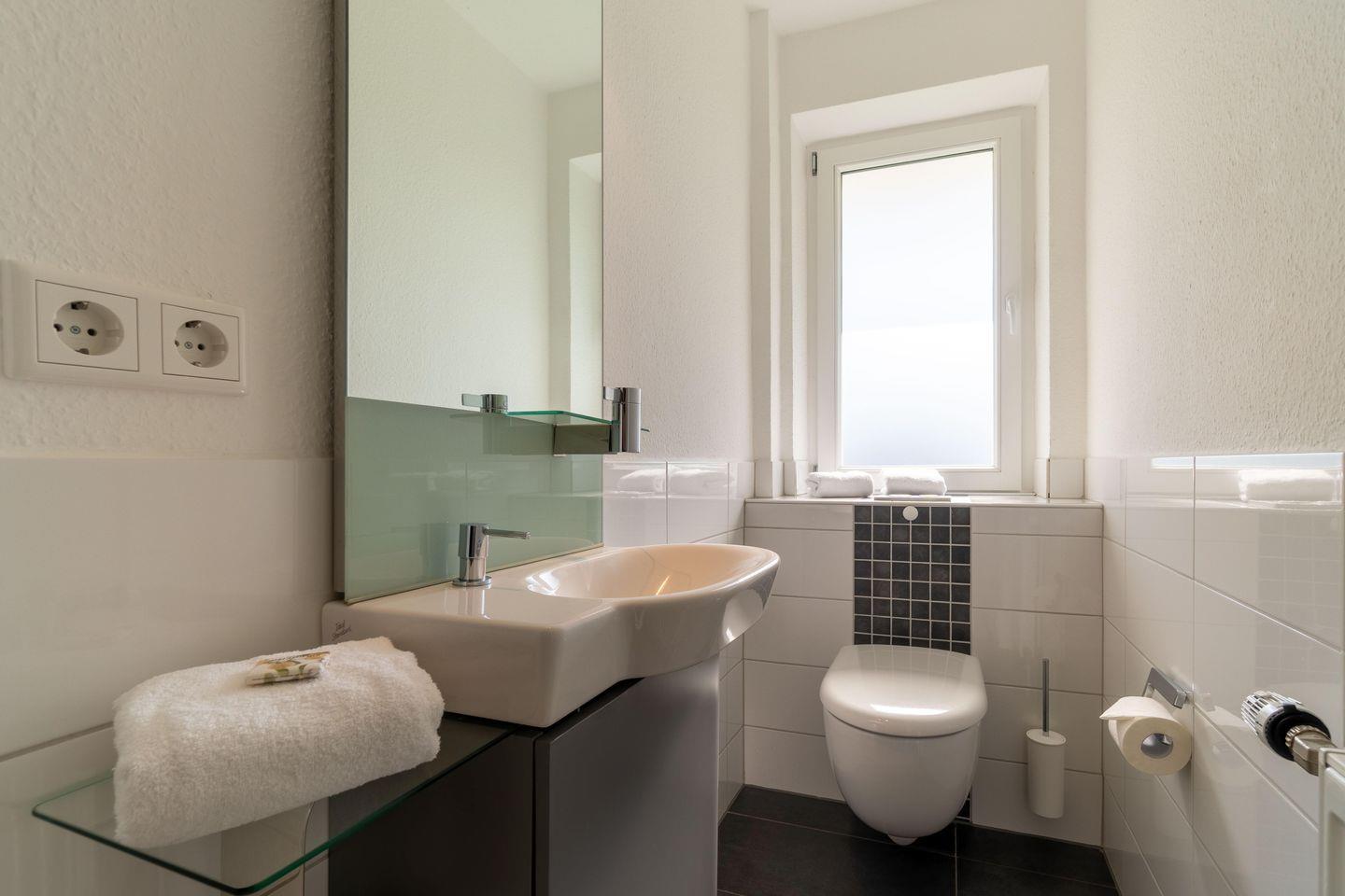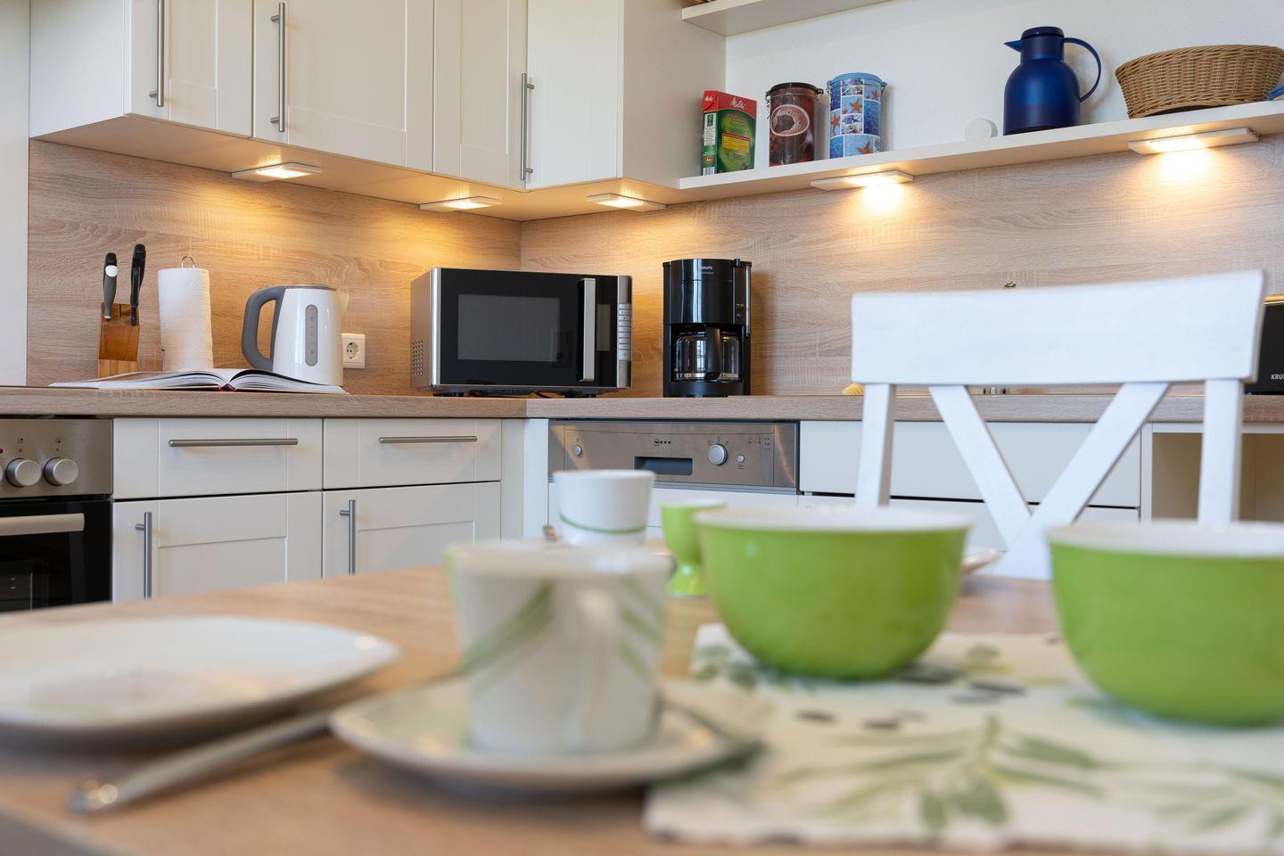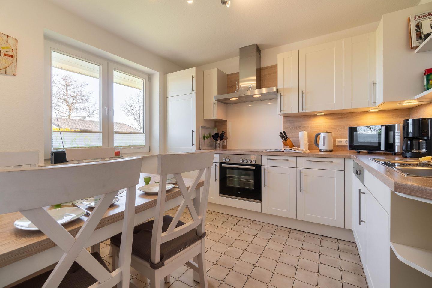 Das große Wohn-/Esszimmer bildet das Herzstück der Erdgeschosswohnung. Von hier und vom angrenzendem Schlafzimmer aus gelangen Sie auf Ihre eigene Terrasse mit Strandkorb. In der Küche steht ein weiterer Esstisch. Neben einem Bad mit bodengleicher Dusche gibt es in der Wohnung noch ein Gäste-WC. Highlight ist sicherlich, dass ein zweites kleines Wohnzimmer mit Ofen in der Wohnung vorhanden ist. Der Waschraum befindet sich im Keller und steht den Gästen beider Wohnungen gemeinschaftlich zur Verfügung.