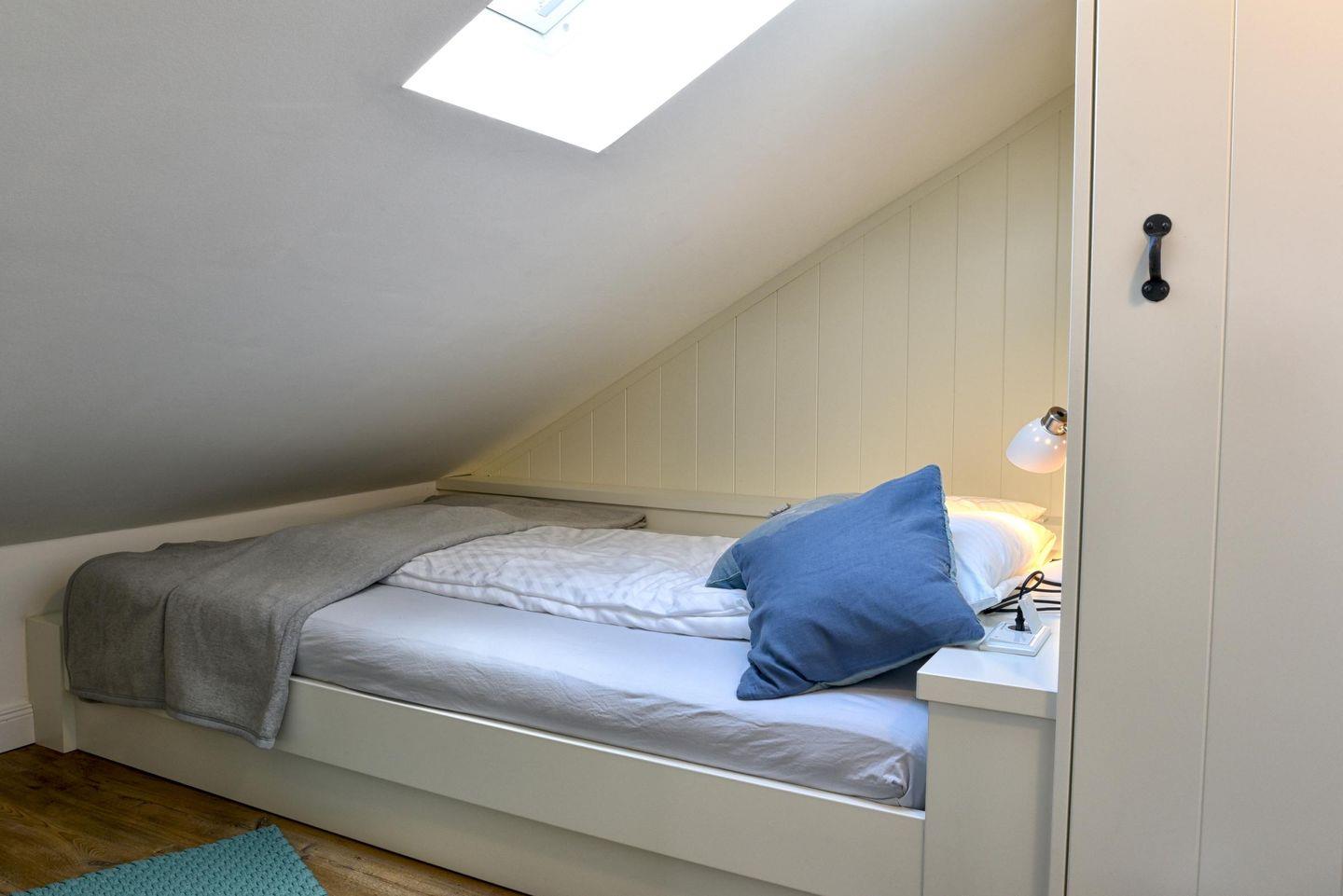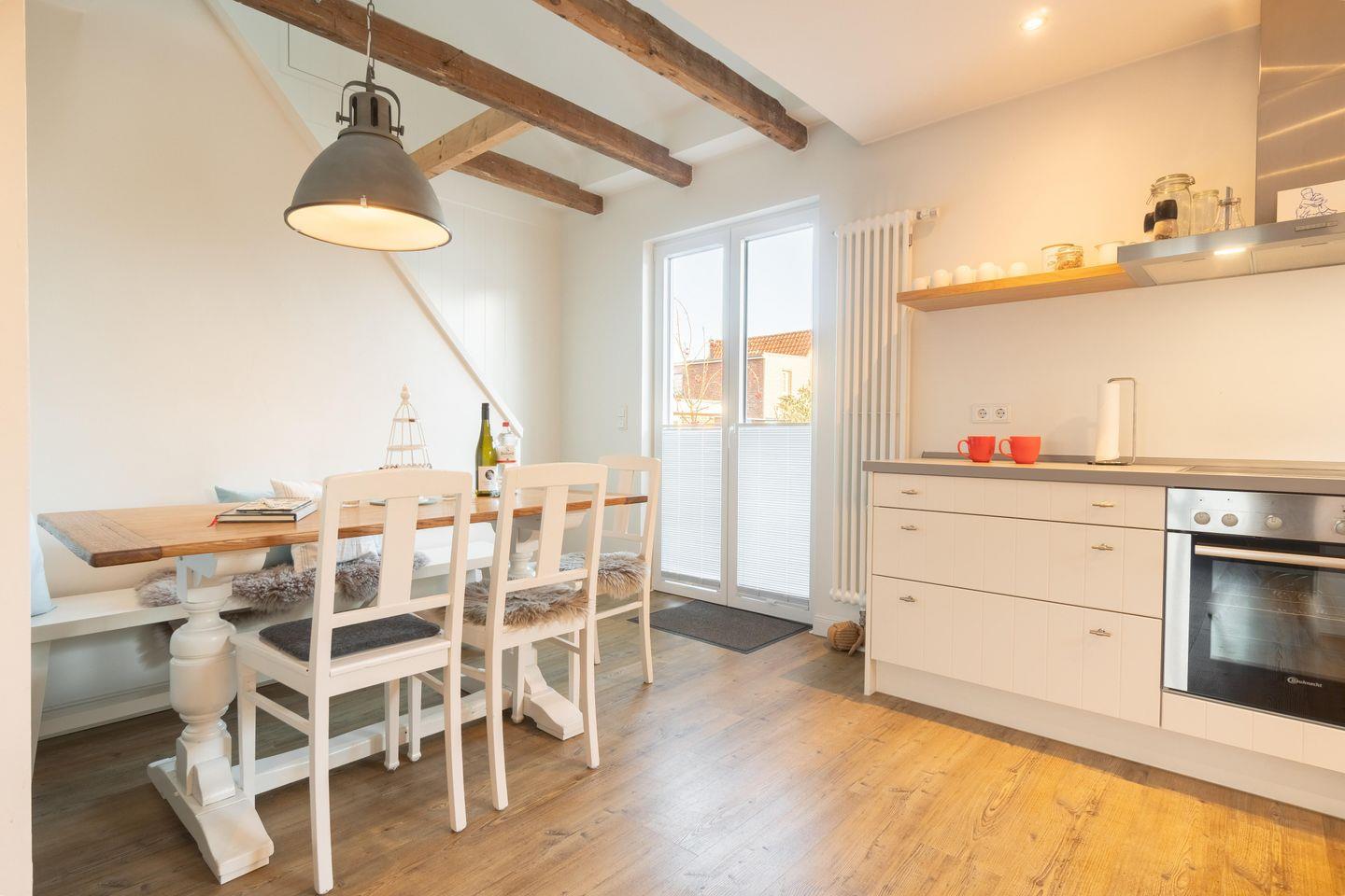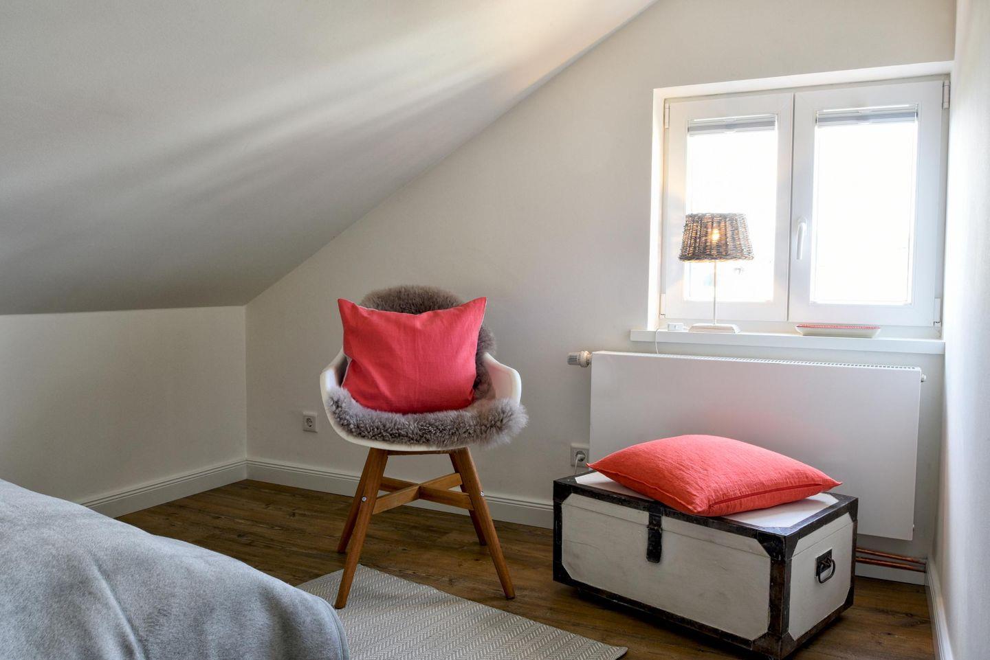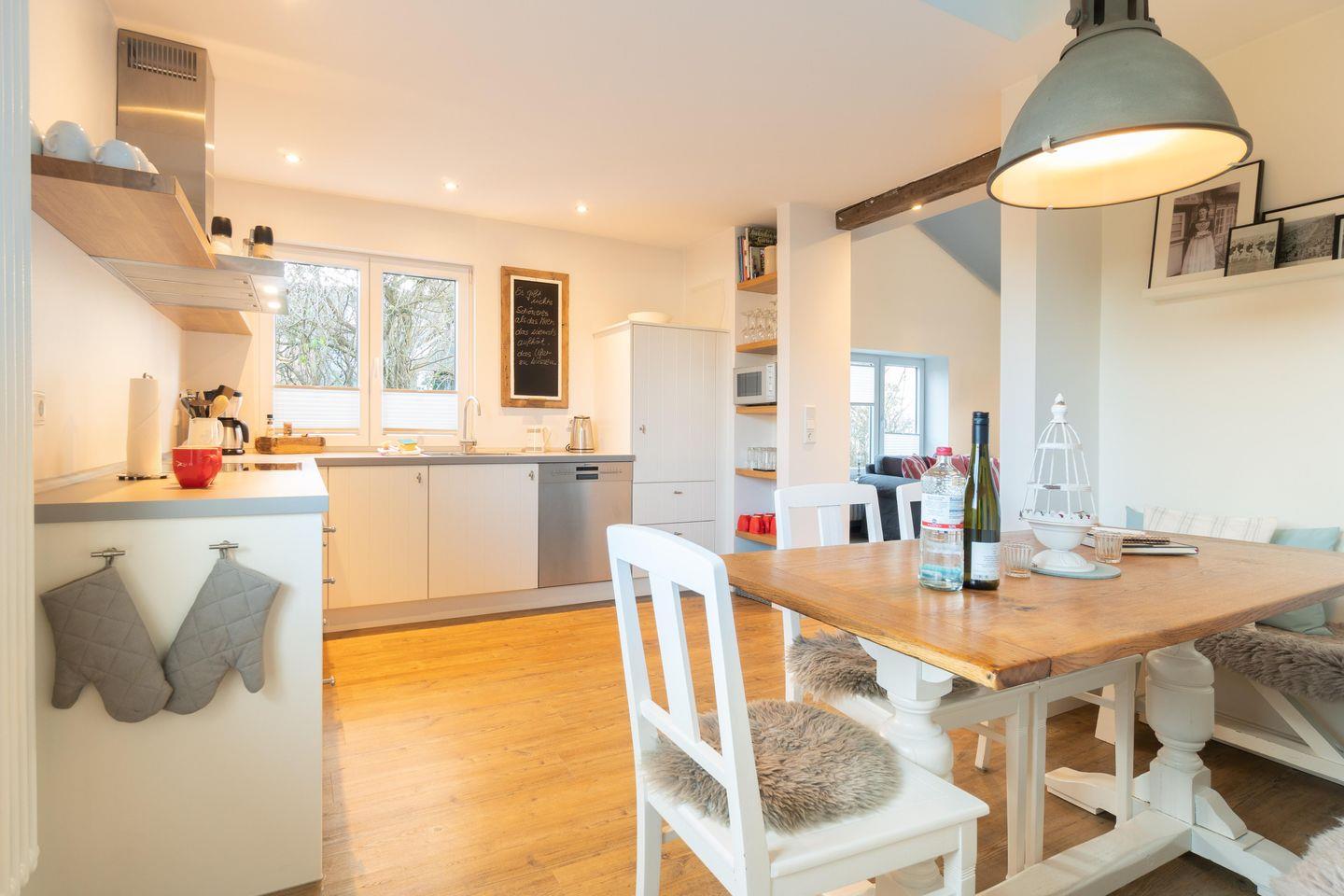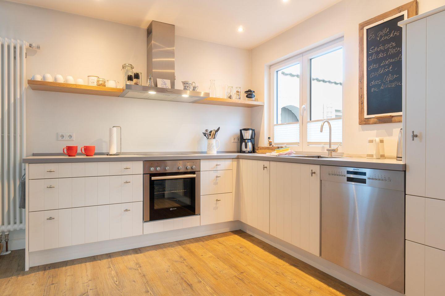 Hörnchens Nest ist sowohl modern als auch traditionell eingerichtet und erstreckt sich über zwei Etagen. Im Erdgeschoss des Hauses befinden sich der geschmackvoll eingerichtete Wohnbereich sowie die lichtdurchflutete Küche mit Essbereich, von welcher Sie auch direkt auf die Terrasse mit Garten austreten können. Die Küche ist sehr gut ausgestattet: Neben Markengeräten finden Sie eine vielfältige Ausstattung vor, wie beispielsweise diverse Backutensilien. Ebenfalls im Erdgeschoss befindet sich das Badezimmer mit Dusche sowie ein großzügiges Schlafzimmer mit Doppelbett. Die zwei weiteren Schlafzimmer, mit jeweils einem Einbaukleiderschrank, befinden sich, ebenso wie das Bad mit Badewanne, im Obergeschoss. Eine Waschmaschine und ein Trockner sowie ein zusätzlicher Kühl- und Gefrierschrank befinden sich im Keller des Feriendomizils.