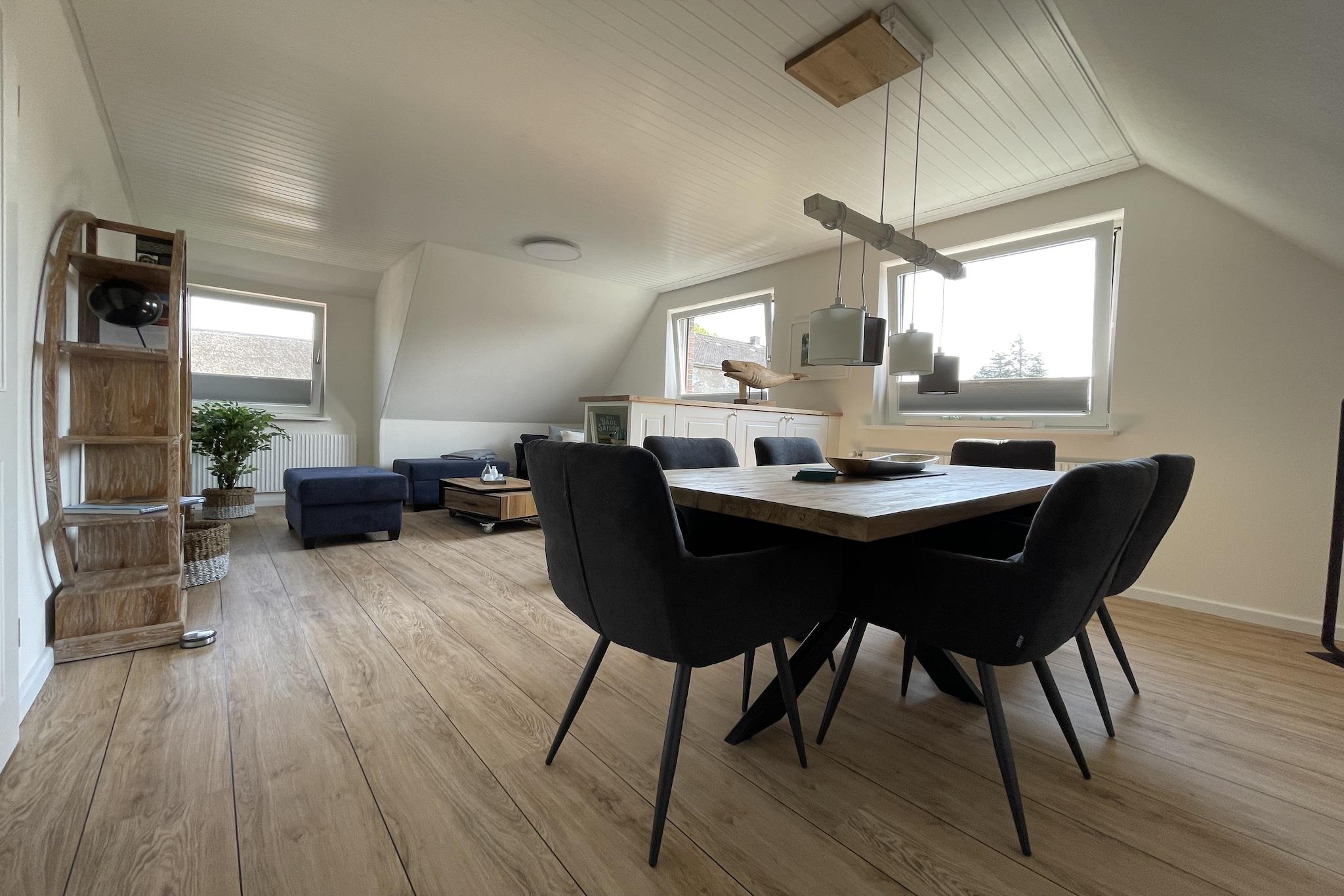 Idyllisk beliggende, komfortabelt indrettet og renoveret lejlighed. Det velholdte, rummelige lejlighedshus ligger mellem landbyerne Boldixum og Wrixum. Centrum af Wyk og stranden er også inden for gåafstand. Bybilledet i Wyk auf Föhr er præget af hyggelige frisiske huse og snoede gader. Utallige restauranter og caféer med havudsigt giver mulighed for at nyde den vidunderlige ro på en ø. Den lille havneby med sin kilometerlange sandstrand og parker med eksotiske planter er et perfekt sted at flygte fra hverdagen og virkelig lade op. Aktiviteter i nærheden: Den frisiske nordsøluft ved Föhr vækker indre styrke og giver dig lyst til at træne. Tendensen her går mod aktiv ferieplanlægning: På Föhr kan sportsentusiaster vælge mellem mange forskellige sports- og aktivitetsprogrammer. Ikke egnet til personer med nedsat mobilitet