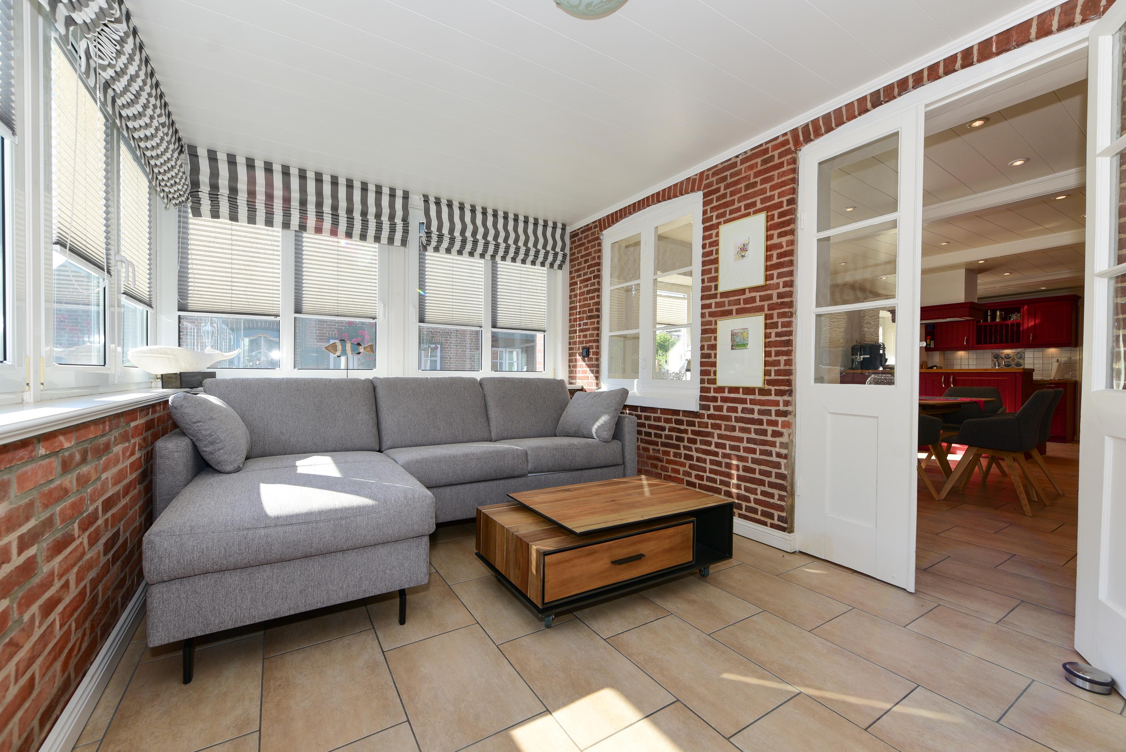 Genießen Sie entspannte Stunden im sonnigen Wintergarten, welcher mit einer weiteren gemütlichen Sofaecke zum Verweilen einlädt und sich bei Bedarf in einen komfortablen Schlafplatz verwandeln lässt. Dank der Plissees lässt sich der Raum ganz nach Ihren Wünschen abdunkeln.