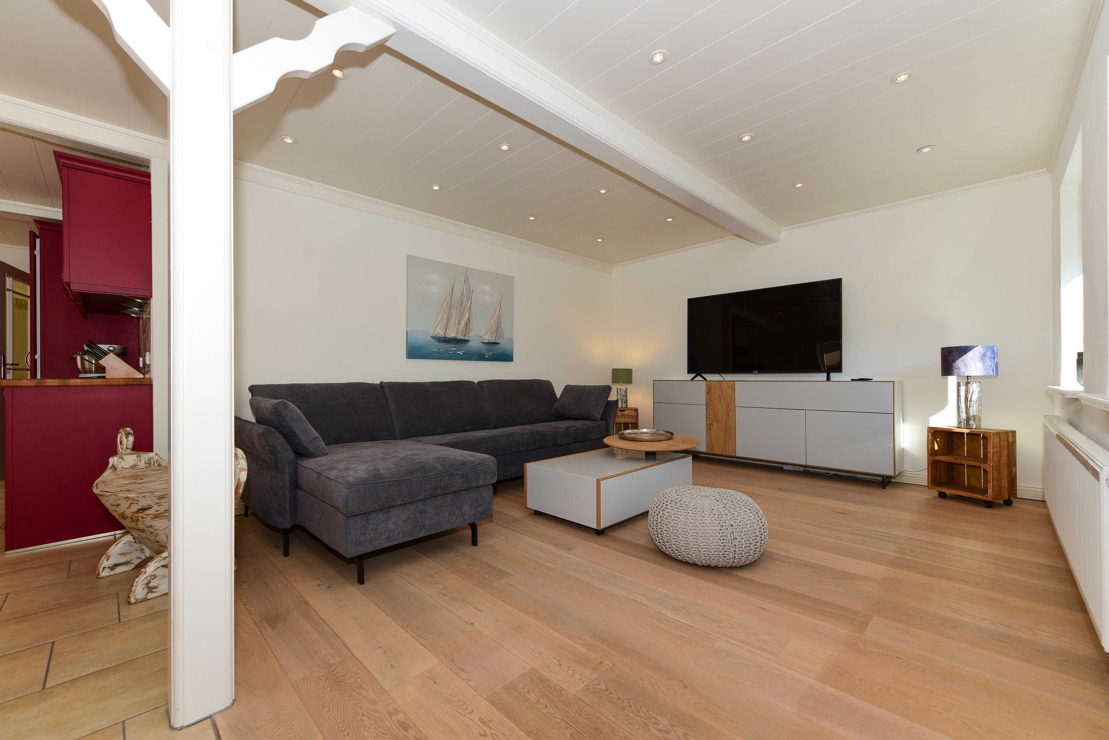 Der helle und einladende Wohnbereich bietet mit seiner gemütlichen Sofaecke und einem großen Flachbildschirm den perfekten Ort zum Abschalten und Wohlfühlen. Am stilvollen Esstisch genießen Sie gemeinsame Mahlzeiten oder vergnügte Spieleabende in geselliger Runde. Die angrenzende, offene und voll ausgestattete Küche erfüllt all Ihre Wünsche und rundet den Wohnbereich perfekt ab - hier können Sie sich kulinarisch austoben und das Zusammensein genießen.