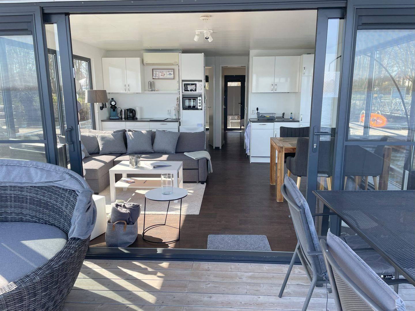 Die Xanten 4 ist schiffig-modern gestaltet und eingerichtet. Es verfügt über einen großzügigen Wohnbereich mit integrierter, gut-ausgestatteter Küchenzeile und direktem Zugang zur 15 qm großen Terrasse am Bug, sowie zwei Schlafzimmern.