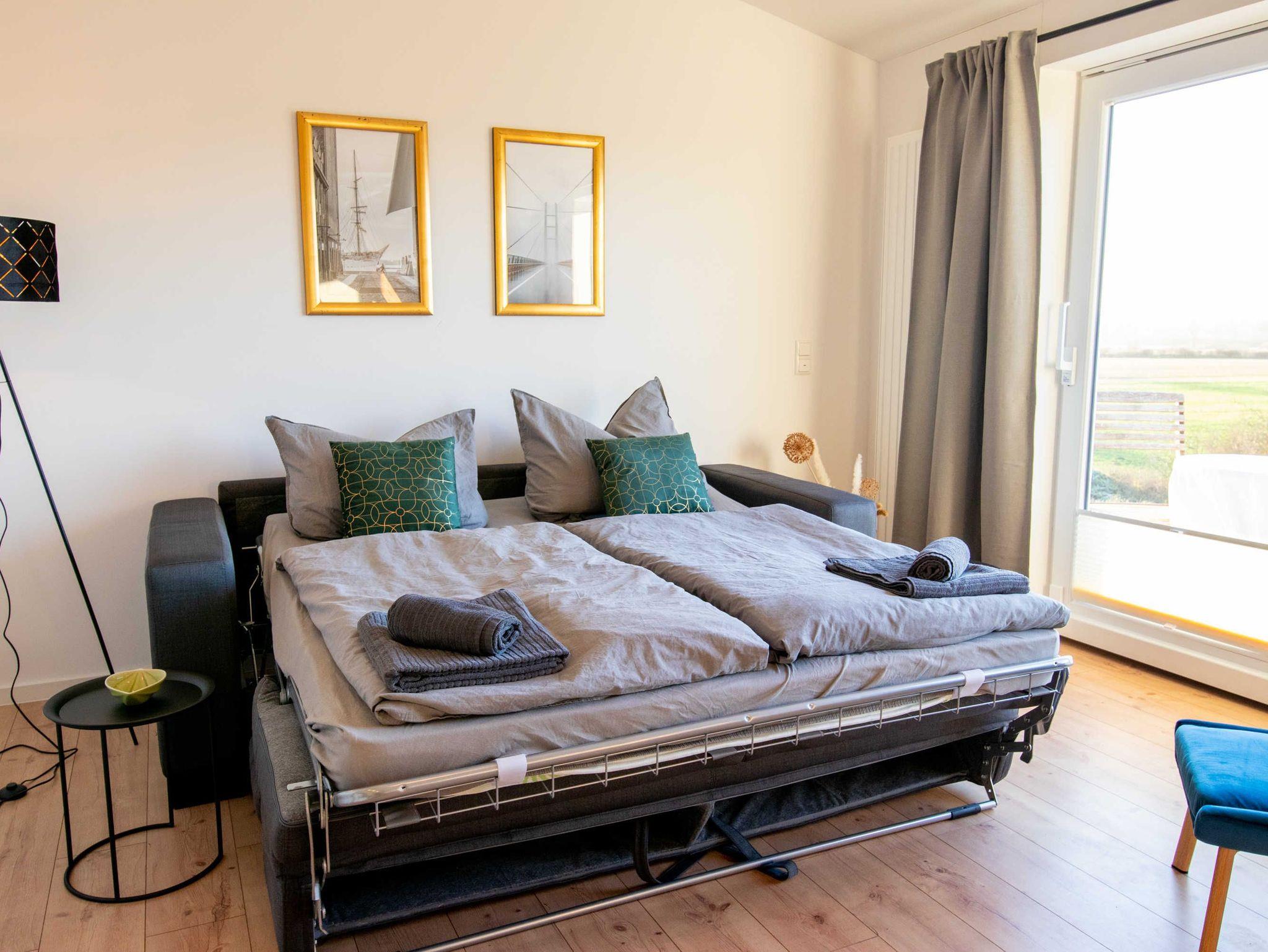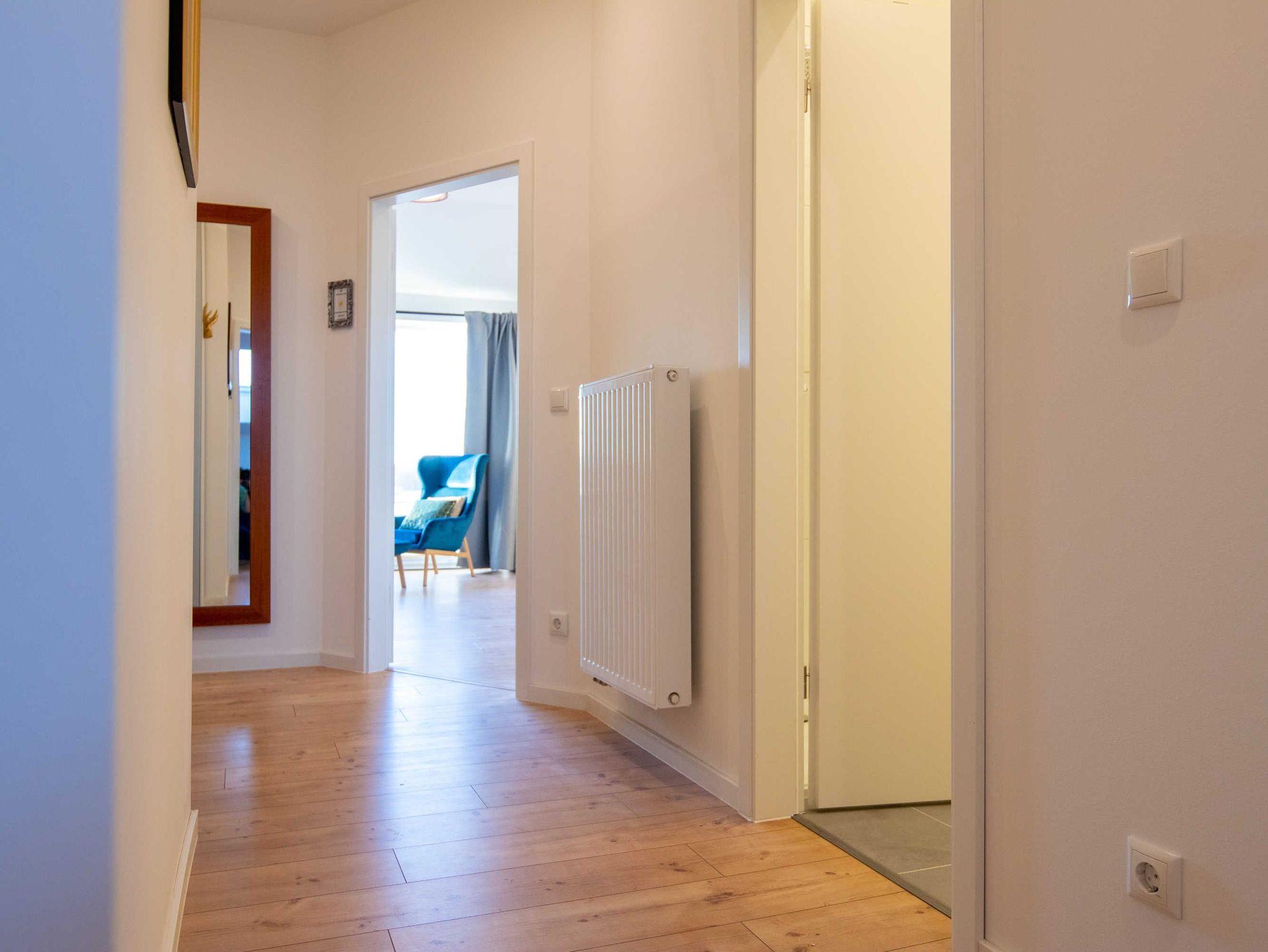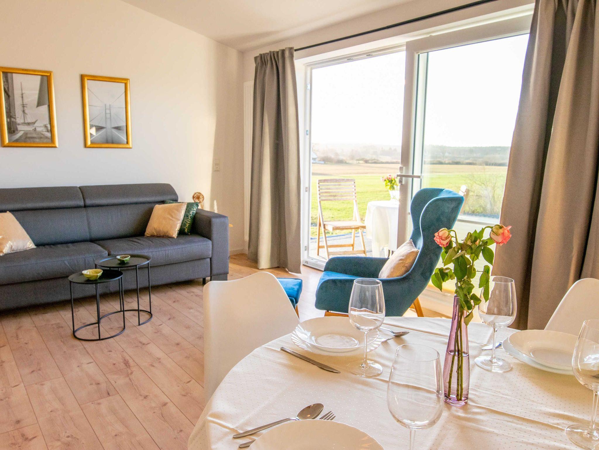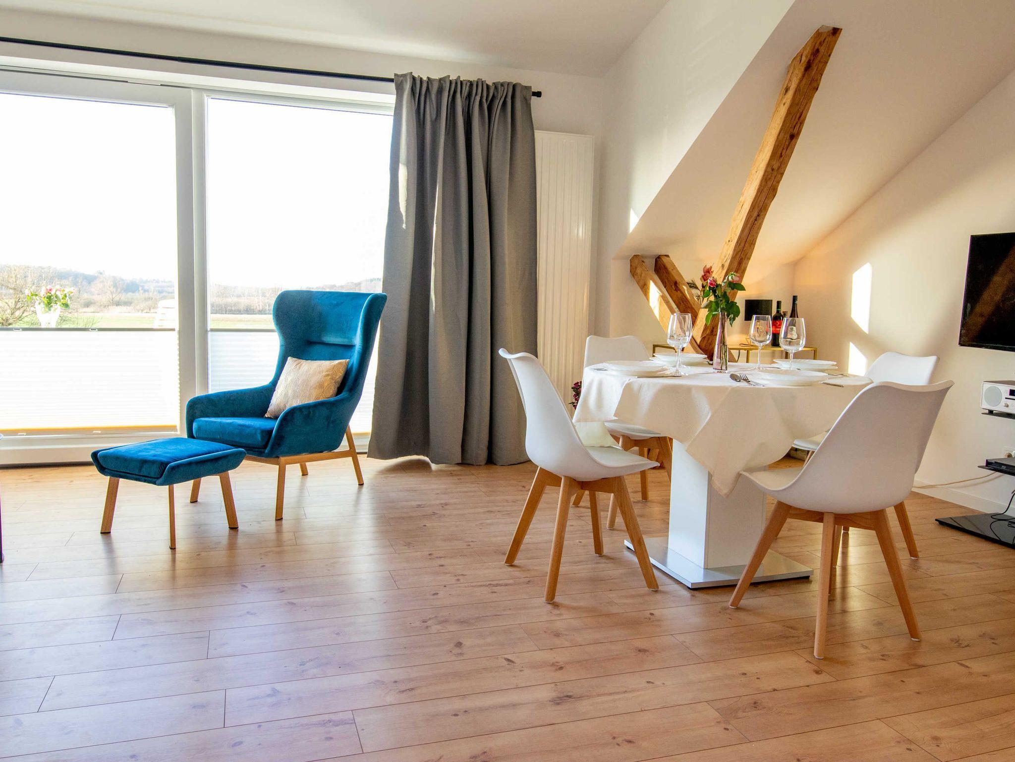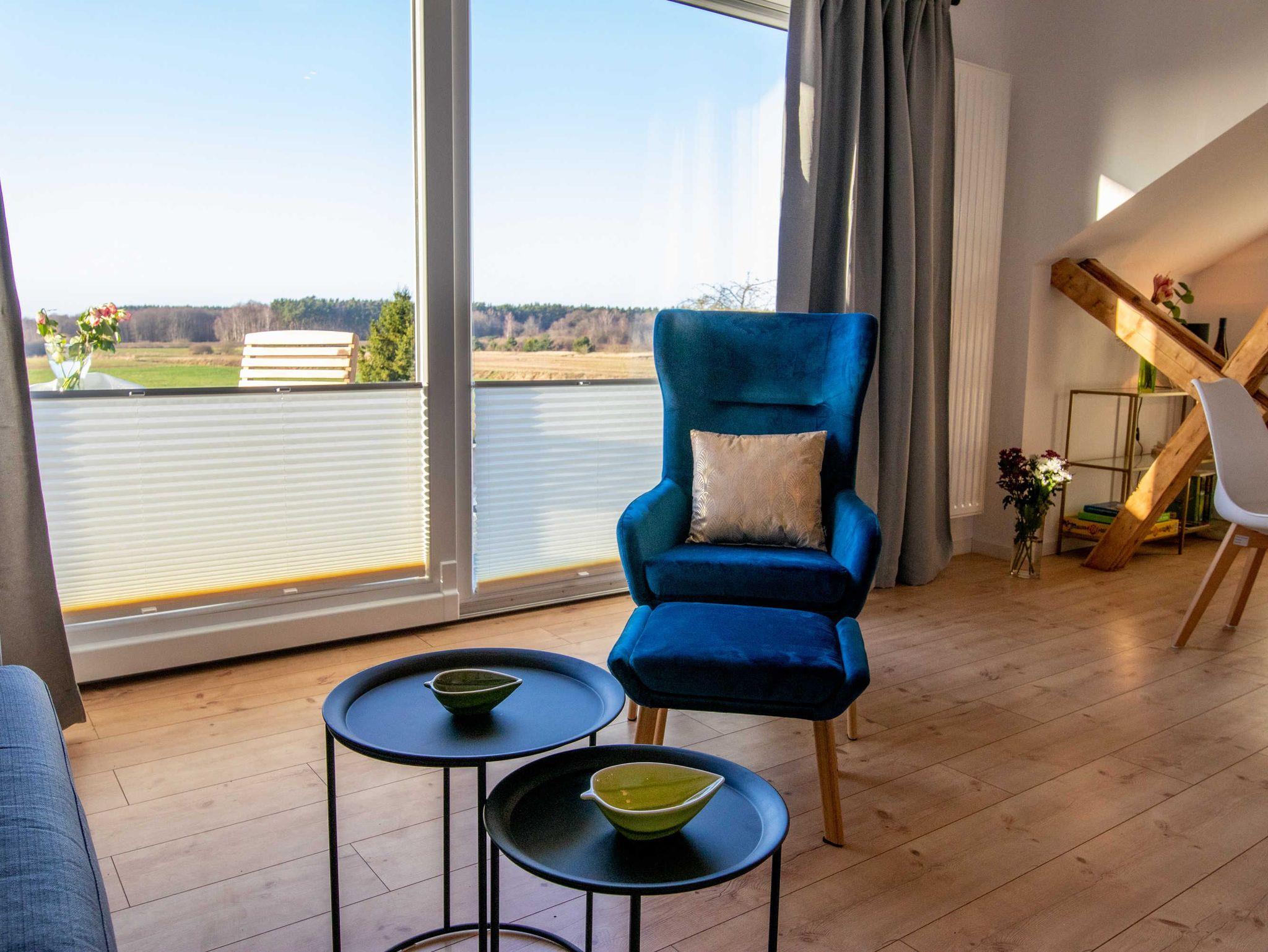 Die Ferienwohnung Panoramablick 1 im Landhaus Wiesenblick in Zarrendorf ist für bis zu 6 Personen geeignet und verfügt auf 75m² Fläche über 1 Wohnbereich mit offener Küche und Essbereich, sowie einer Schlafcouch die zu einem vollwertigen Bett (160x200) umgebaut werden kann. Die zwei separaten Schlafzimmer beinhalten jeweils ein Doppelbett (160x200) und eine Garderobe. Das Badezimmer ist abschließbar und mit einer ebenerdigen Dusche, Badewanne, Waschbecken und WC ausgestattet. Die Küche enthält neben einer Spüle, Geschirrspüler, Backofen, Cerankochfeld, Kühlschrank mit Gefrierfach, Wasserkocher, Toaster, Tassimo Kaffeemaschine auch Küchenhelfer, Besteck und Geschirr. Der Balkon kann zum Sonnen und Entspannen genutzt werden, auf der Terrasse im Erdgeschoss steht ein Grill bereit.