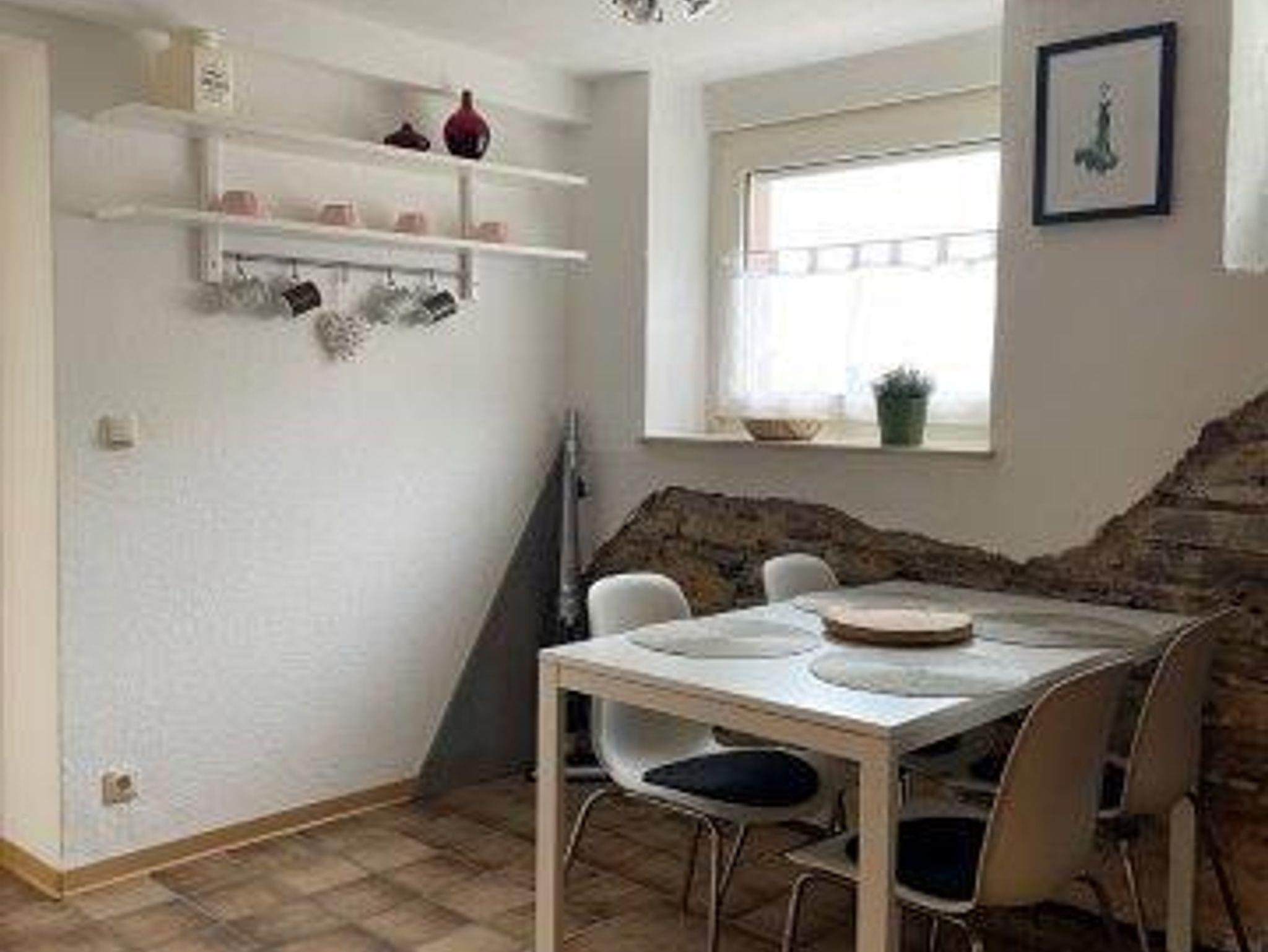 In der Küche haben wir die ursprüngliche, Mosel typische Schieferwand wieder mühevoll freigelegt - ein absolutes Highlight der Wohnung. Von der Küche aus habt ihr einen tollen Ausblick in die weitläufigen Weinberge.