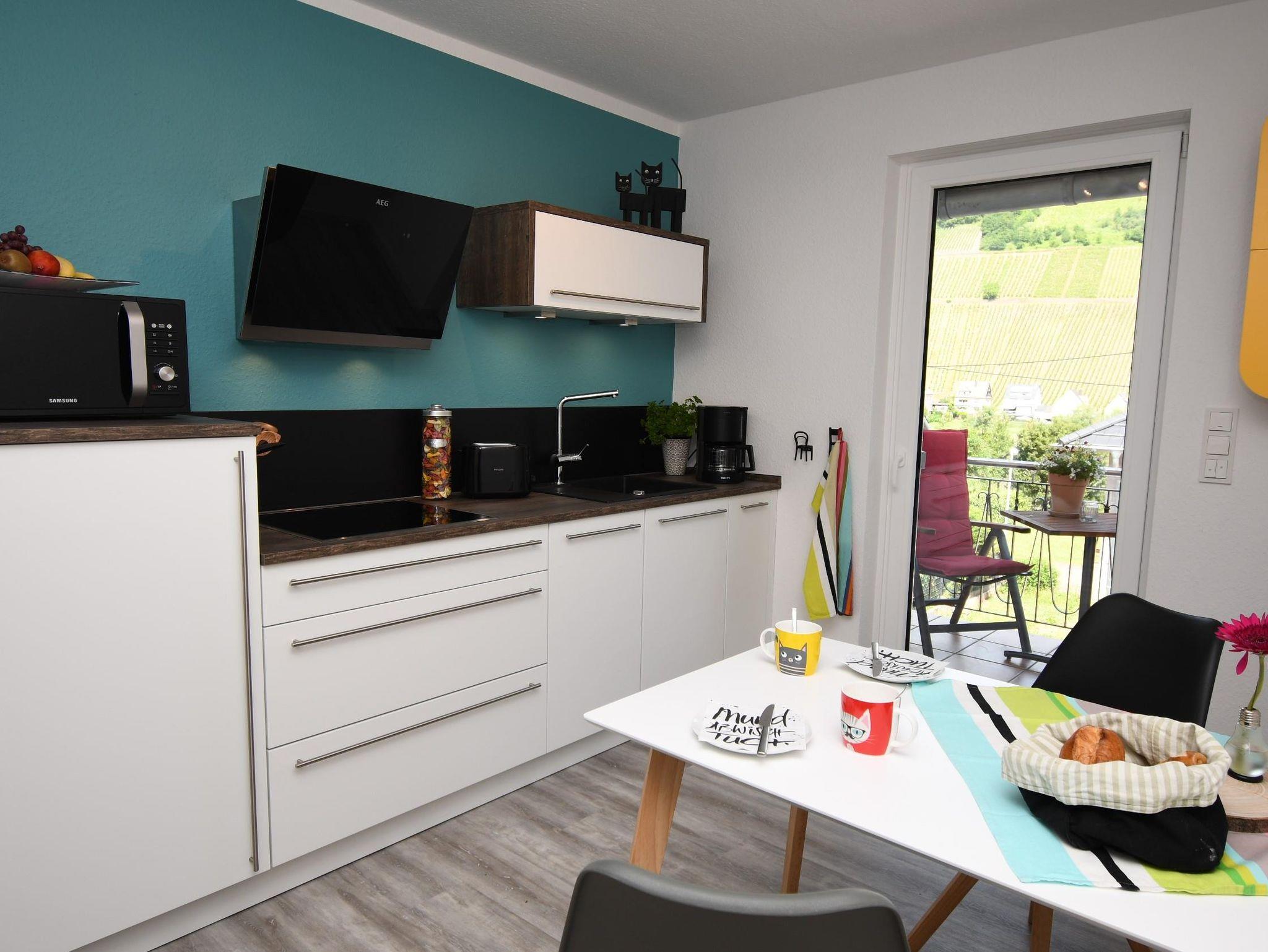 ... eine sehr gut ausgestattete und moderne Markenküche mit Esstisch und Zugang zu einem kleinen Balkon mit Moselblick. Hier können Sie morgens in der Sonne frühstücken oder abends bei einem leckeren Glas Wein den Tag ausklingen lassen.