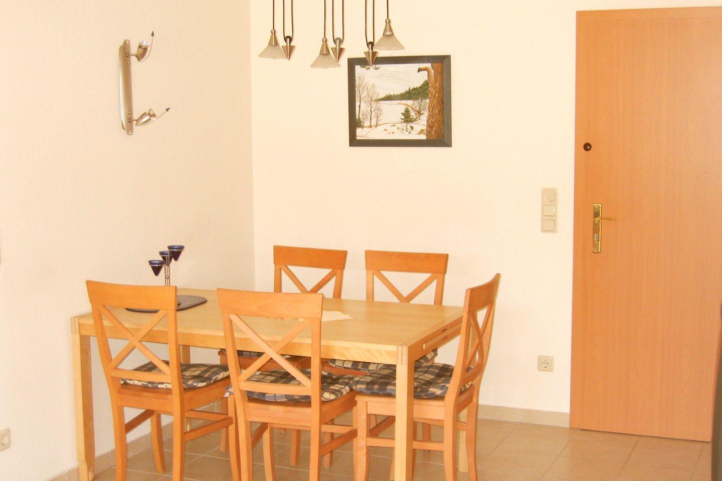 Die Wohnung bietet zwei geschmackvoll eingerichtete Schlafzimmer, die Platz für bis zu fünf Personen bieten. Ein modernes Badezimmer mit Dusche sorgt für maximalen Komfort. Der offene Wohnbereich mit integrierter Küche ist der perfekte Ort, um gemeinsame Mahlzeiten zuzubereiten und die Zeit miteinander zu genießen. Die Küche ist voll ausgestattet und lässt keine Wünsche offen: Cerankochfeld, Backofen, Geschirrspüler, Kühlschrank mit Gefrierbereich, Mikrowelle und Kaffeemaschine stehen für Ihre kulinarischen Aktivitäten bereit. Der angrenzende Essbereich lädt zum Verweilen oder zu geselligen Runden ein.