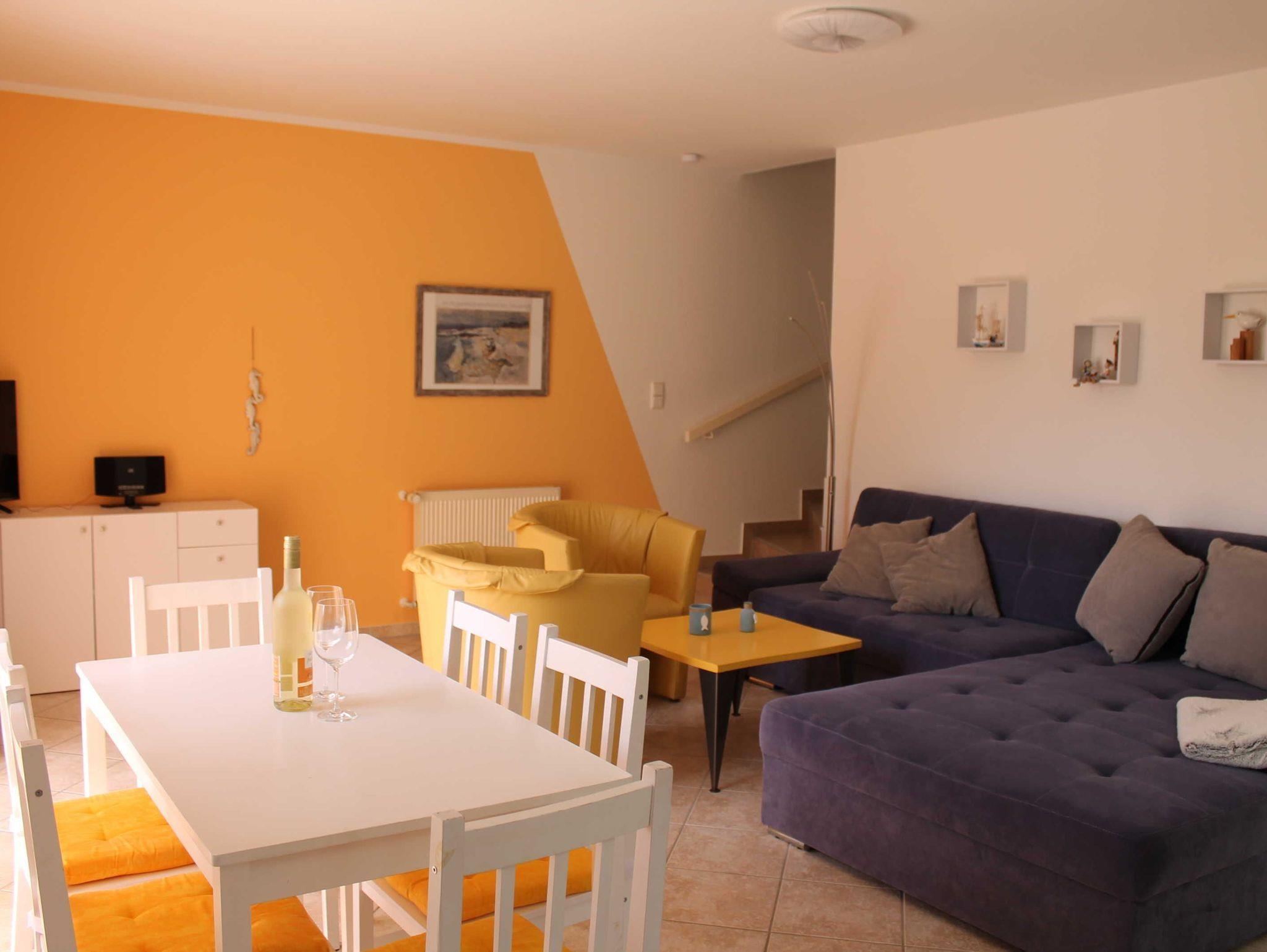 Im großen hellen Wohnzimmer mit Couchgarnitur (2 Aufbettungen möglich), Fernseher, Radio, DVD- und CD-Player ist auch eine Küche und ein Essbereich integriert. Die Küche ist komplett eingerichtet mit Herd, Backofen, Kühlschrank, Geschirrspüler, Mikrowelle, Kaffeemaschine, Toaster und Wasserkocher. Geschirr und Gläser sind ausreichend vorhanden.