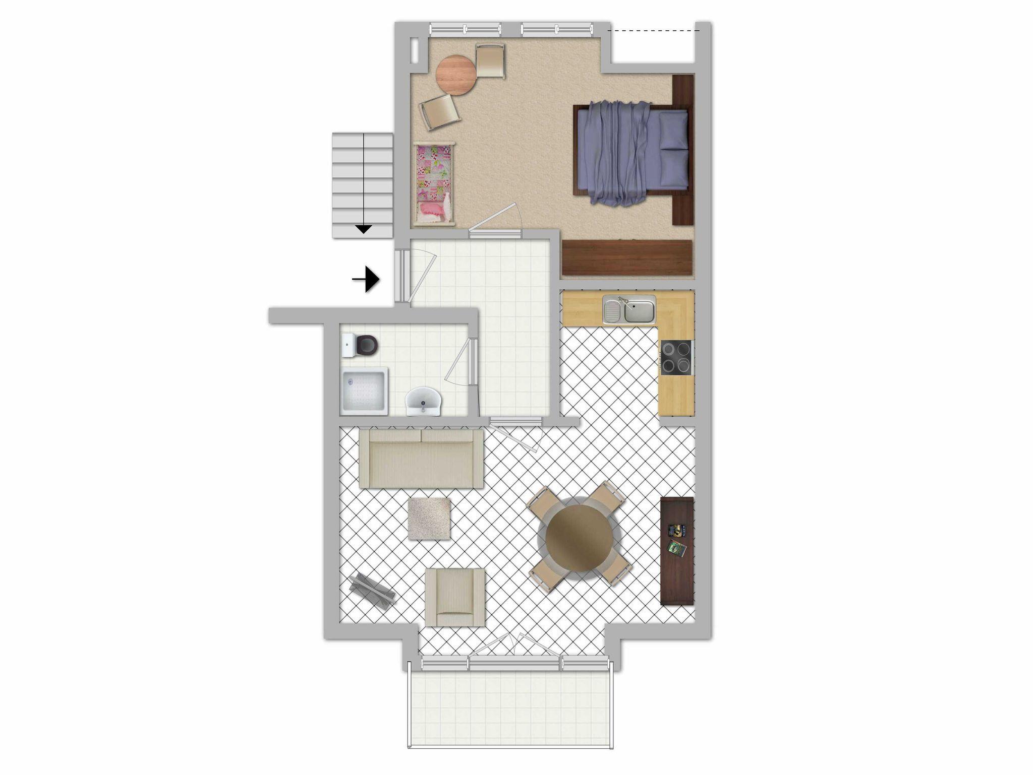 Ferienwohnung für 2-4 Personen inkl. Kleinkind (ca. 44 m²) im Dachgeschoss mit Wohn- und Esszimmer, Schlafzimmer, offener Küche, Bad und Balkon.