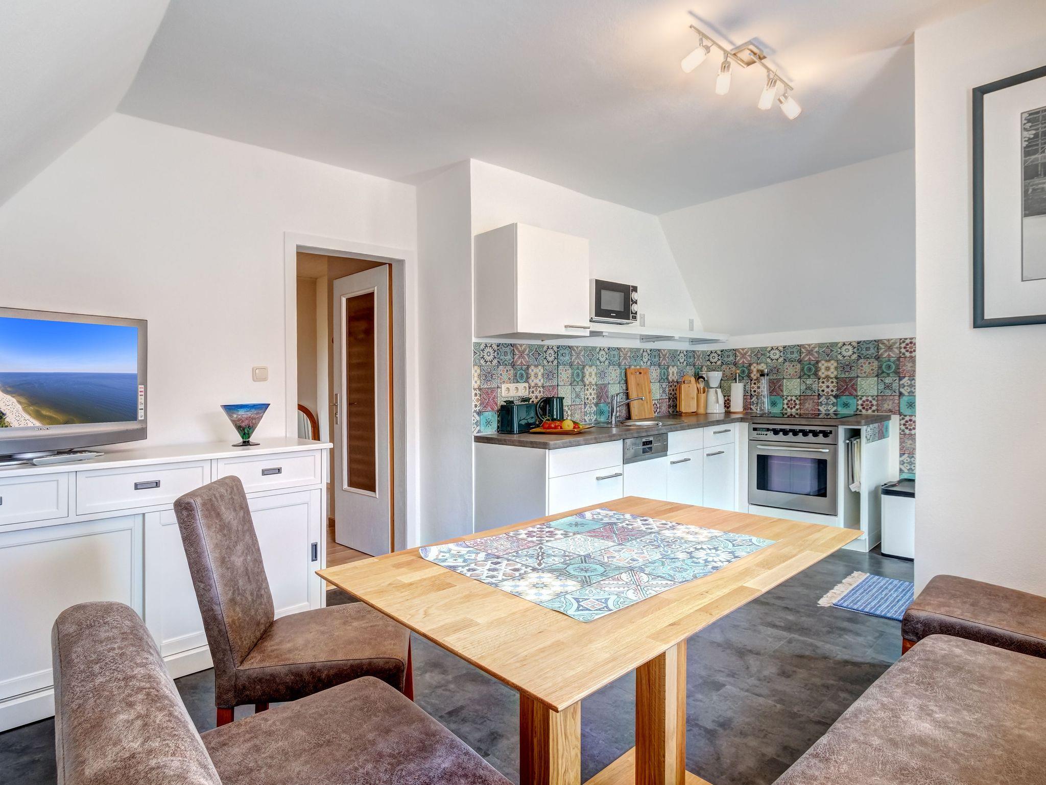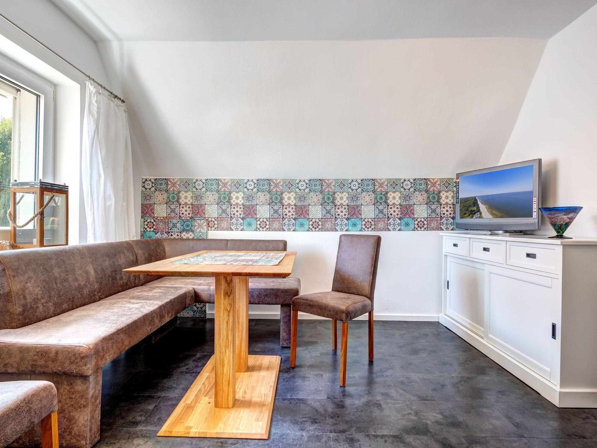 Fewo 2 (OG): 50 m², mit eigener Terrasse, Wohnküche, Esstisch, TV und einem modernen Schlafzimmer. Ein weiteres Zimmer kann als Wohn- oder Schlafzimmer genutzt werden. Beide Zimmer bieten einen traumhaften Blick auf das Achterwasser.