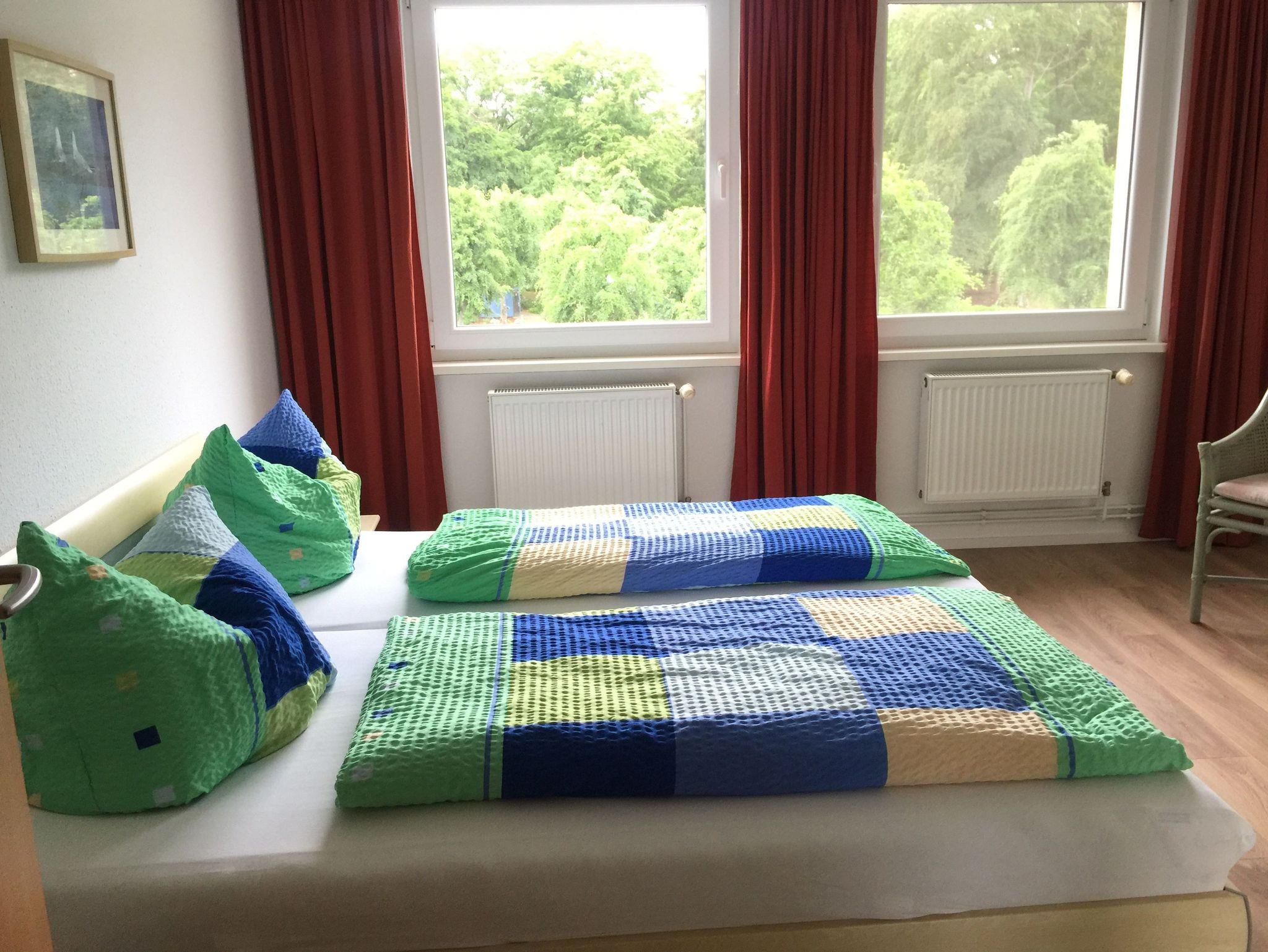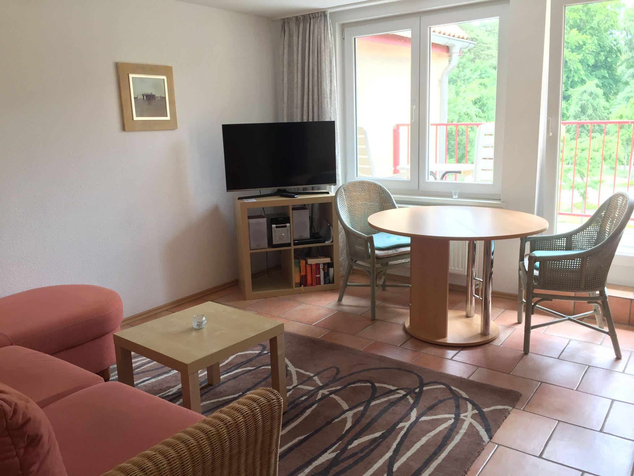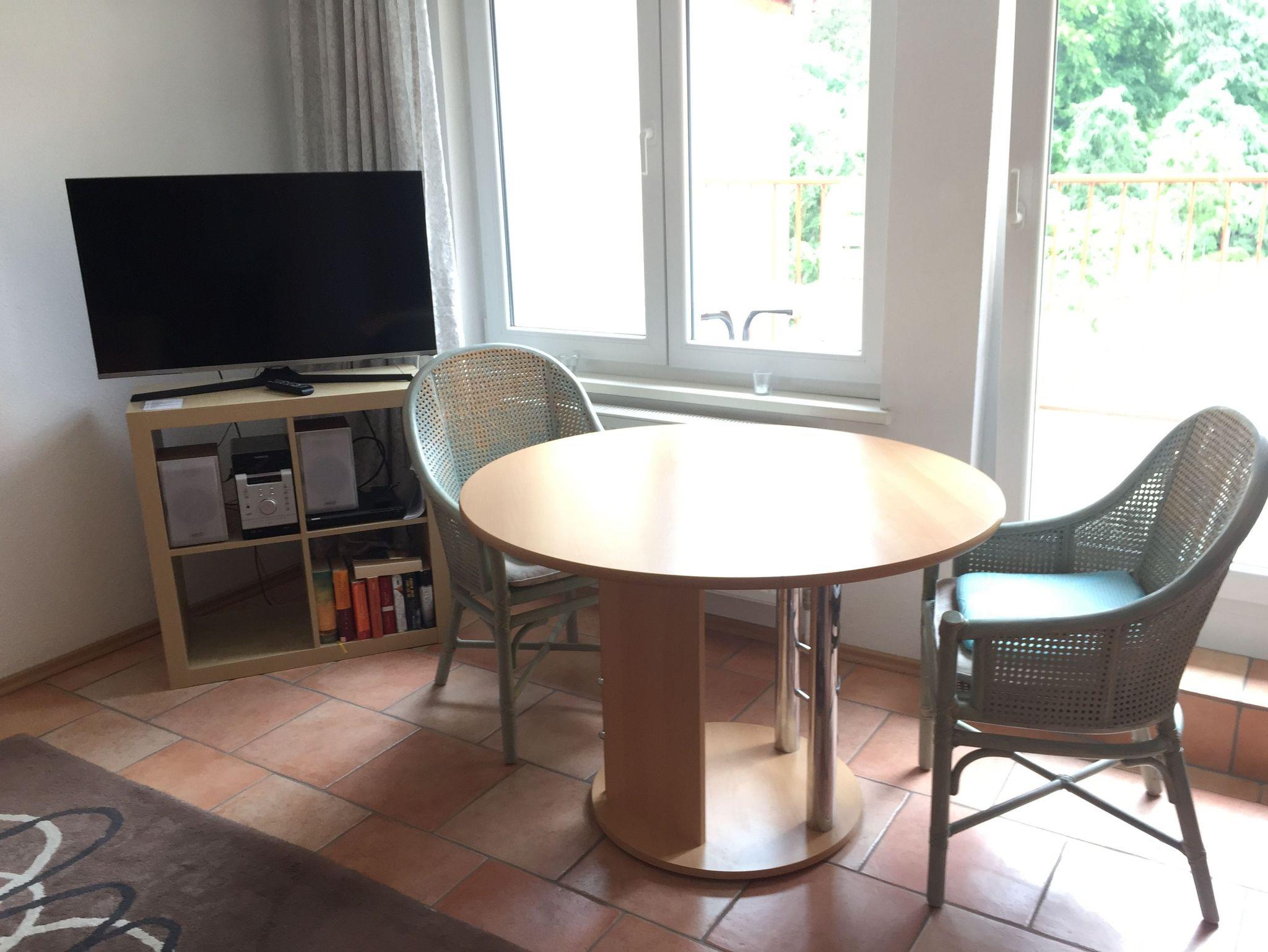 Die Wohnung Möve befindet sich in der 2. Etage in der Mitte. Sie hat einen Balkon mit einem wunderschönen Blick auf den Wald. Die Wohnung besteht aus einem Schlafzimmer, Wohnzimmer und einer Küche. Ausgestattet ist die Küche mit einem Herd mit Backofen Geschirrspüler, Kaffeemaschine, Wasserkocher und Toaster. Sowohl vom Schlafzimmer als auch vom Wohnzimmer haben Sie einen schönen Blick ins Grüne.