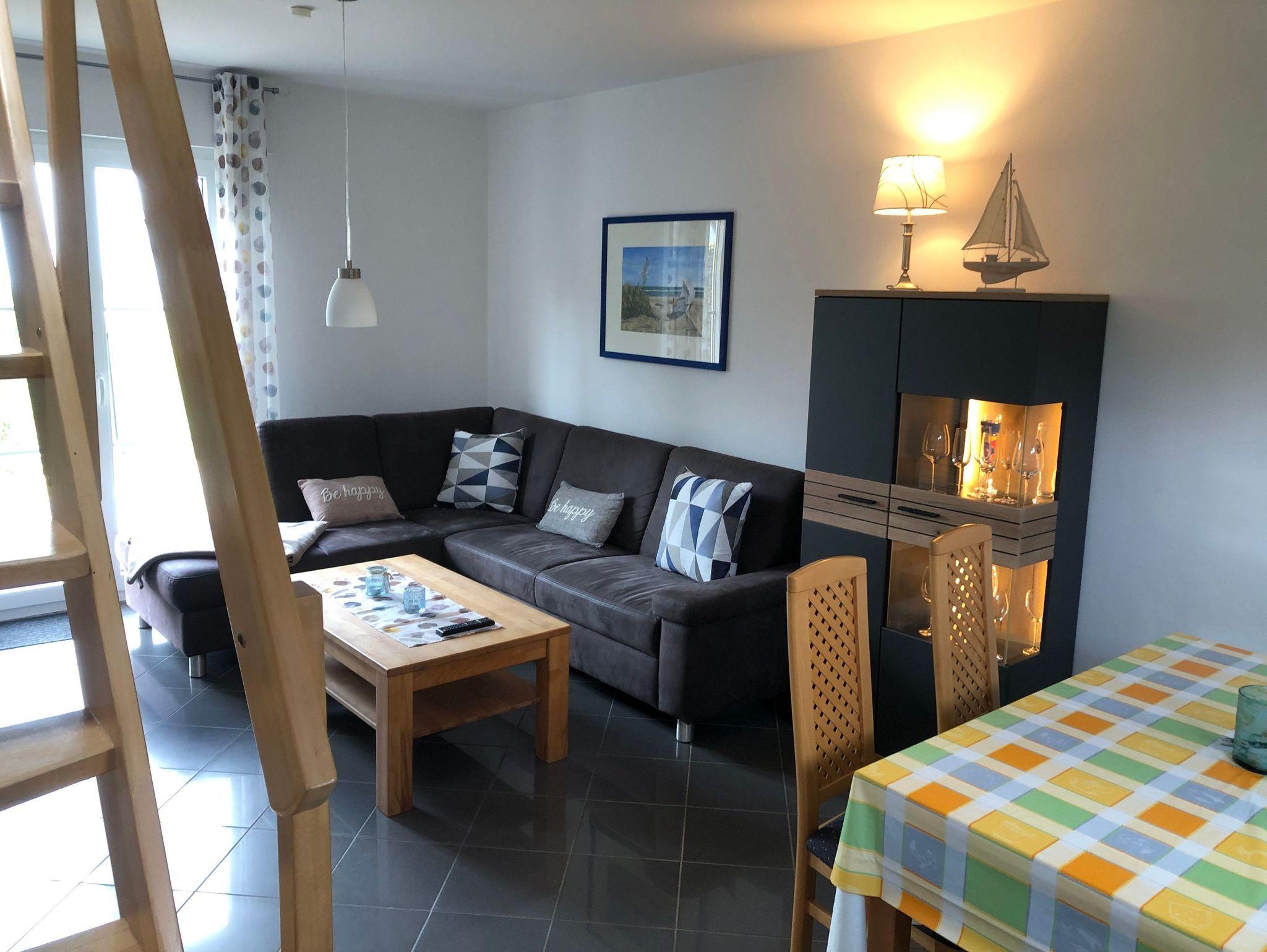 Die helle, großzügige und exklusiv eingerichtete 3-Raum-Maisonette-Ferienwohnung befindet sich im Nebenhaus, ist ca. 55 m² groß und für 4 Personen geeignet. Das Wohnzimmer befindet sich im Erdgeschoss und ist mit einer gemütlichen Eckcouch, Flachbildfernseher und Musikanlage ausgestattet. Die separate Einbauküche verfügt über ein Cerankochfeld, erhöhter Backofen, Kaffeemaschine, Kühlschrank mit Gefrierfach, Toaster und Wasserkocher.