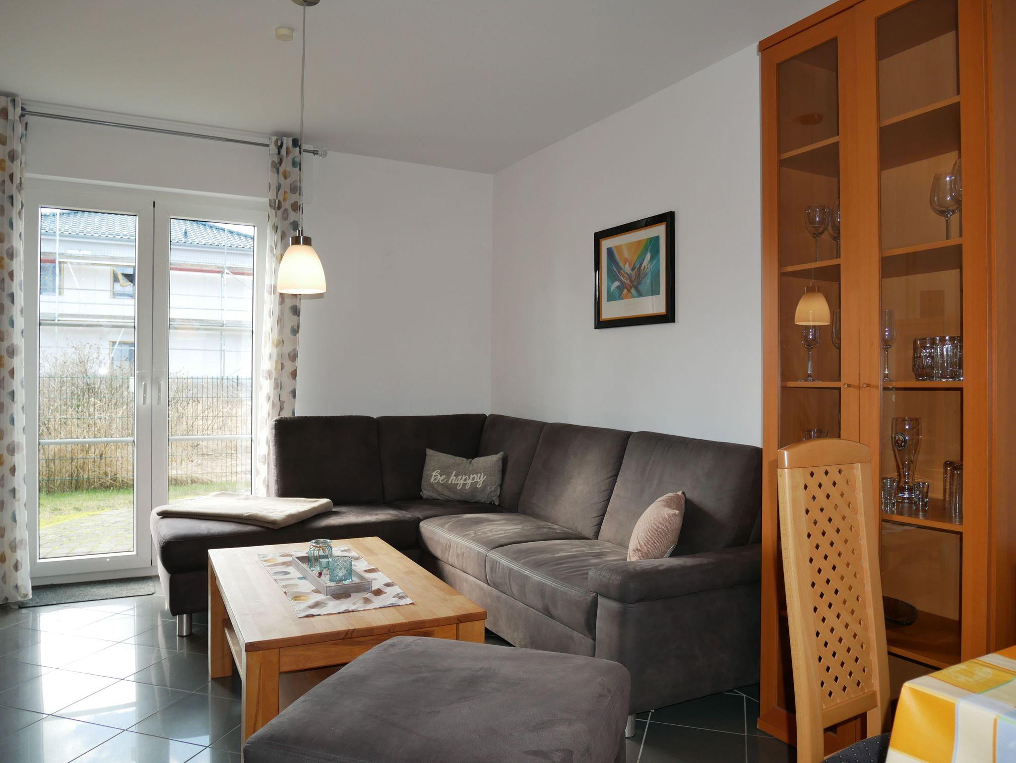 Vor der Wohnung befindet sich eine geschlossene Terrasse, die zur Südseite ausgerichtet ist. Auf der Terrasse befinden sich Gartenmöbel, Sonnenschirm und ein Grill. Die Terrasse erreichen Sie vom Wohnzimmer aus.