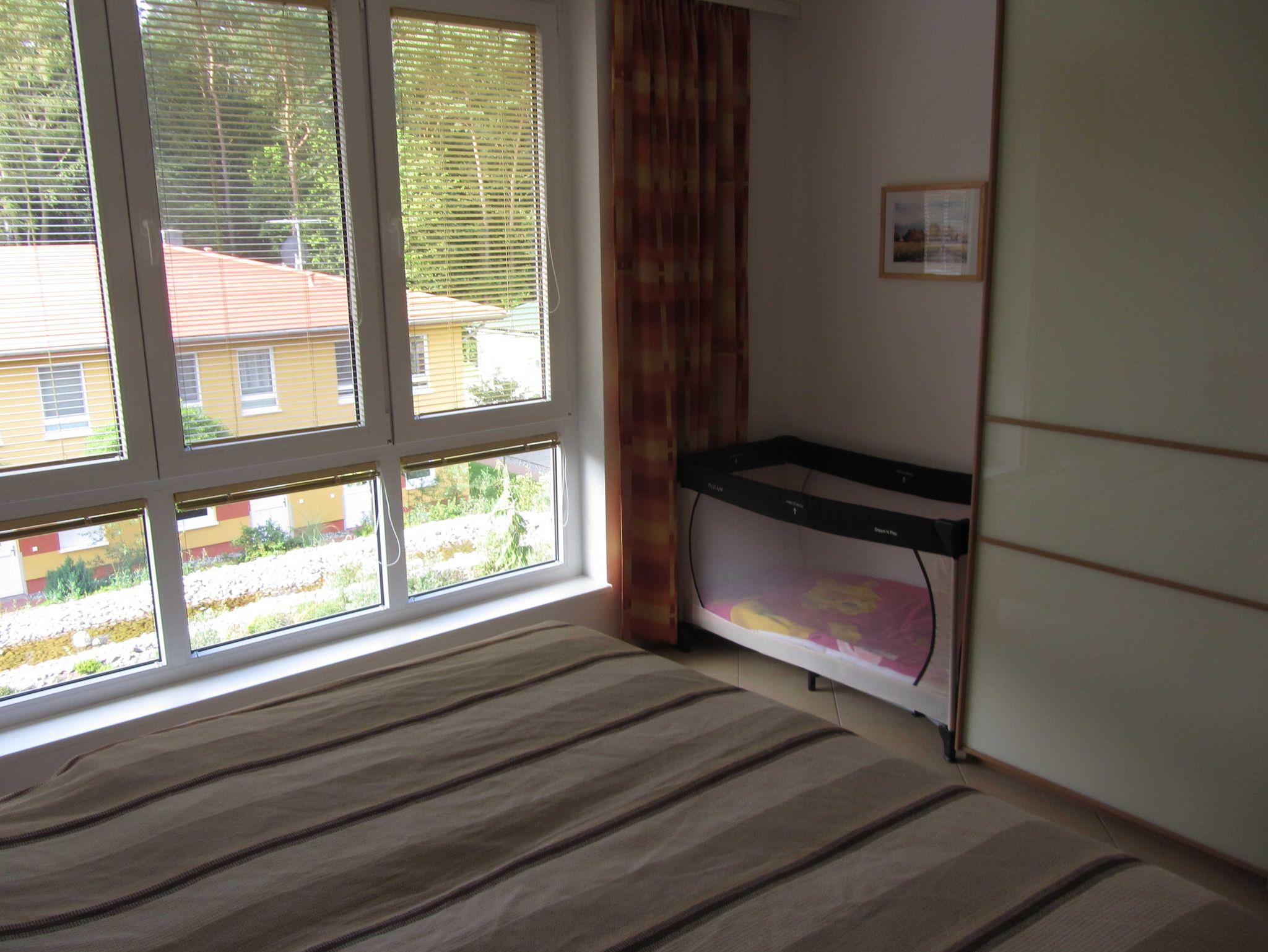 - 1 Schlafzimmer im 2.OG, Komfortdoppelbett 180 x 200 cm mit 4-Jahreszeiten-Steppbetten und Kinderreisebett mit Bettdecke