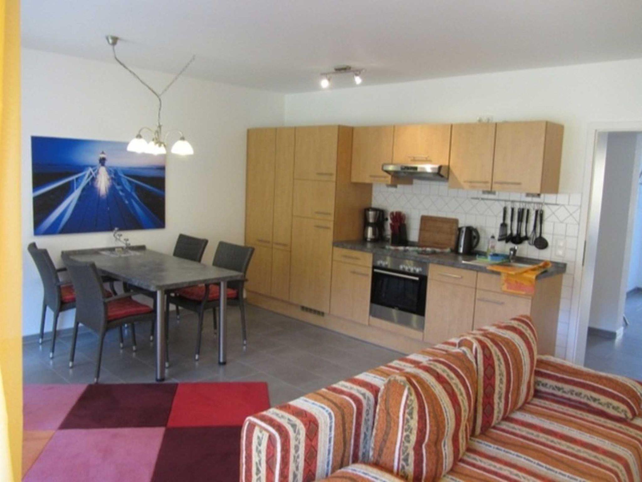 Die Wohnung ist eingerichtet mit Fußbodenheizung, TV, CD-Player, Radio, Terrassenmöbel, Einbauküche mit Ceranherd, Backofen, Kühlschrank, Tiefkühlfach, Gläser, Besteck und Geschirr.