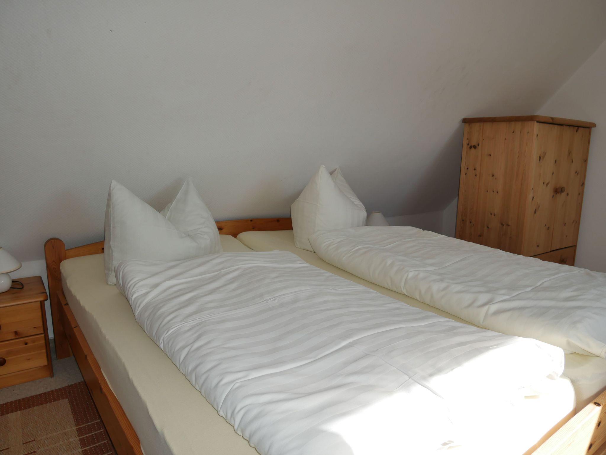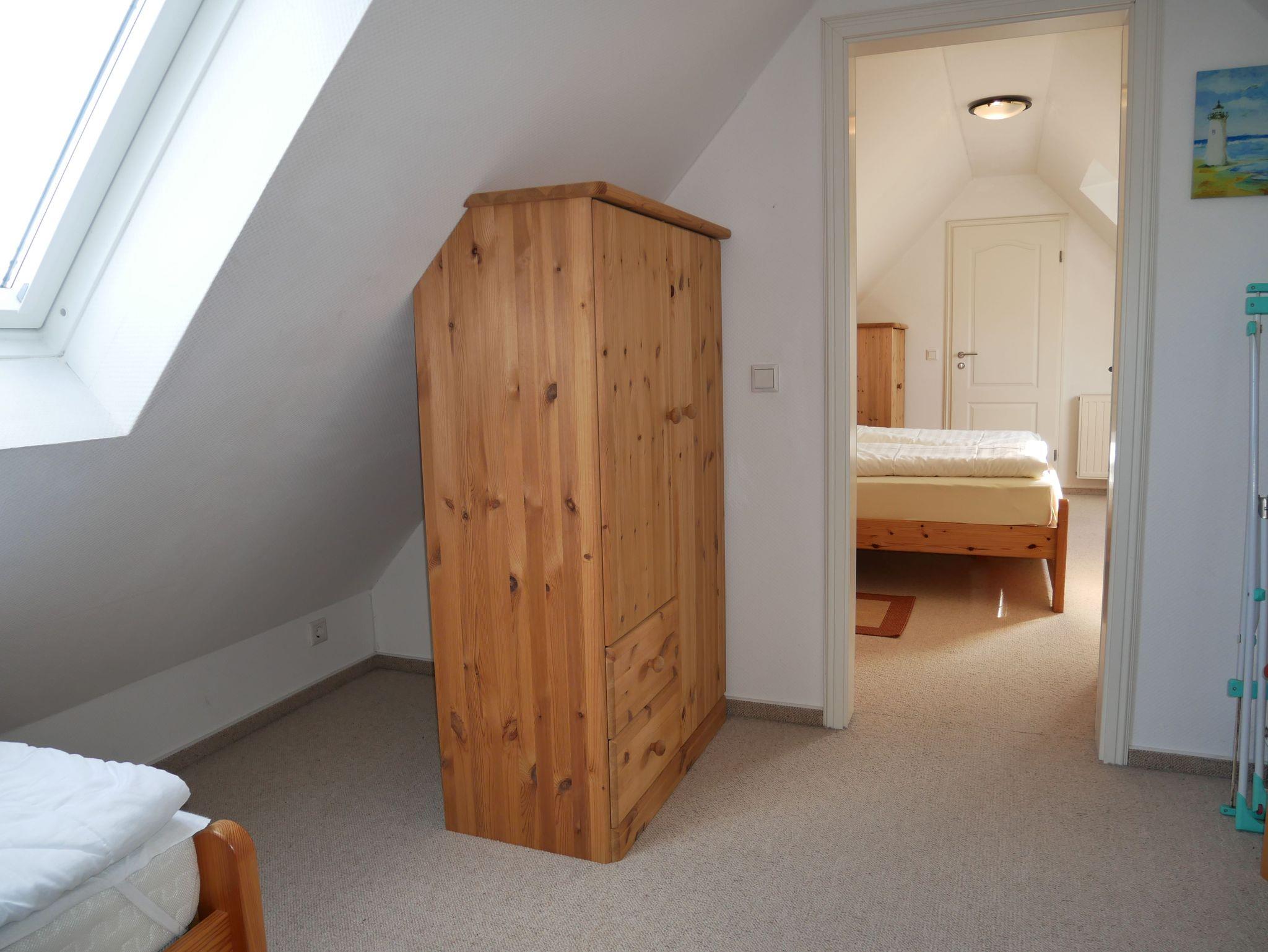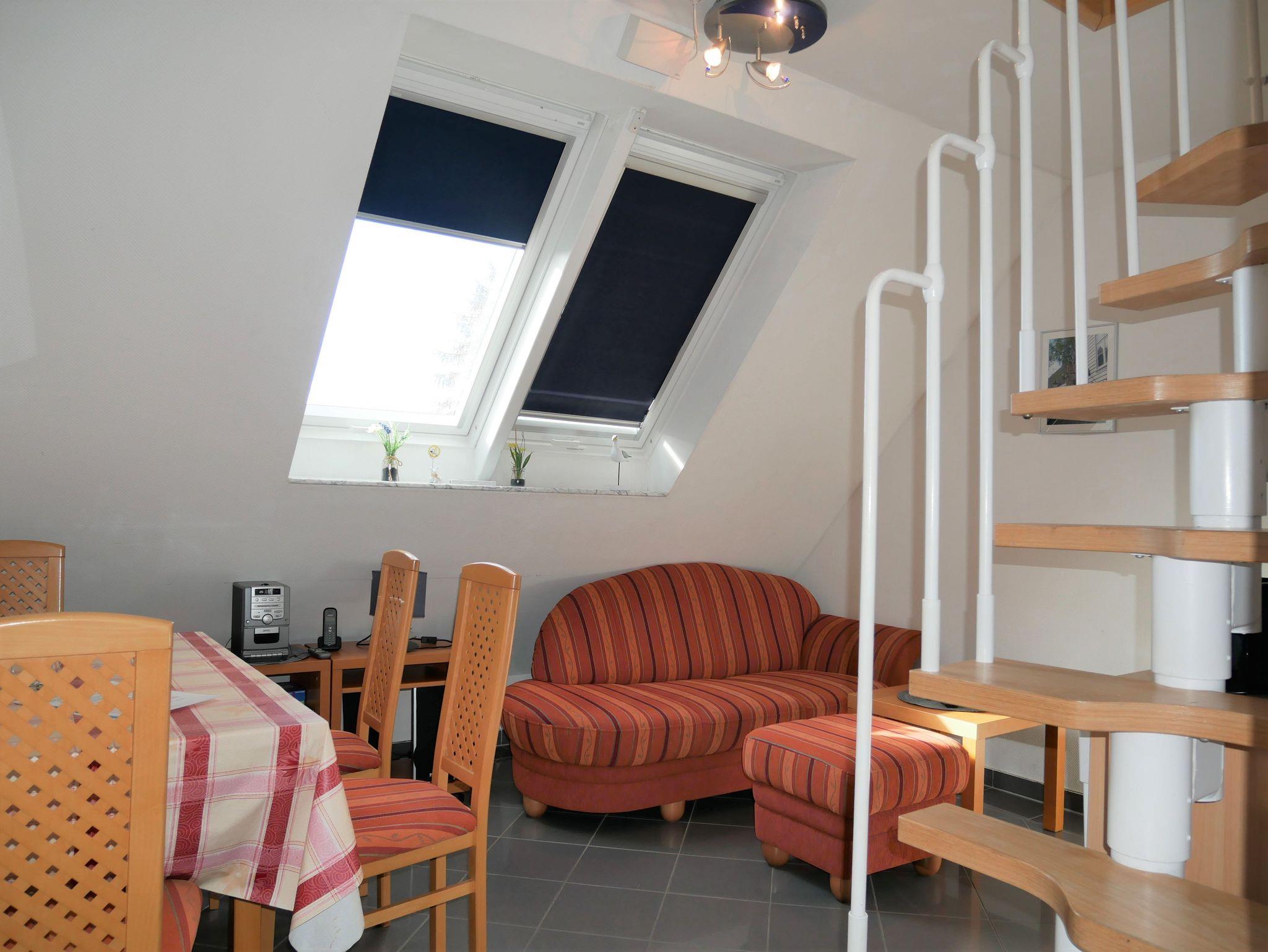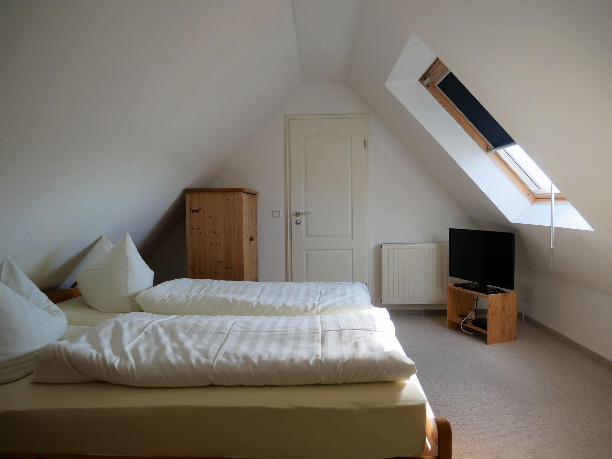 Die helle und exklusiv eingerichtete 3-Raum- Obergeschoss Wohnung ist (ca. 45 m²) groß ist für 4 Personen ausgelegt. Sie besteht aus einer kompletten Küchenzeile mit Cerankochfeld, Geschirrspüler und Kühlschrank, Bad mit Dusche und WC. Fliesenfußboden sowie Fußbodenheizung im Bad, die zwei Schlafzimmer sind im Spitzboden und über eine Raumspartreppe erreichbar. (Achtung, es handelt sich um eine steile Treppe und ist für Gäste mit Geh- oder Sehbehinderung, sowie für kleine Kinder nicht geeignet). Die Erstausttatung Bettwäsche sowie 1 Geschirrtuch sind inklusive. Handtücher können entweder mitgebracht oder vor Ort gegen Gebühr ausgeliehen werden (bitte beim Schlüsselverwalter Herrn Käding vorbestellen). Den Gästen steht kostenfrei ein DSL-Internetzugang über W-LAN zur Nutzung zur Verfügung (keine zugesicherte Eigenschaft falls mal der Router ausfällt) . Haustiere sind nicht erlaubt, Nichtraucherwohnung.