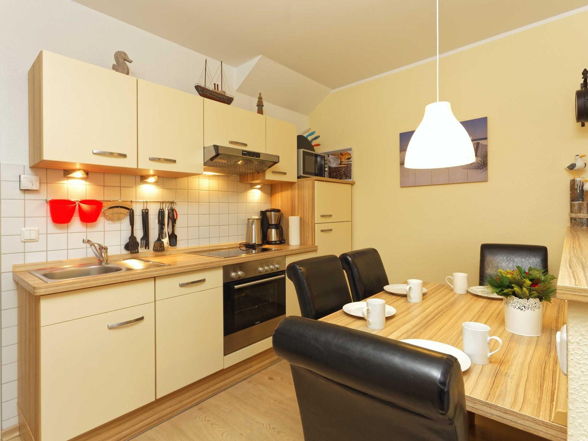 Die Ferienwohnung erstreckt sich über 2 Etagen, ist sehr geräumig und komfortabel eingerichtet. Im 1. OG befindet sich das Wohnzimmer mit Flachbild TV, Radio, einem schönen Balkon, ein Bad mit Dusche, WC und einem Fön. Die offene Einbauküche ist mit einem Ceranherd, Backofen, Kühlschrank, Tiefkühlfach, Gläser, Besteck und Geschirr ausgestattet. Die obere Etage mit zwei Schlafzimmern und einem zweiten Bad mit Dusche und WC, bietet einen weiteren Balkon, auf dem man gemütlich den Tag ausklingen lassen kann. In der kalten Jahreszeit sorgt eine Fußbodenheizung für behagliche Wärme.