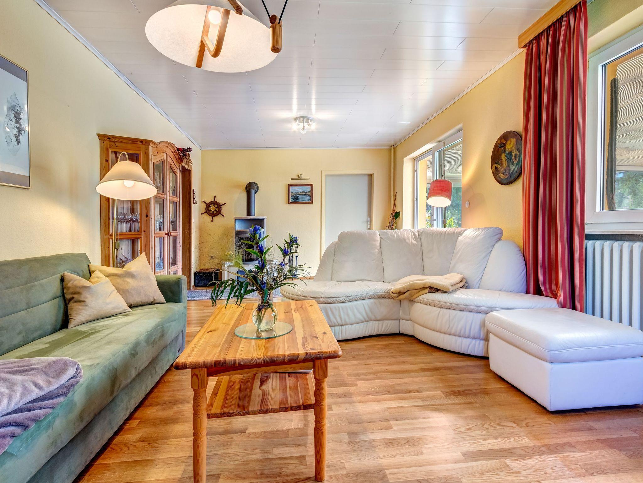 Im Wohnzimmer erwartet Sie eine einladende Sitzecke mit Couch und Sesseln, einem Fernseher und DVD-Player, perfekt für entspannte Abende vor dem Kaminofen.