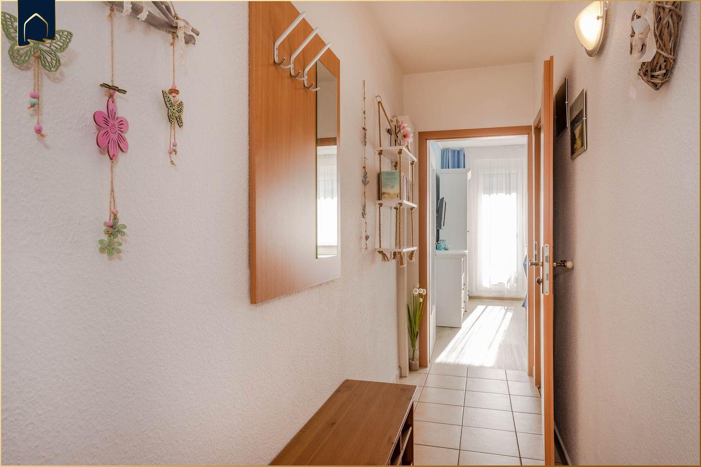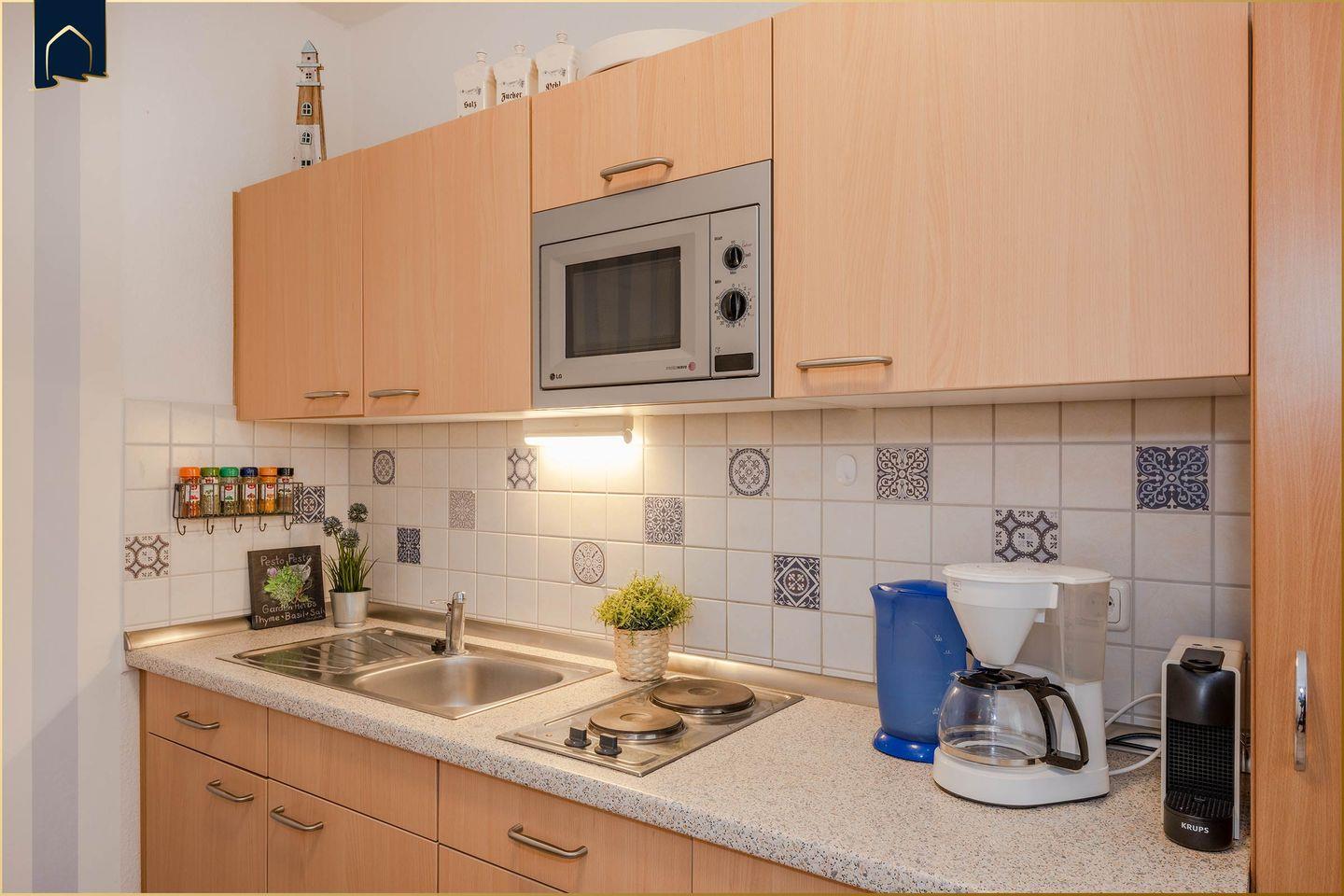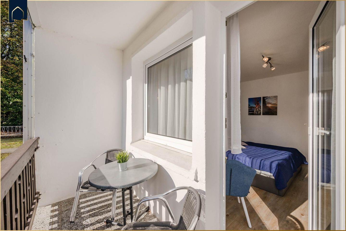 Mit 32?m² ist die Wohnung kompakt, aber geschickt geschnitten und hochwertig ausgestattet. Sie verfügt über ein separates Schlafzimmer mit gemütlichem Bett, ein modernes Duschbad sowie einen offenen Wohn-Essbereich mit voll ausgestatteter Küche. Hier findest du alles, was du für deinen Aufenthalt brauchst: Kühlschrank mit Gefrierfach, Mikrowelle, Toaster, Kaffeemaschine und Wasserkocher. Der angrenzende Balkon mit Blick ins Grüne lädt zu einem Frühstück im Freien oder einem Glas Wein am Abend ein.