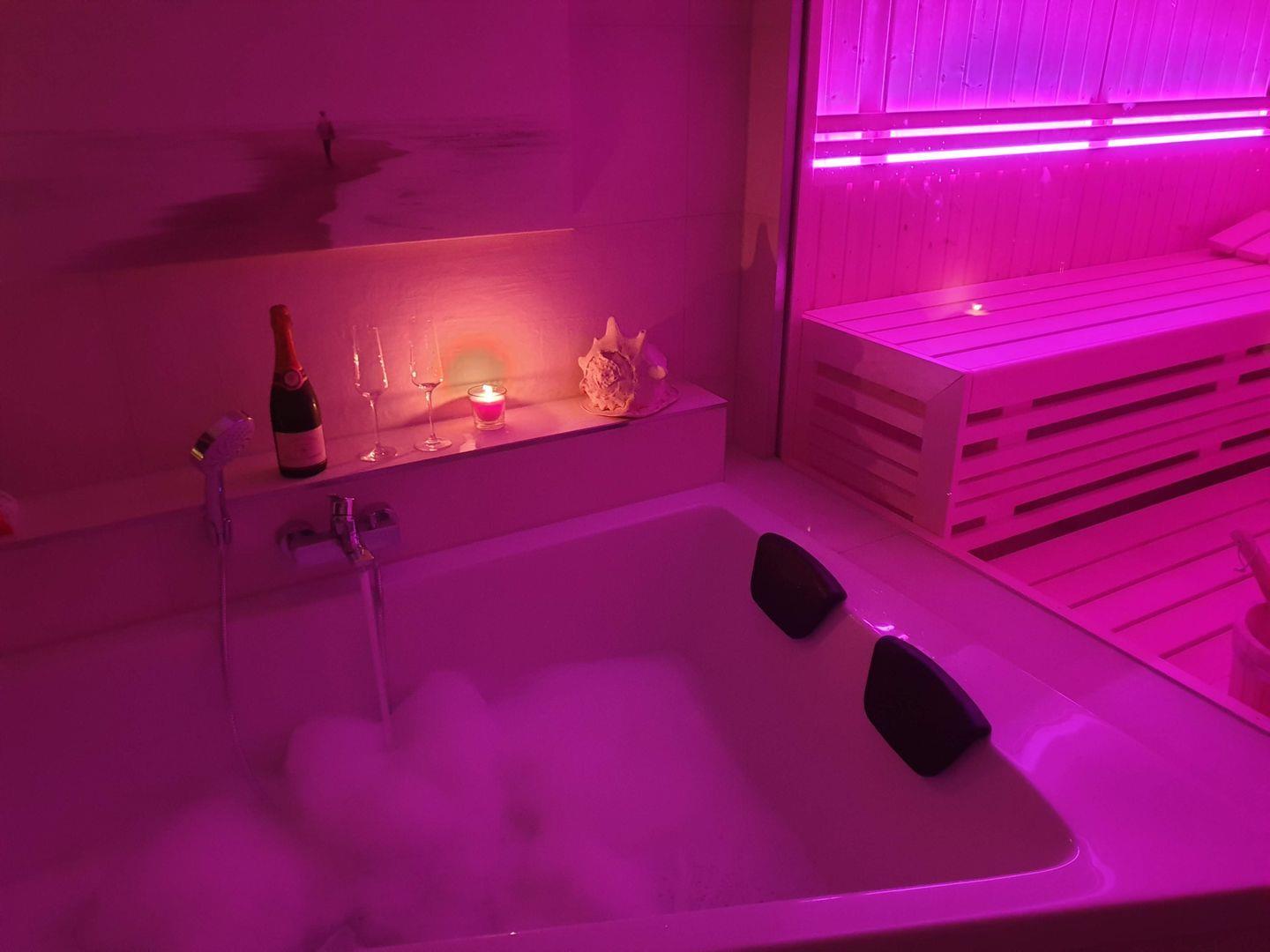 - 1 Wellnessbad: Sauna, Doppelbadewanne, Walk-in-Dusche, Zugang zur blickgeschützten Terrasse (nach dem Saunagang sehr angenehm)
