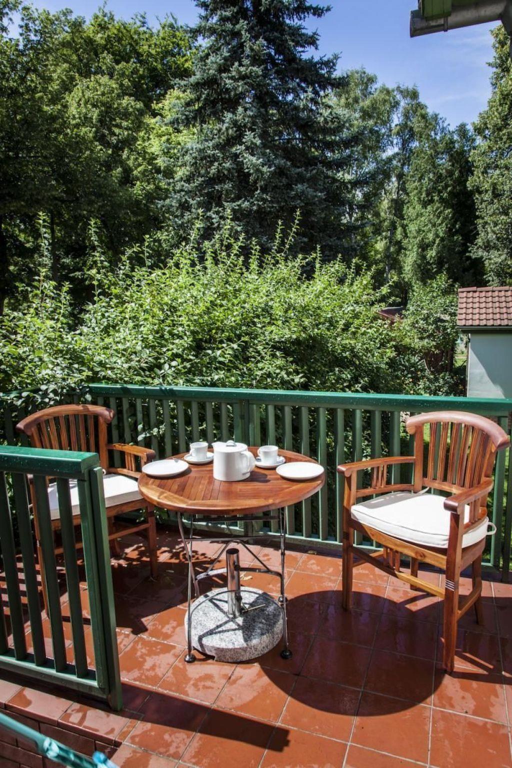 The small terrace with its comfortable chairs and a larger table offers the opportunity for a cosy breakfast or a romantic dinner.