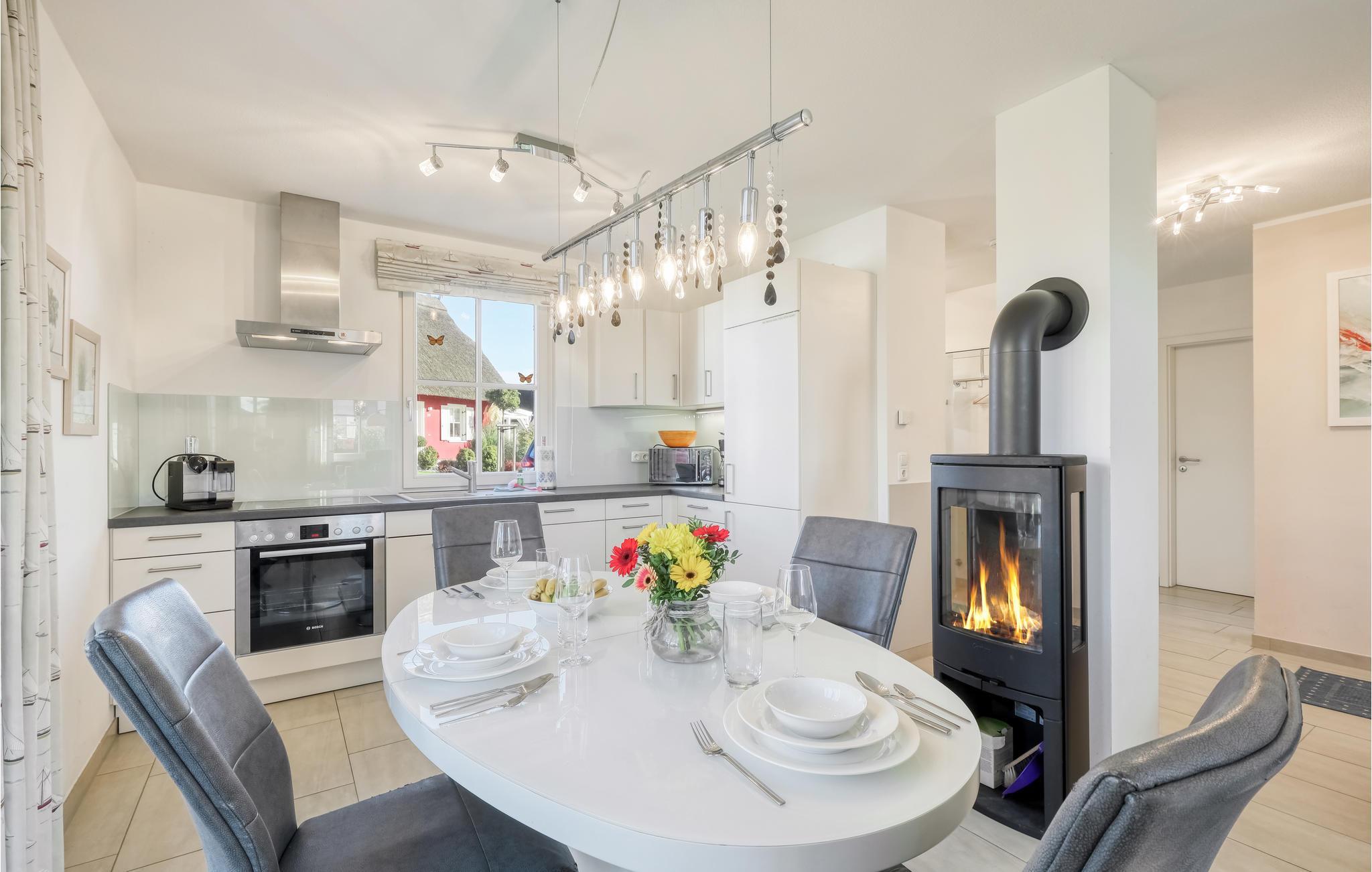 I denne stråtækte halvdel af et dobbelthus er der saunarum med brusebad og stillezone, der indbyder til afslapning. Den smukt indrettede stue der er åben mod køkken rummer også en brændeovn. Fra stuen er der udgang til den overdækkede terrasse der er vindbeskyttet og med en gasgrill. Her er sågar også en af de typiske strandkurve, så I kan nyde dagens sidste solstråler i absolut fred for vinden. Jeres cykler kan stilles i et skur, hvor der også er trækvogn, som I frit kan bruge.