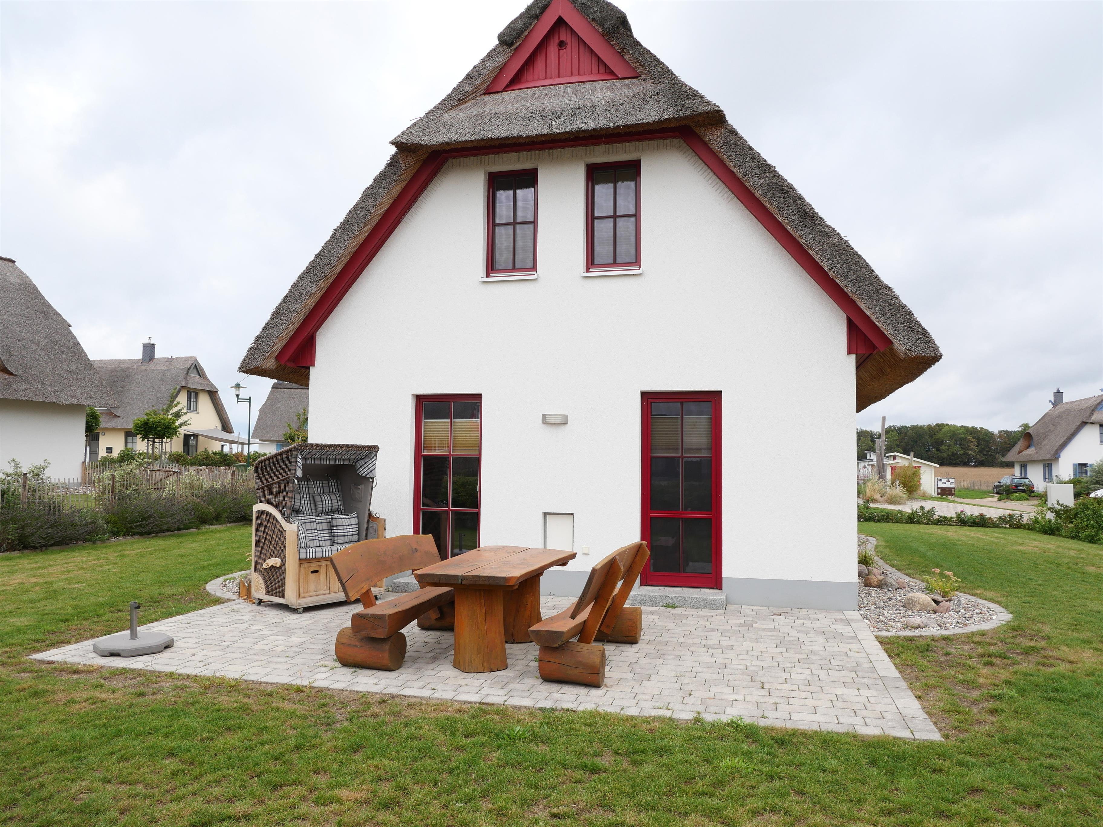 Das Haus ist freistehend am Wegesrand und gesellt sich mit weiteren Reethäusern in umliegende Felder des Erholungsortes Zierow.