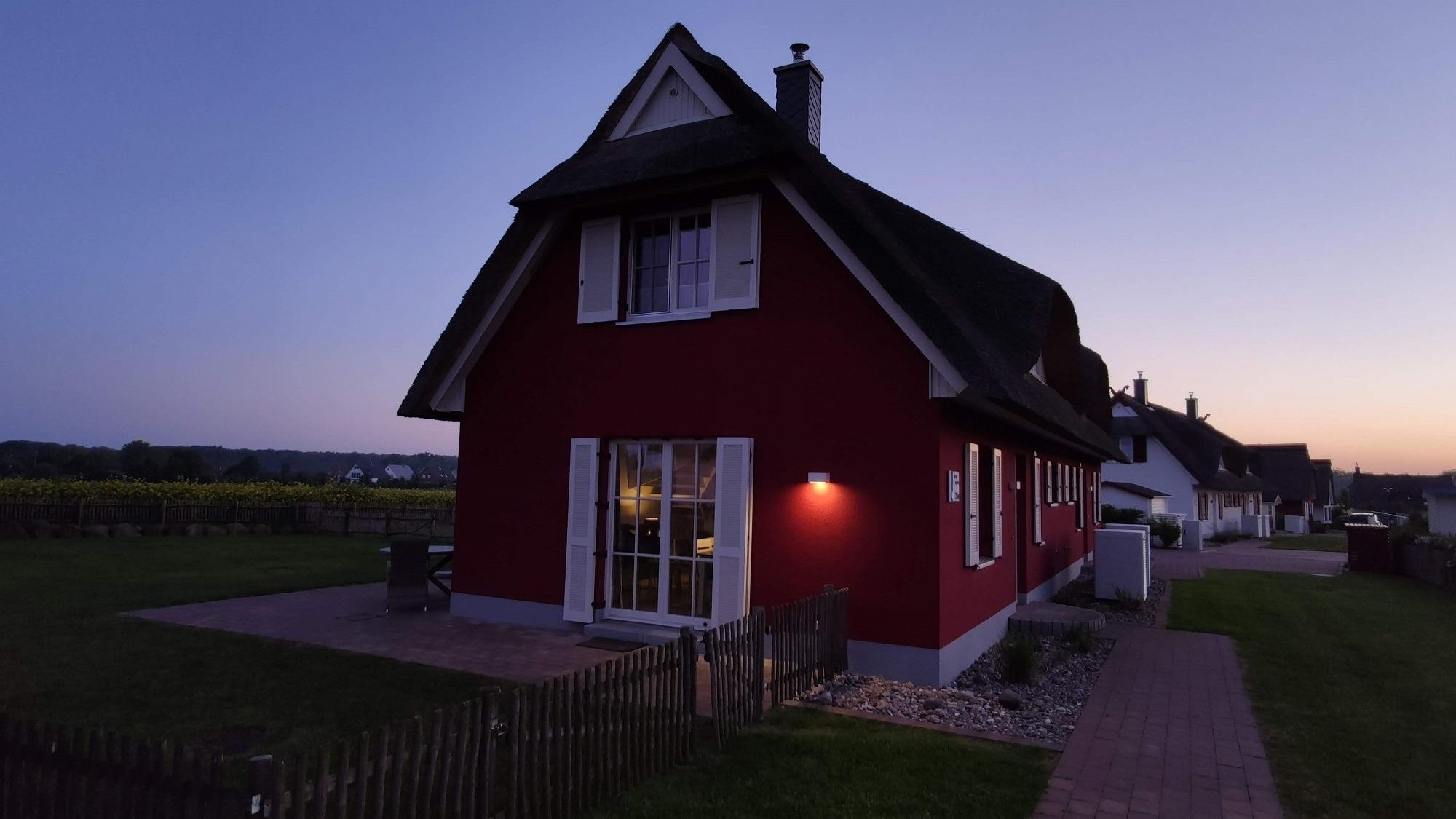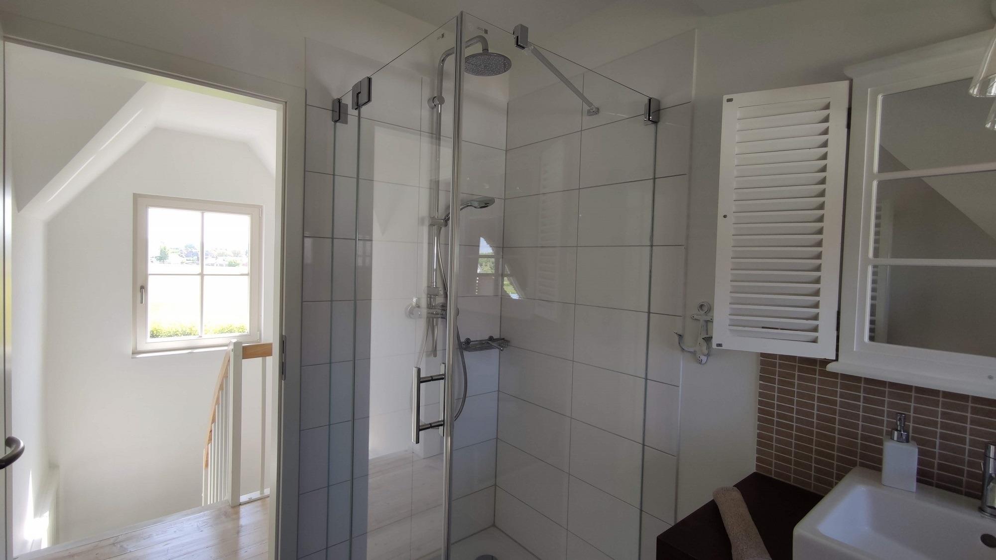 Das Duschbad mit Echtglasduschabtrennung, Waschbecken und WC ist in der typischen Fledermausgaube des Reethauses eingerichtet. Im gesamten Haus ist eine Fußbodenheizung verlegt. Zum Sichtschutz sind Pliesses, Vorhänge und Fensterklappläden angebracht.