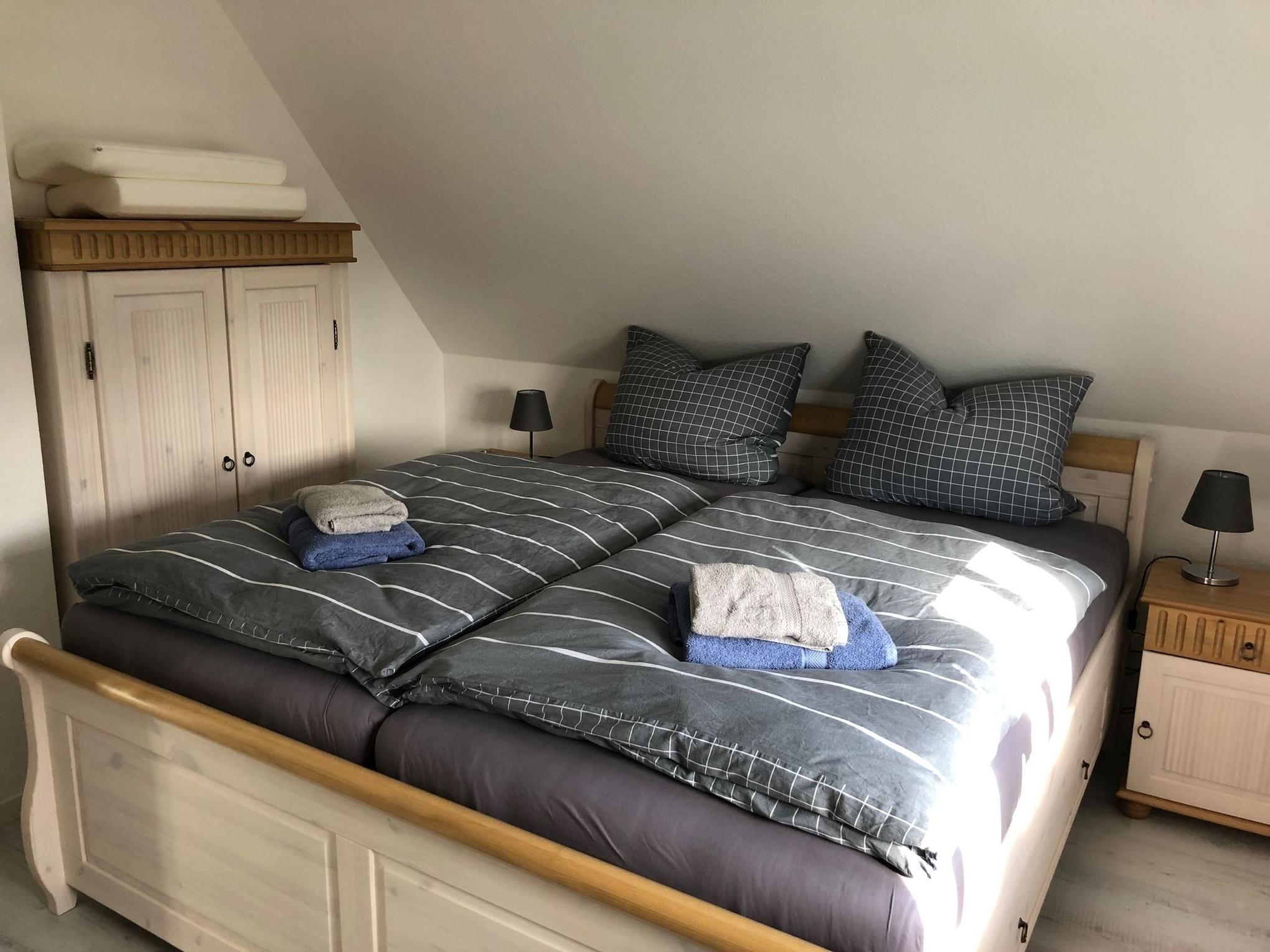 Im oberen Bereich stehen Ihnen zwei Schlafzimmer mit je einem Doppelbett, Schrank und Kommode zur Verfügung. Ein 2. TV ist in jedem Schlafzimmer vorhanden. Das Duschbad mit Echtglasduschabtrennung, Waschbecken und WC ist in der typischen Fledermausgaube des Reethauses eingerichtet. Im gesamten Haus ist eine Fußbodenheizung verlegt. Zum Sichtschutz sind Plissees und Fensterklappläden angebracht. Eine Waschmaschine und diverse Putzutensilien sind im Hauswirtschaftsraum verstaut.