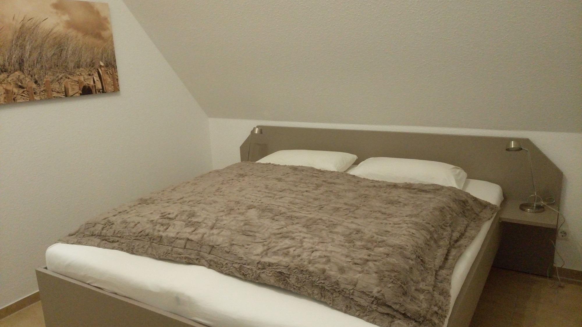 Das im Obergeschoss liegende Schlafzimmer ist mit einem Doppelbett, modernem Wandschrank und TV ausgestattet.