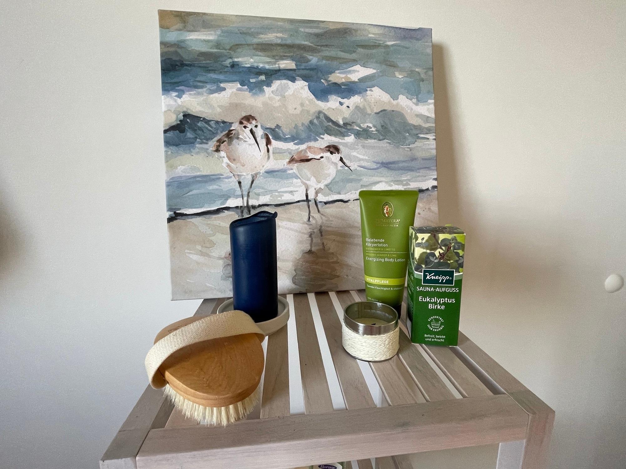Im Garten stehen bequeme Gartenmöbel, ein eigener Strandkorb und eine Hängematte bereit. Die sonnengeschützte Holzterrasse lädt zum barfußlaufen ein. Auf der den Garten umgebenden Natursteinmauer sind Wildrosen gepflanzt. Im Mai zieht ein zarter Duft ums Haus. Im Herbst und Winter finden die Vögel in den Hagebutten Nahrung und Unterschlupf. Zum Grillen steht ein Elektrogrill von Weber zur Verfügung. Zum Naturstrand sind es ca. 400 m.