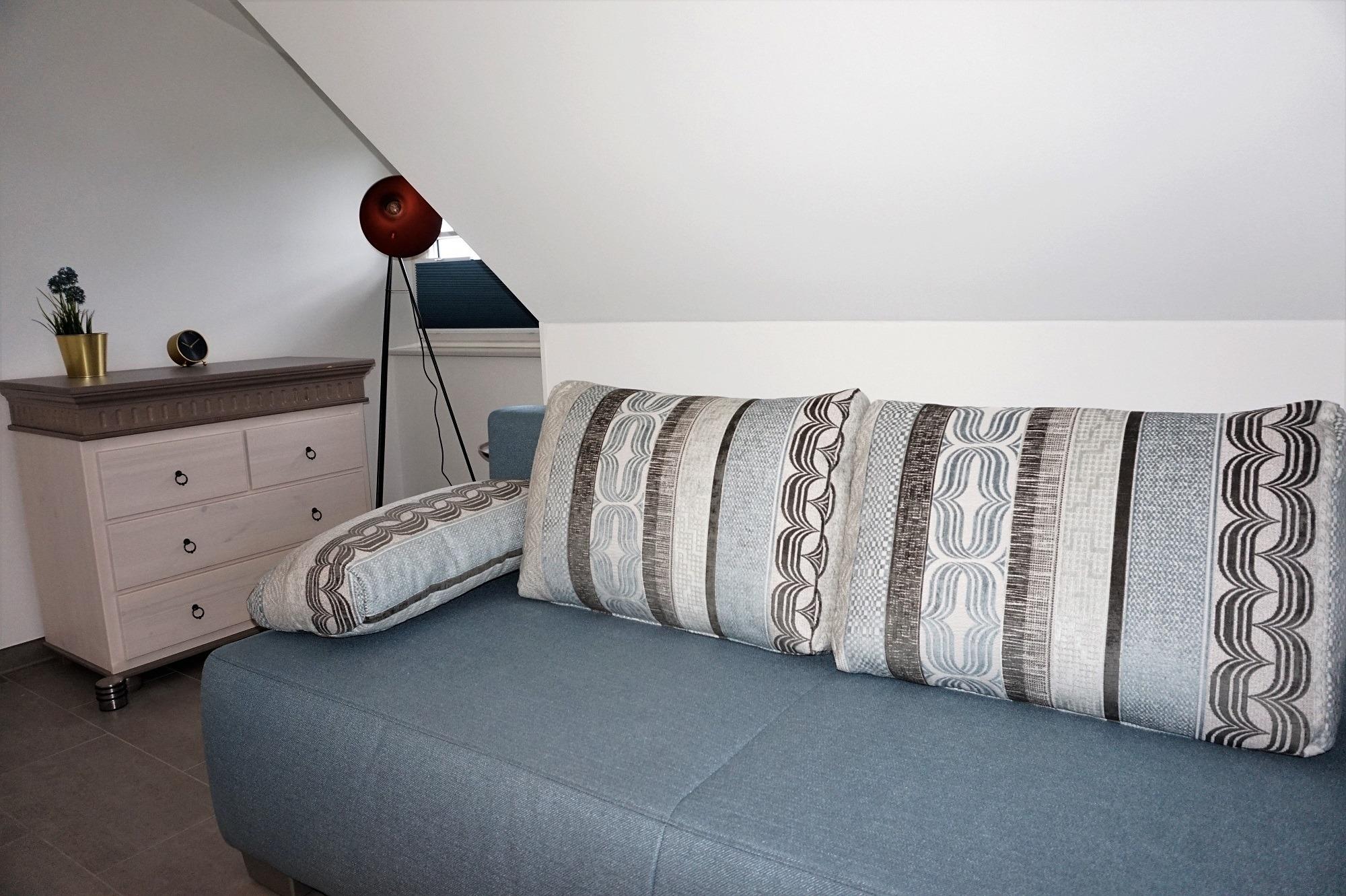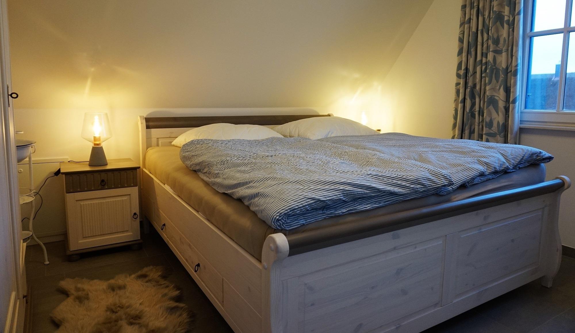 Im Obergeschoss befinden sich die drei Schlafzimmer. Sie sind mit Vollholzmöbel[nbsp]hell eingerichtet. Zwei Schlafzimmer sind mit je[nbsp]einer Schlafcouch und einer Kommode sowie TV eingerichtet - ideal für Ihre Kinder![nbsp] Für die Kleinen Gäste stehen Kinderhochstuhl, Kinderreisebett und Treppenschutzgitter bereit! Eine Kleinkindausstattung für das Badezimmer ist vorhanden. Das große Elternschlafzimmer ist mit einem Doppelbett, Kleiderschrank, Lesesessel und TV / Play-Station 4 inkl. Spielen ausgestattet. Das Vollbad im Obergeschoss verfügt über eine Wanne und der bodentiefen Dusche mit Echtglasabtrennung. Dort finden Sie ebenfalls einen Handtuchheizung, Waschbecken und Föhn - so kann der Tag starten. Der Außenbereich ist komplett eingezäunt und die Terrasse ist zur Westseite ausgerichtet. Hier können Sie sonnige Stunden genießen oder Grillabende mit Ihrer Familie oder Freunden einplanen. Ein fest stehender Grill steht bereit. Genießen Sie die Sonnenstunden auf den Gartenliegen oder im hauseigenen Strandkorb. Vor dem Haus sind zwei Parkplätze. Mitgebrachte Fahrräder können Sie im hauseigenen Abstellschuppen einschließen.