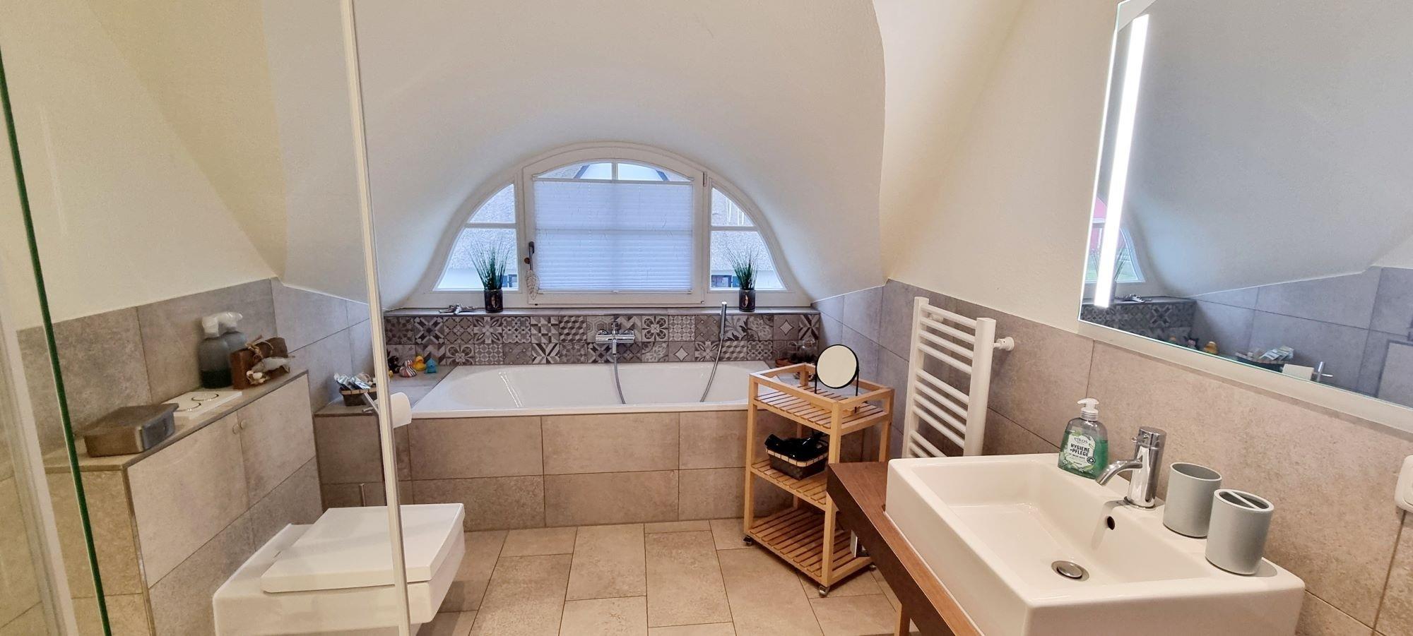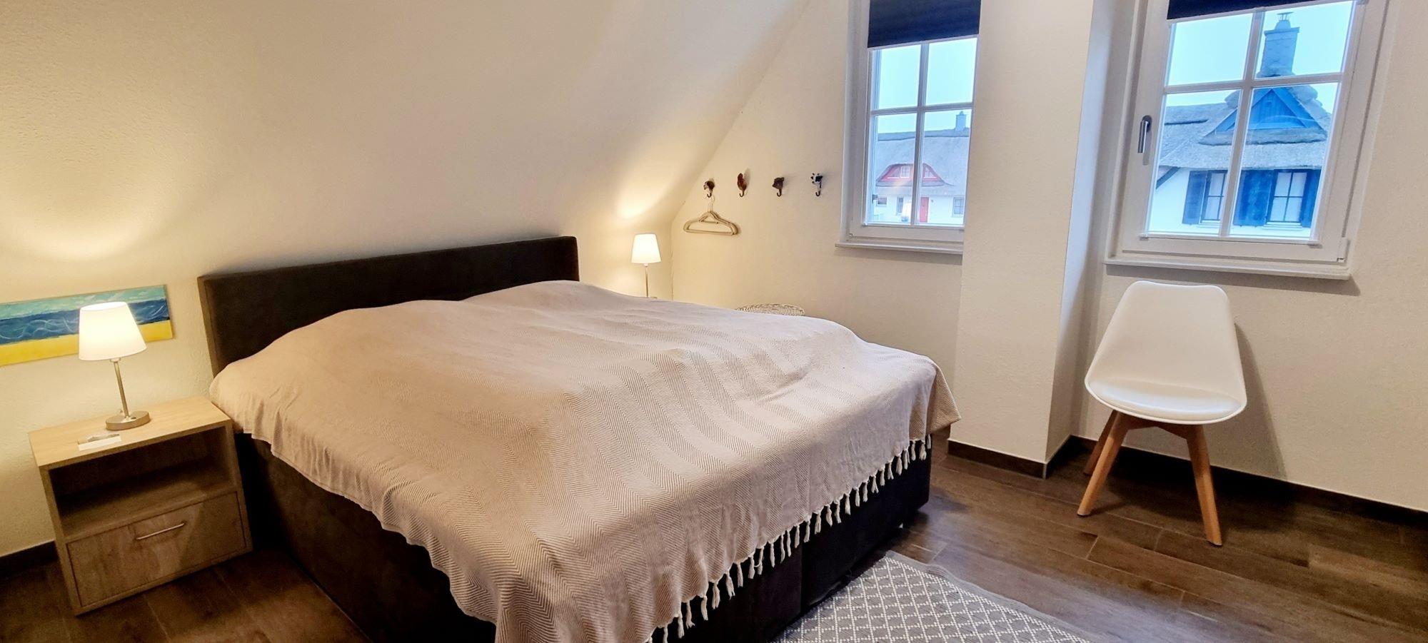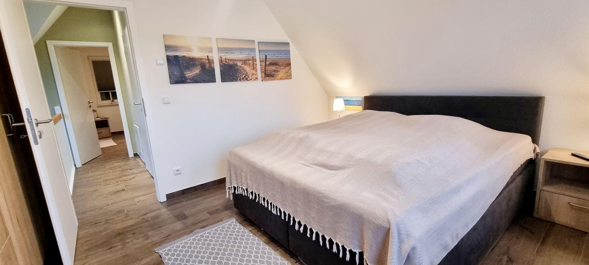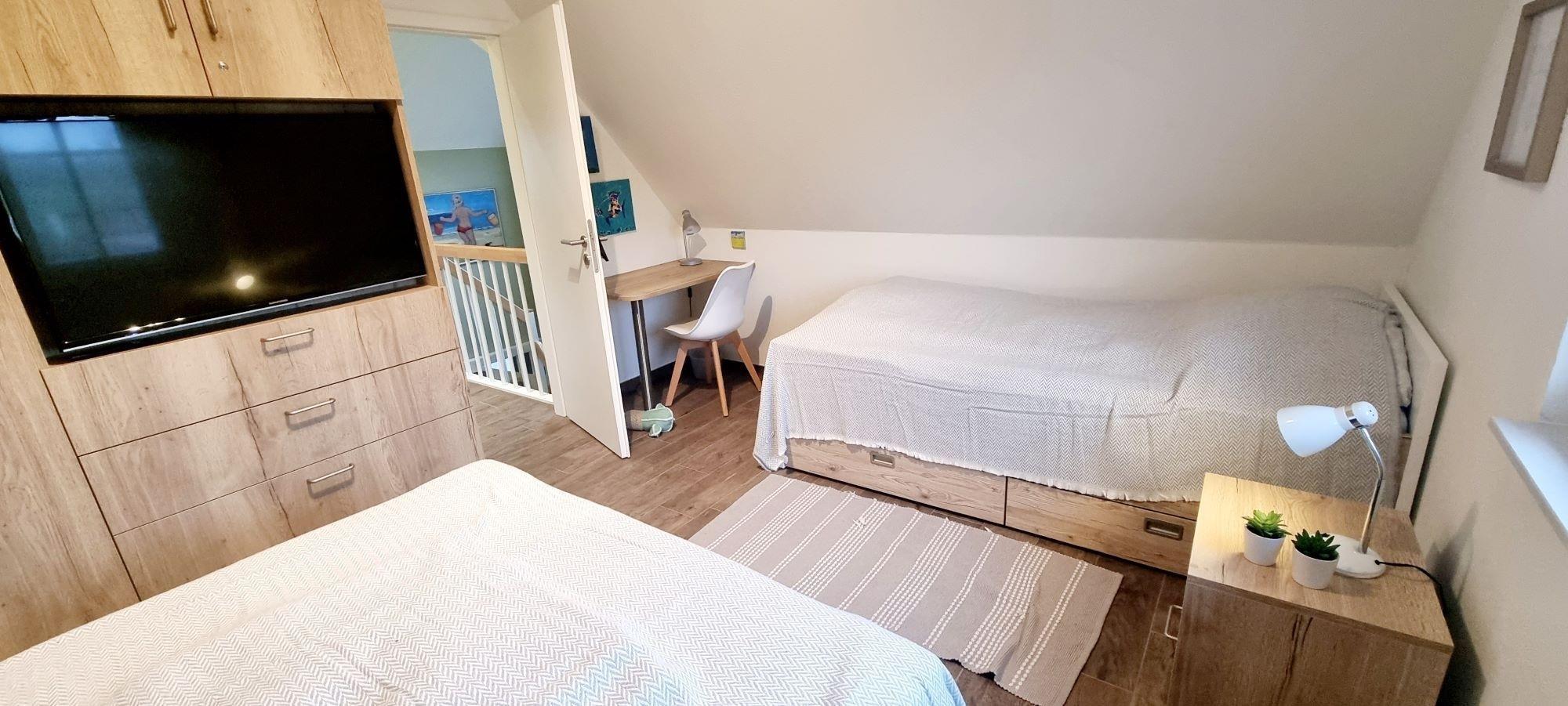 Im Obergeschoss befinden sich die beiden Schlafzimmer. Im rechten Schlafzimmer ist ein Doppelbett und ein eingebauter Kleiderschrank mit 2. TV. Im Kinderzimmer links, steht ein Einzelbette (Kojenbett) und ein Boxspringbett, diese lassen sich nochmal um ein Einzelbett erweitern. Somit haben dort bis zu 4 Kinder eine Schlafmöglichkeit. Auch dort ist ein TV integriert und am Schreibtisch können tolle Urlaubsbilder gemalt und Urlaubsgrüße geschrieben werden. Das große moderne Vollbad mit Badewanne und Dusche befindet sich zwischen den beiden Schlafzimmern. Im Haus ist das Rauchen nicht gestattet und Haustiere sind nicht erwünscht. Auf der Terrasse können Sie die Morgensonne genießen und am Abend den Urlaubstag ausklingen lassen. Diese möbliert und ist mit hohen Gräsern umsäumt und bietet dadurch einen schönen Sichtschutz.