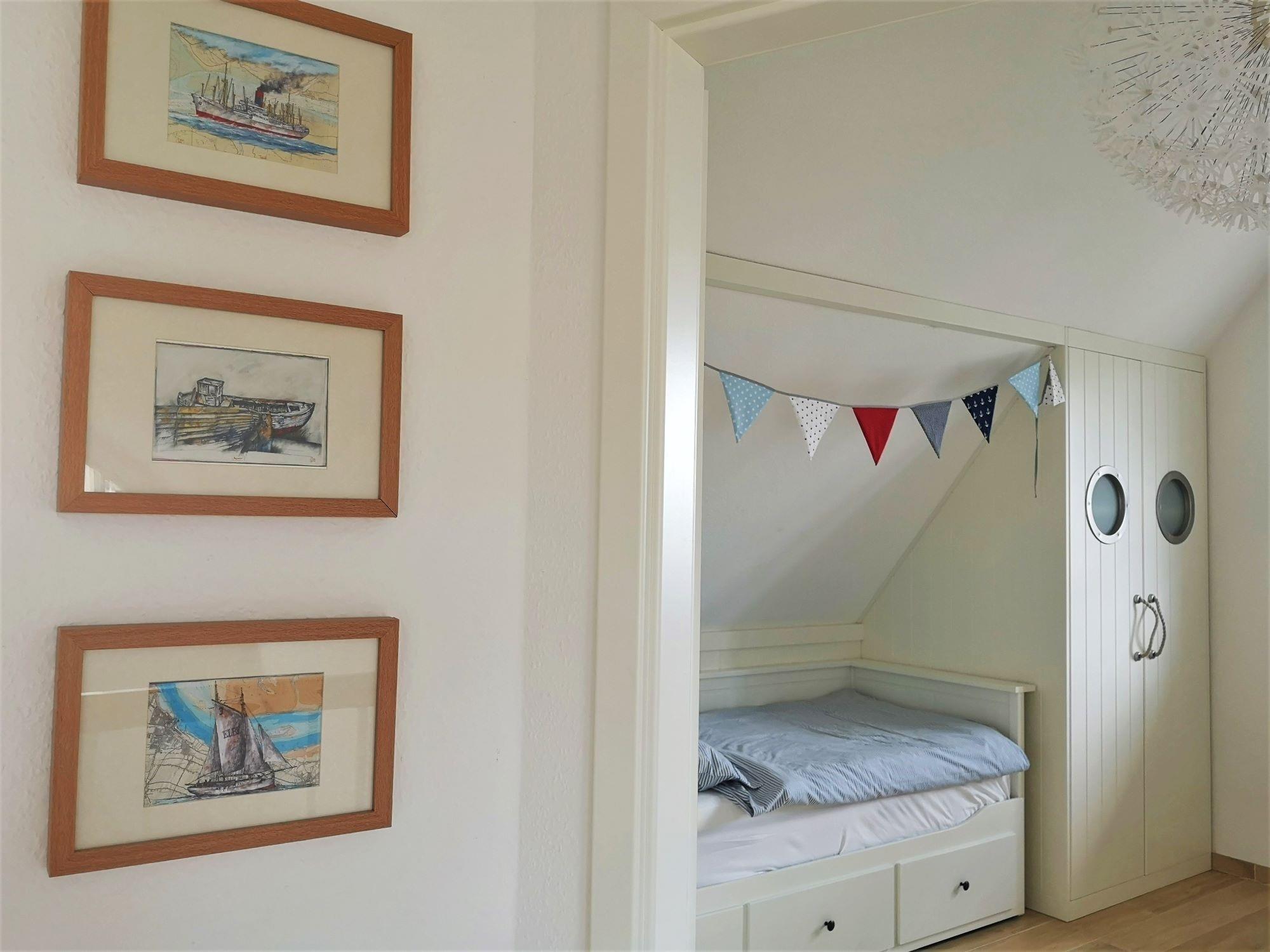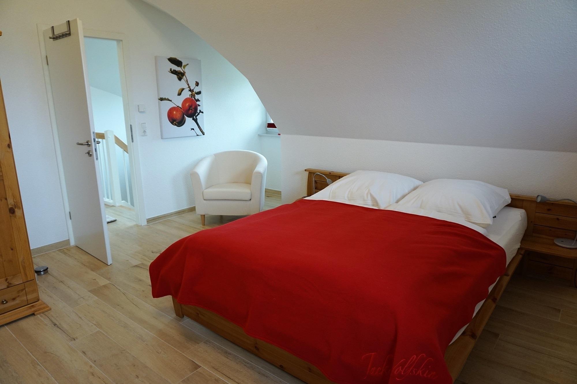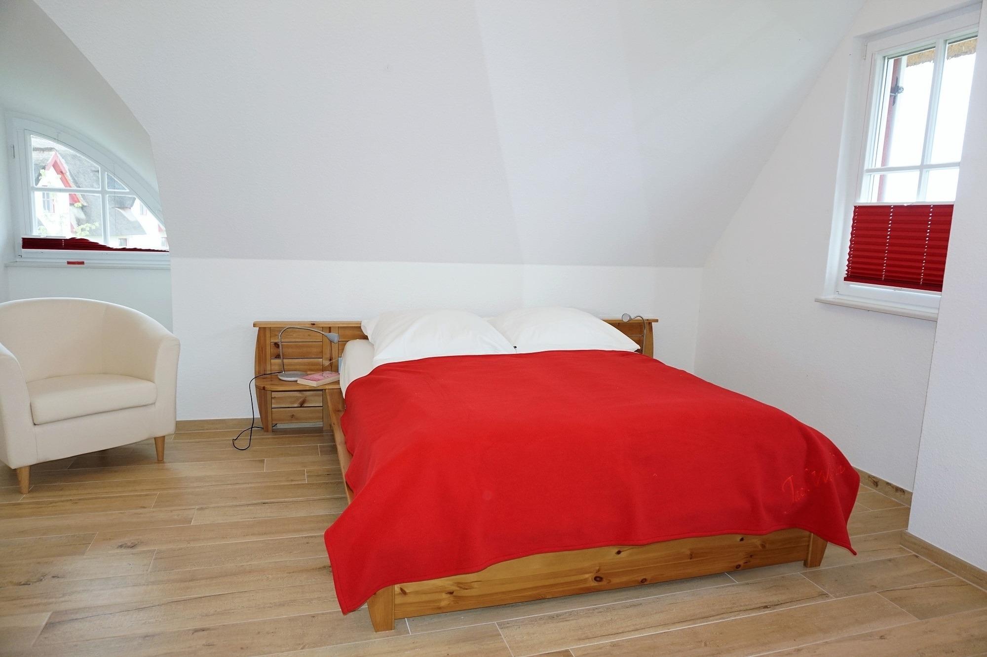 Im Obergeschoss verfügt das Haus über 2 große Schlafzimmer, die jeweils mit einem Doppelbett ausgestattet sind (ein Kinderbett kann in beiden Schlafräumen ergänzt werden). Zusätzlich befindet sich im 2. Schlafzimmer ein Einzelbett, welches sich auf 160x200 m ausziehen lässt. Ein Vollbad mit Dusche und Badewanne rundet das Obergeschoss ab. Das Haus ist nach neuesten energetischen Standards konzipiert, die im ganzen Haus verlegte Fußbodenheizung sowie das Reetdach sorgen für ein angenehmes Raumklima. Auf der mit Gartenmöbeln möblierten Terrasse können Sie im wind- und sonnengeschützten Strandkorb abschalten und den Blick auf die Weite der Natur oder vorbeiziehende Schiffe auf der Ostsee schweifen lassen. Der große Garten bietet Platz zum Entspannen, Spielen oder zum Grillen auf dem gemauerten Grillkamin. Zur Liegenschaft gehören ein abschließbares Gartenhaus und zwei Parkplätze.