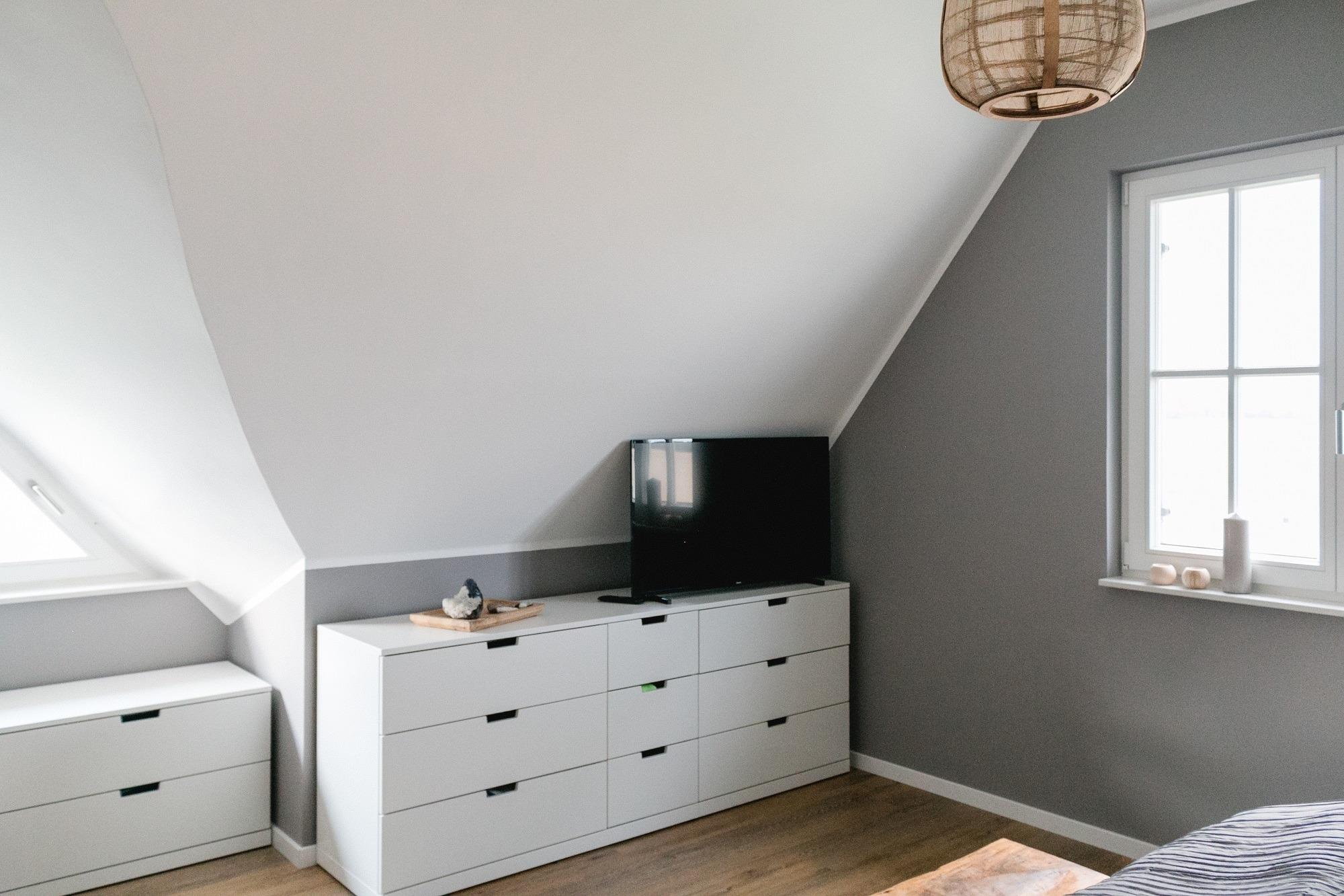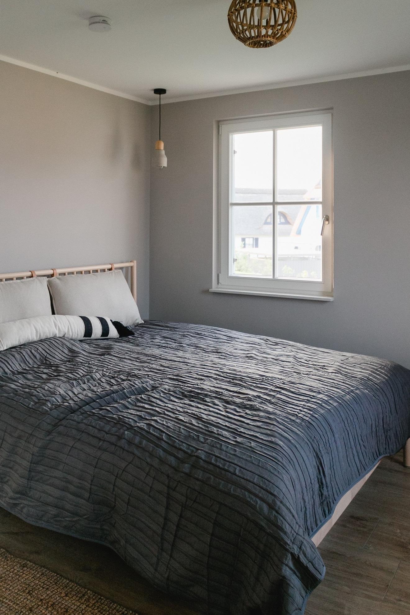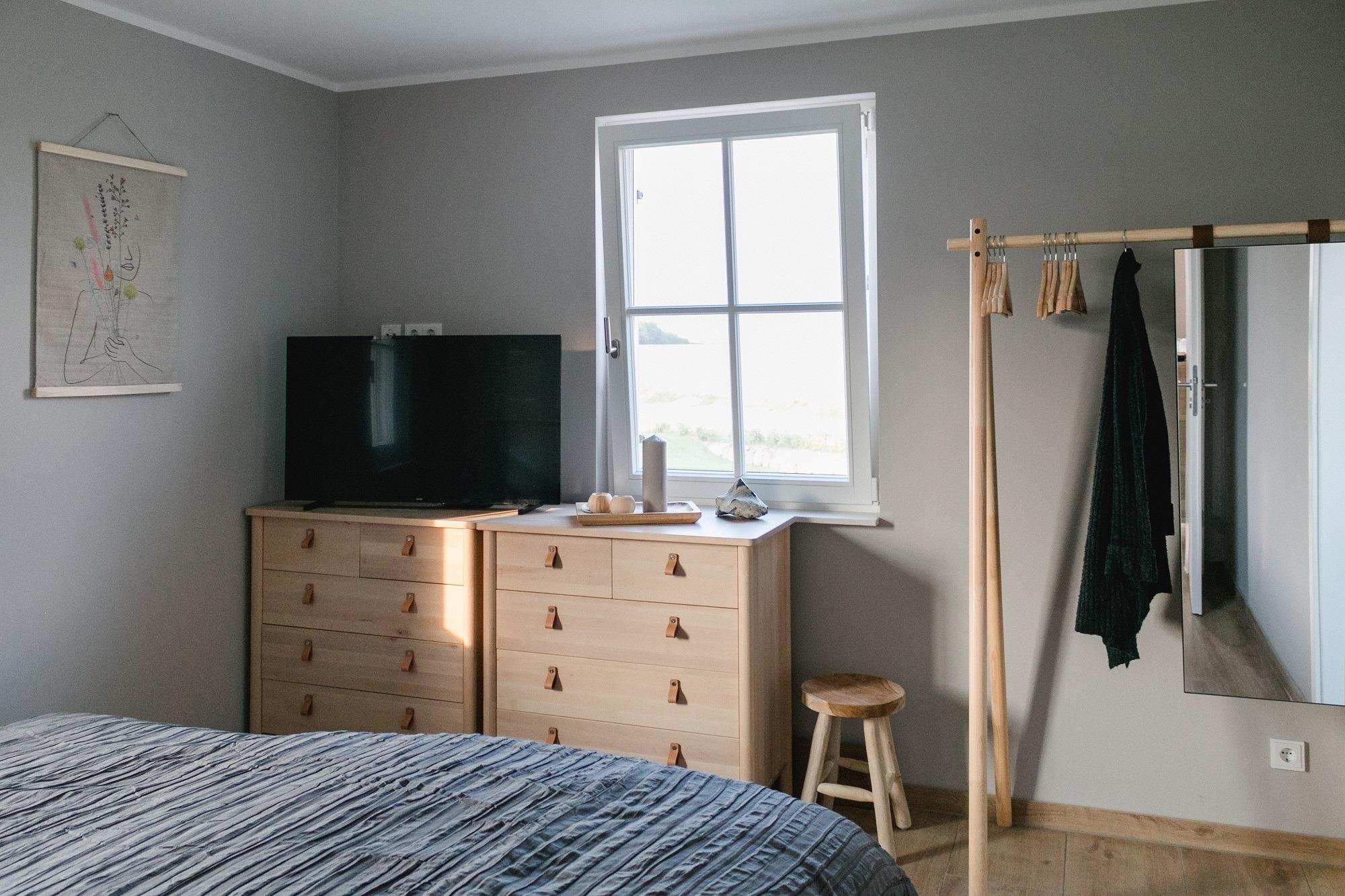 In der ersten Etage befindet sich linkerhand das große Schlafzimmer mit einem 1,80m Doppelbett, viel Stauraum, ebenfalls einem Smart-TV sowie einem Holz-Babybett, damit sich auch Ihr Nachwuchs wie Zuhause fühlen kann. Ein Reise-Babybett kann zusätzlich zur Verfügung gestellt werden und fände in diesem geräumigen Zimmer ebenfalls Platz.