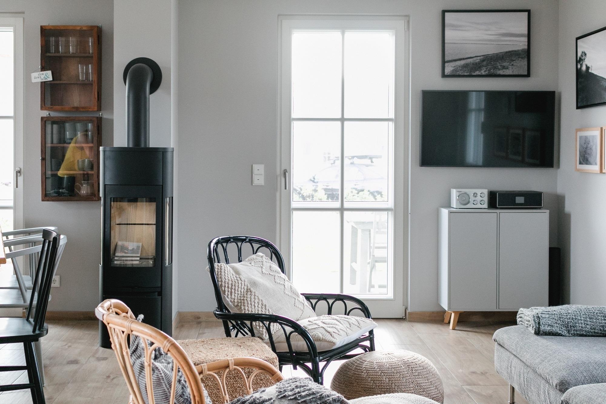 Der gemütliche Sitzbereich bildet mit einem großen Sofa mit extra Sitztiefe, bequemen Korbsesseln und Sitzpoufs die Basis für entspannte Abende. Smart-TV und Blue-Ray Player sind selbstverständlich vorhanden.