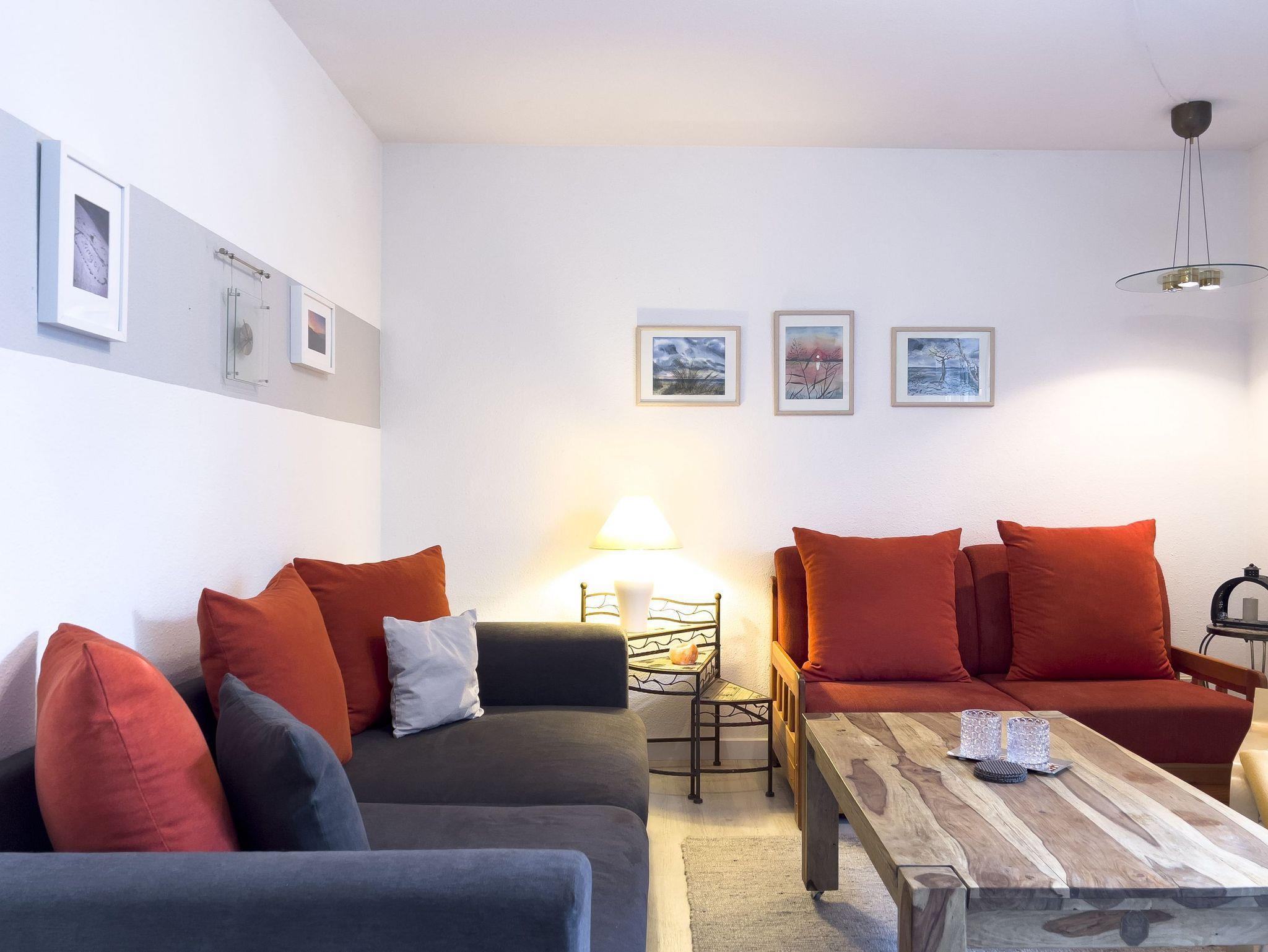 • Wohnbereich: Heller Wohnraum mit bequemer Couch, Flachbild-TV und direktem Zugang zur Terrasse für entspannte Stunden.