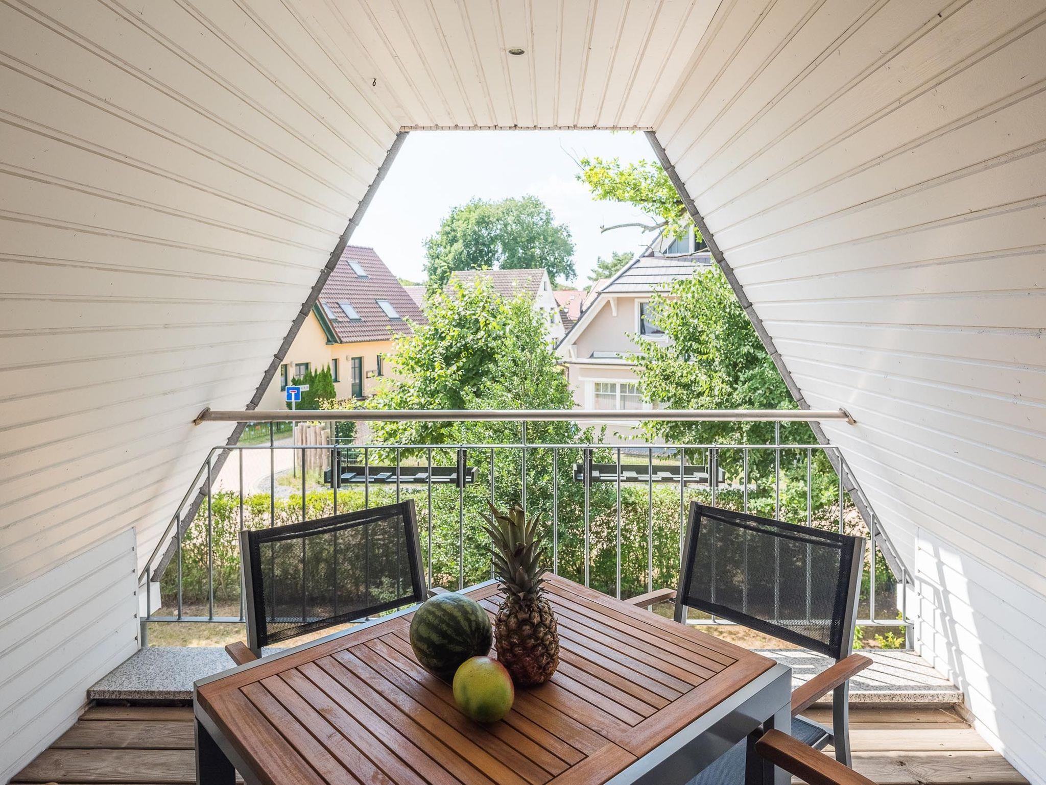 Vom Wohnzimmer aus hat man direkten Zugang zur möblierten Loggia mit Abendsonne und schönem Blick auf die darunter liegende Wiese. Hier kann man Nachmittags sowohl die Sonne genießen als auch bei Regenwetter gemütlich ein Buch lesen oder mit den Kindern Karten spielen.