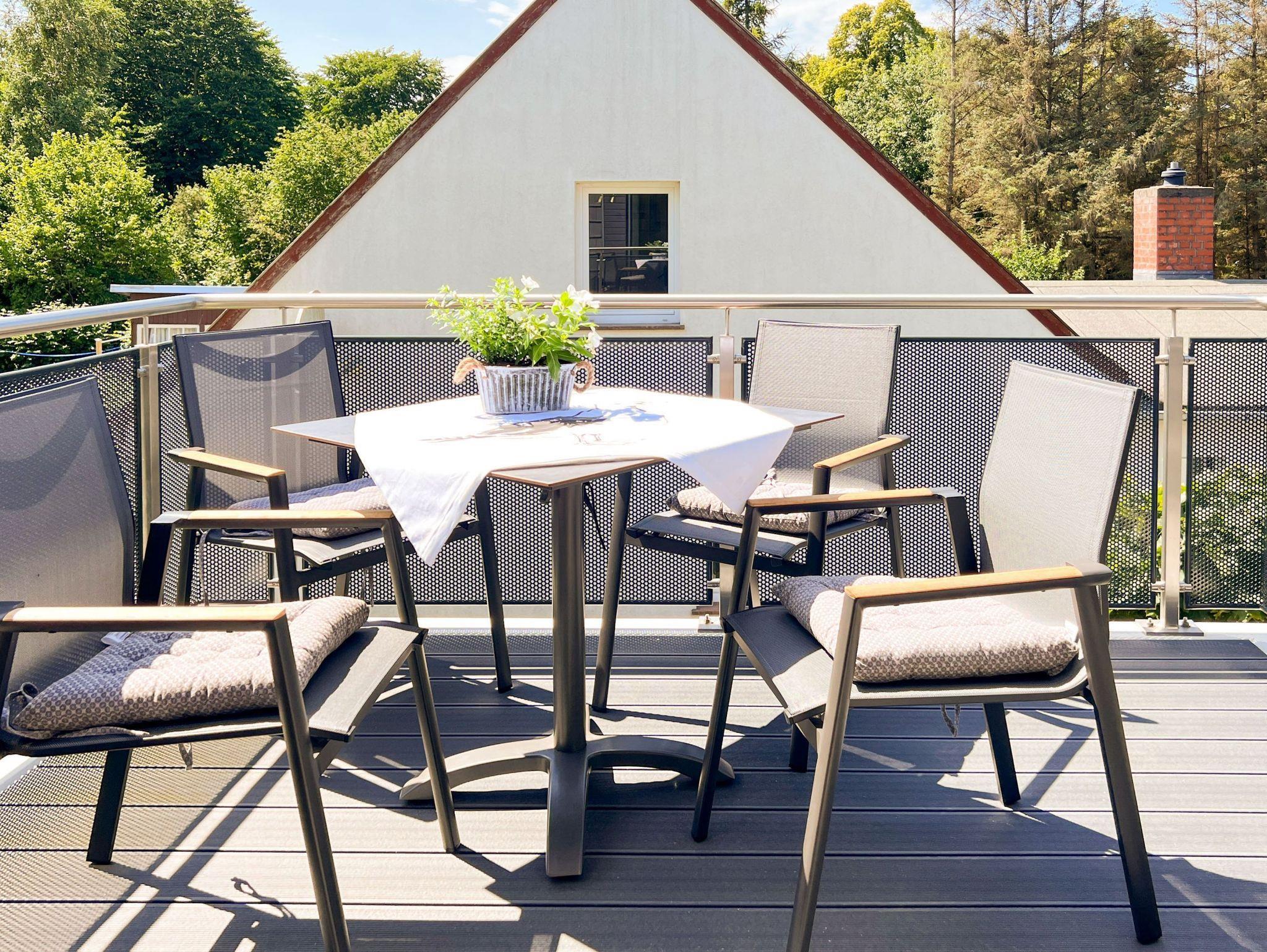 • Sonniger Balkon mit Gartenmöbeln und Sonnenschirm ideal für entspannte Stunden