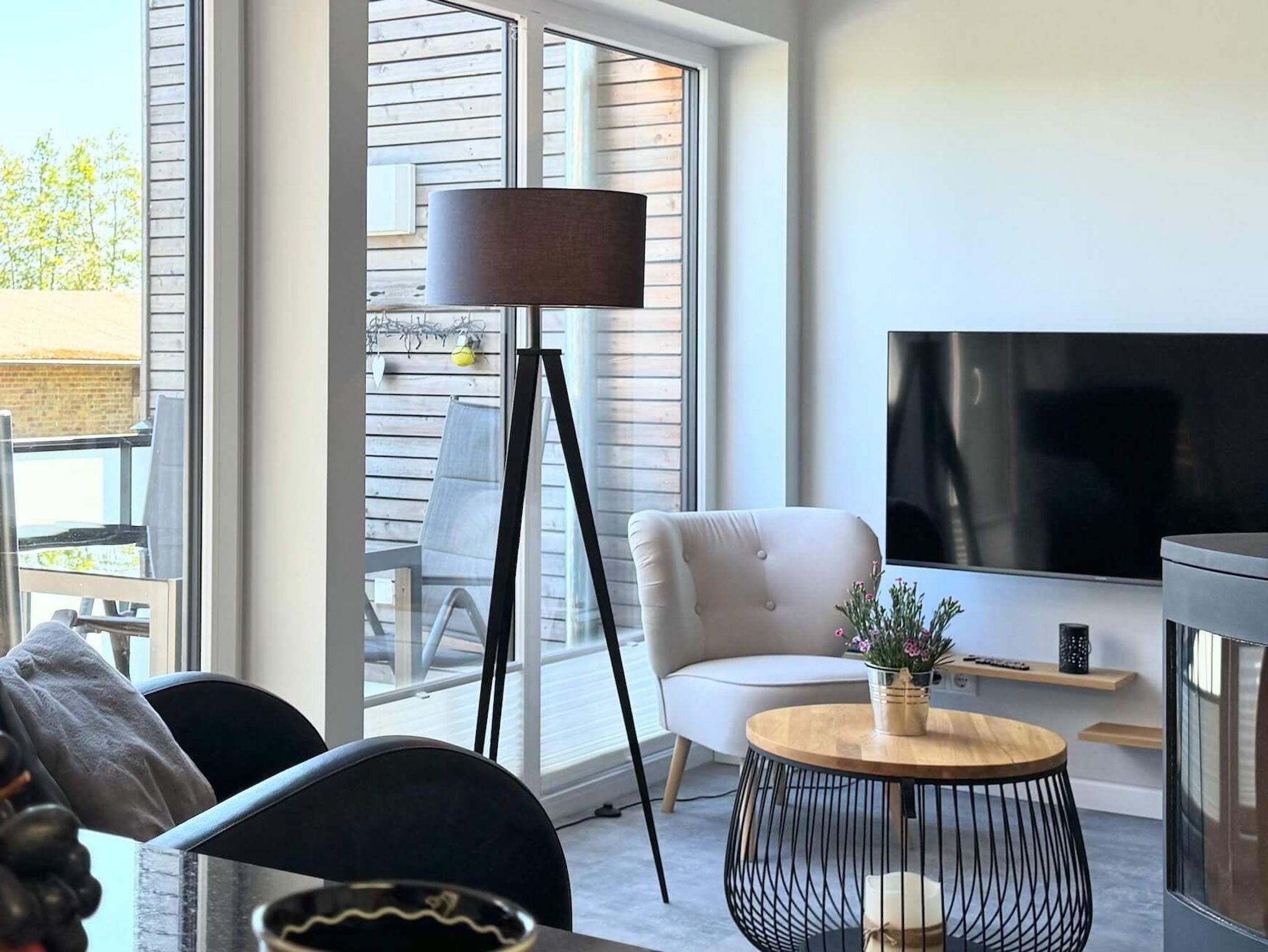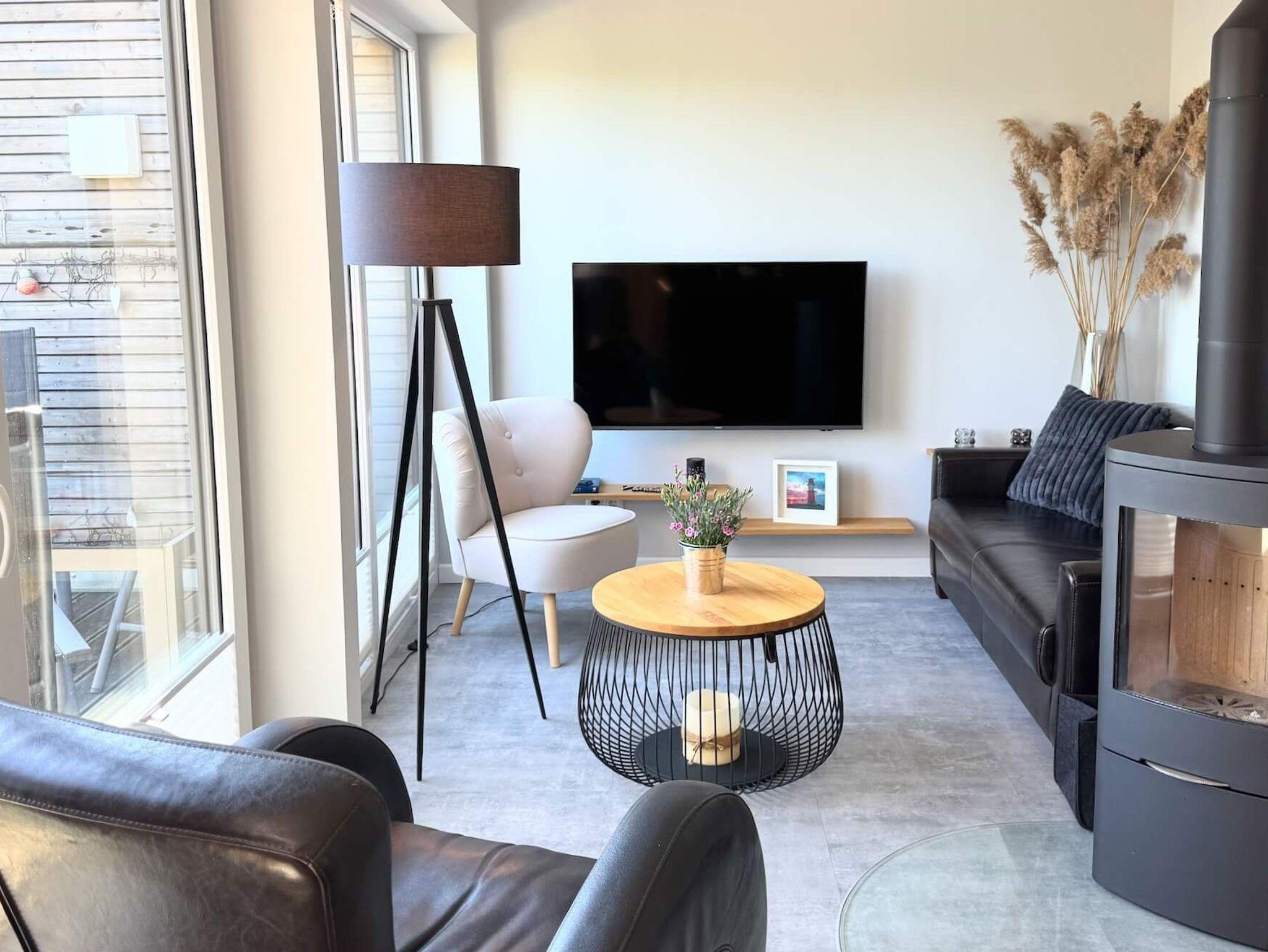 Im Inneren der Koje erwartet Sie ein bis in die Dachschräge offener Wohn- und Essbereich. Die bodentiefen Fenster sind mit Plissees und Fliegengittern ausgestattet. Ein großes Ledersofa mit Fernsehsesseln und Smart-TV sowie der gemütliche Kamin verleihen dieser Koje bei lodernder Flamme und wohliger Wärme zu jeder Jahreszeit ein besonderes Wohlfühlambiente.