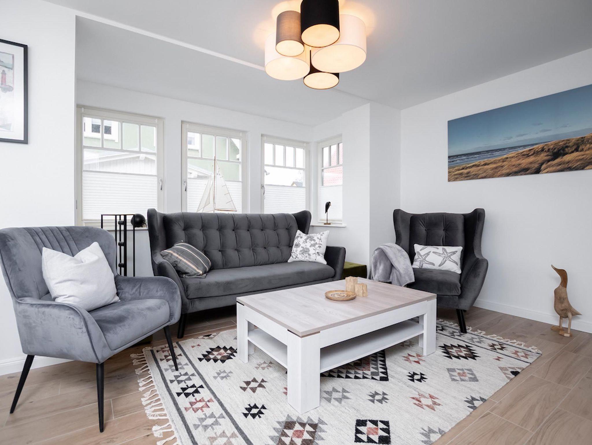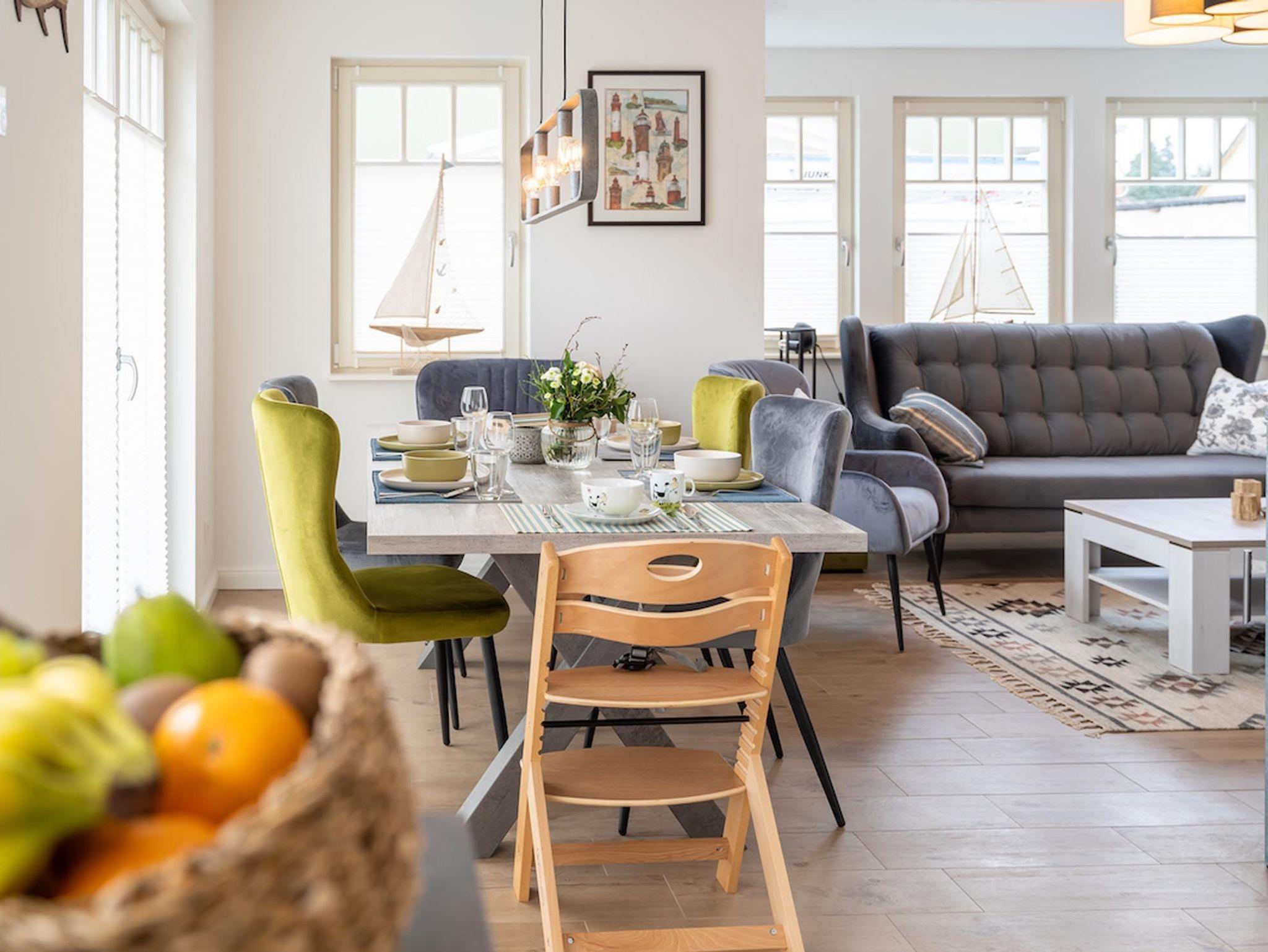 Betreten Sie das Haus durch den Flur, von dem aus Sie zunächst das Gäste-WC mit bodengleicher Dusche und dann den großzügigen Küchen-, Ess- und Wohnbereich erreichen. Die Küche ist voll ausgestattet und lässt das Herz eines jeden Hobbykochs höherschlagen. Für die Familie bietet der große Esstisch oder die Sofalandschaft vor Flatscreen-TV und Kamin viel Platz zum Wohlfühlen. Auch von der südwestlich ausgerichteten Terrasse genießen Sie gemütliche Abende.