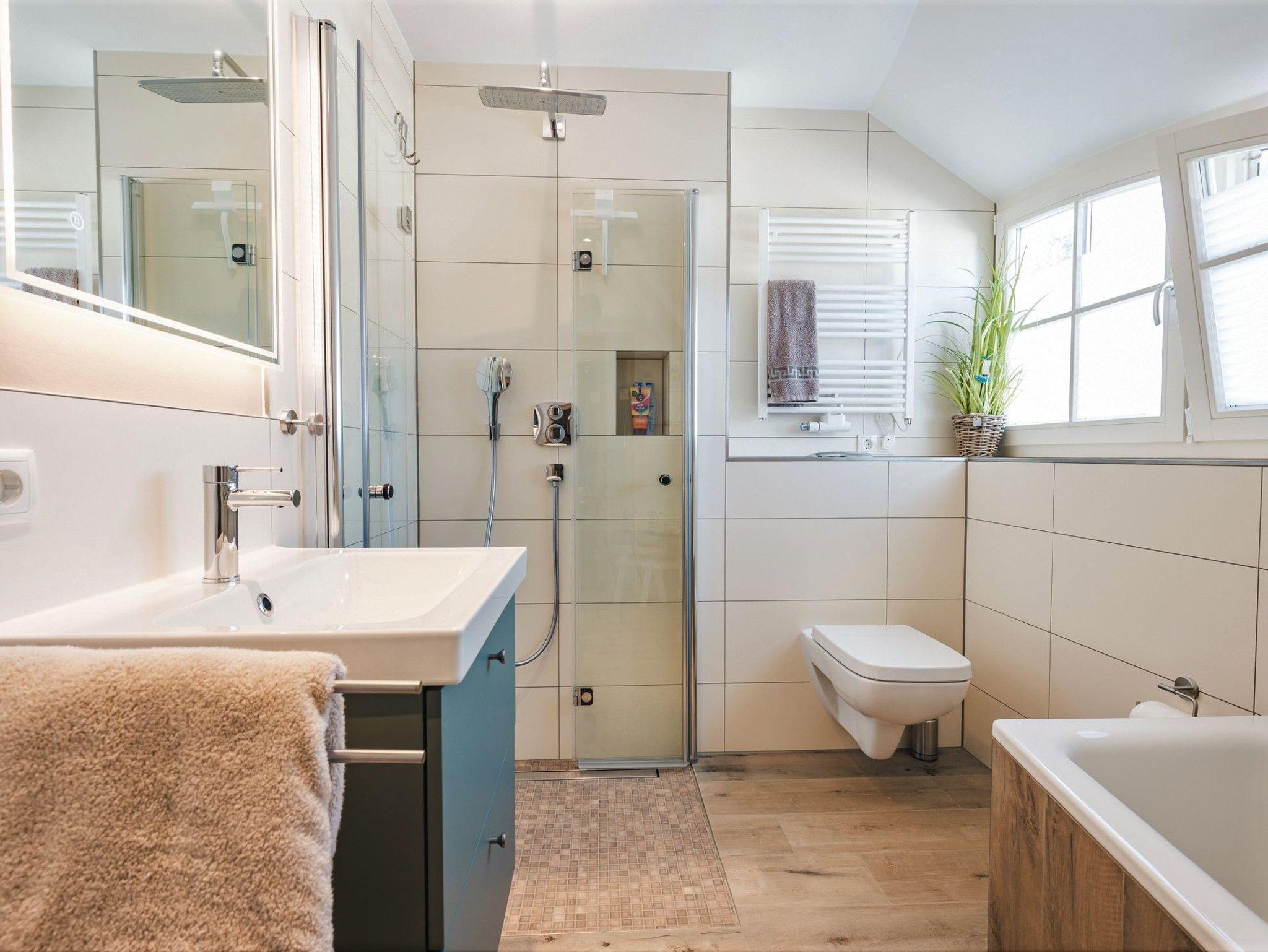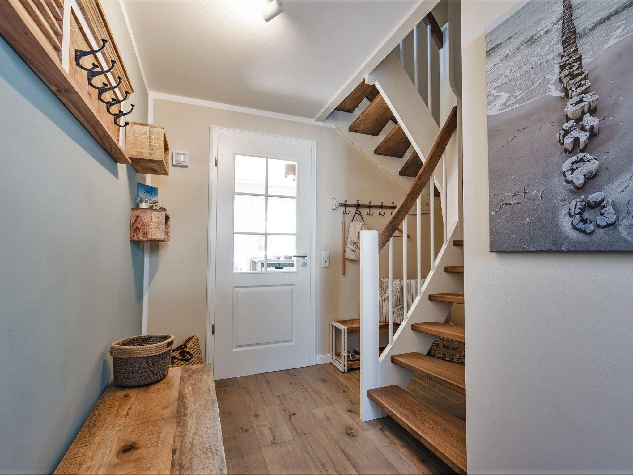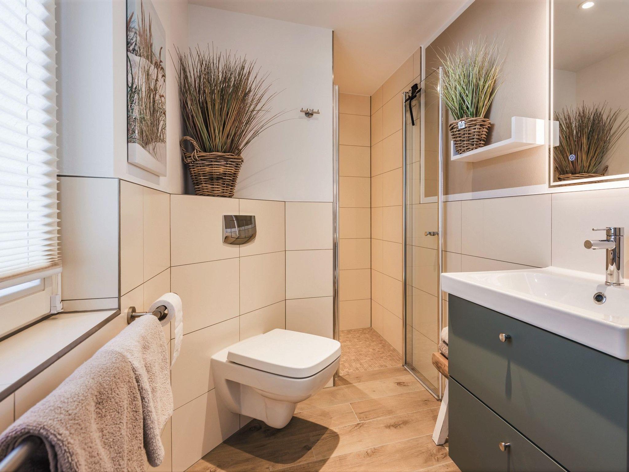 Im Erdgeschoss des Ferienhauses finden Sie neben einem kleinen Duschbad mit ebenerdiger Dusche auch einen Hauswirtschaftsraum mit einem hochwertigen Waschtrockner.