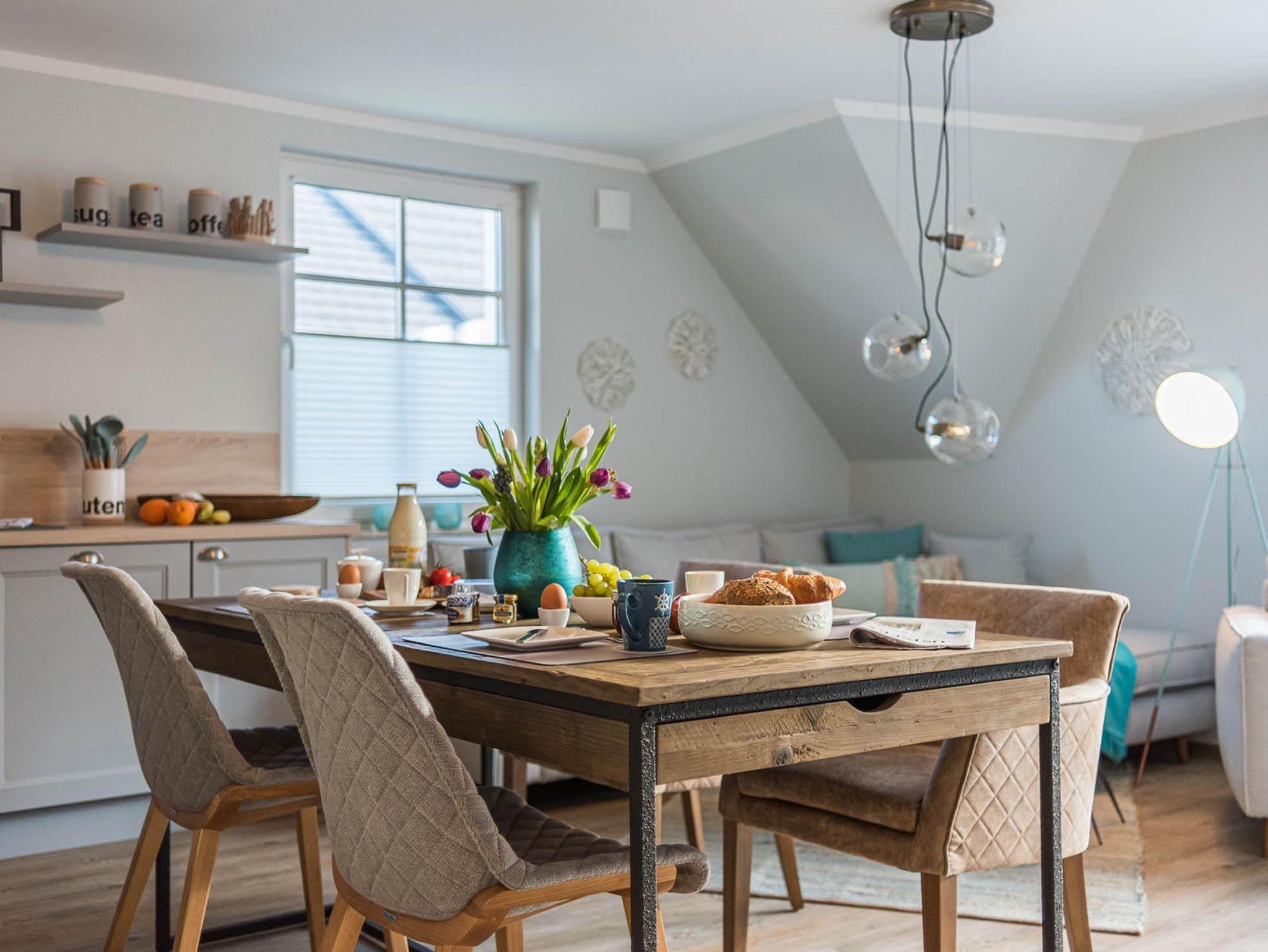 Neues, schönes Maisonette-Appartement mit viel Platz für 4 Personen in Zingst. Der große, helle und freundlich eingerichtete Wohnraum mit Koch- und Essnische lädt zum Verweilen ein. Die Küche ist mit hochwertigen Elektrogeräten und Küchenutensilien wie Mikrowelle, Wasserkocher, Toaster und Kaffeemaschine ausgestattet. Der Esstisch bietet ausreichend Platz für die ganze Familie. Gerne können Sie das Frühstück bei Sonnenschein auf dem möblierten Balkon einnehmen und die Meeresluft geniessen oder am Abend einfach den Sternenhimmel betrachten.