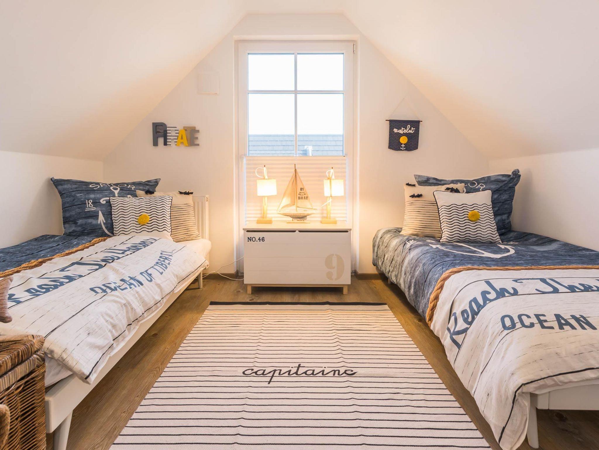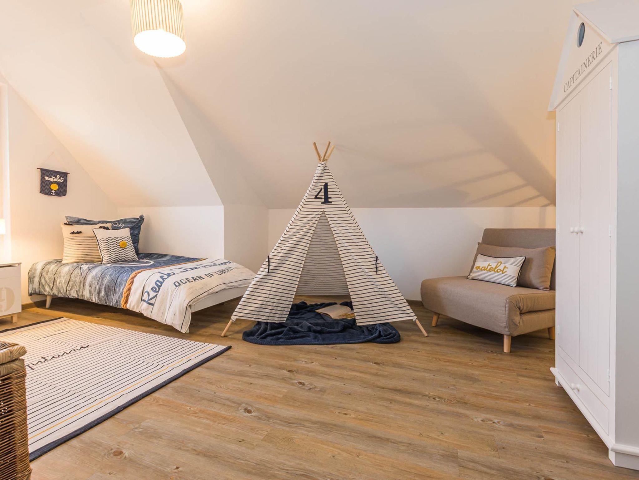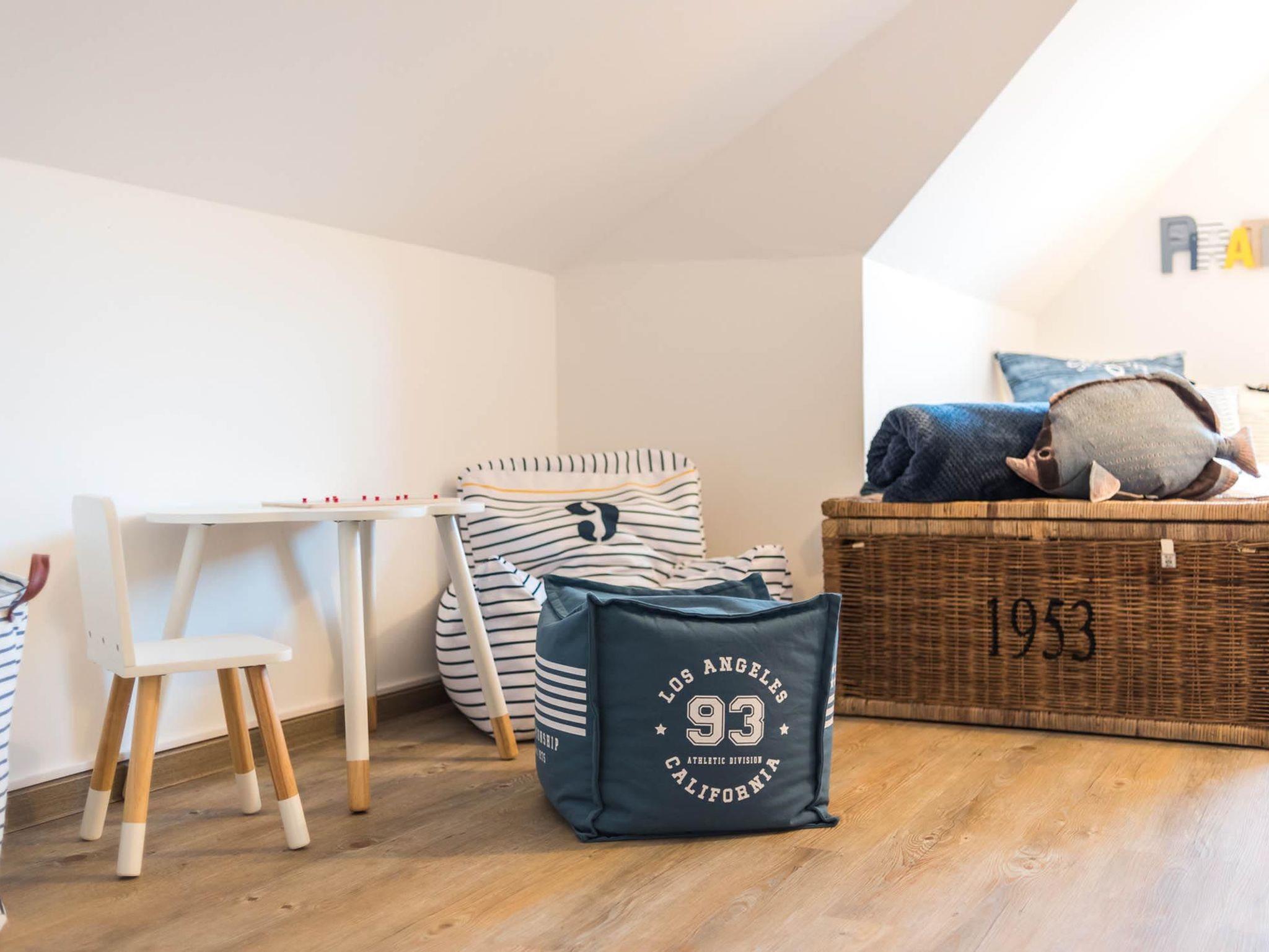 Die Flaschenpost hat 2 Schlafzimmer, das eine ist mit einem komfortablen Doppelbett, das andere im Dachgeschoss mit 2 bequemen Einzelbetten ausgestattet. Im offenen galerieartigen Dachgeschoss-Zimmer entsteht ein kleines Kinderparadies. Neben kleinen Sitzmöbel und Kindertisch dürfen sich die jungen Urlauber auf eine gemütliche Rückzugs-Koje freuen. Hier oben befindet sich auch die 5. Schlafmöglichkeit, ein Sessel lässt sich zur Liege ausklappen.