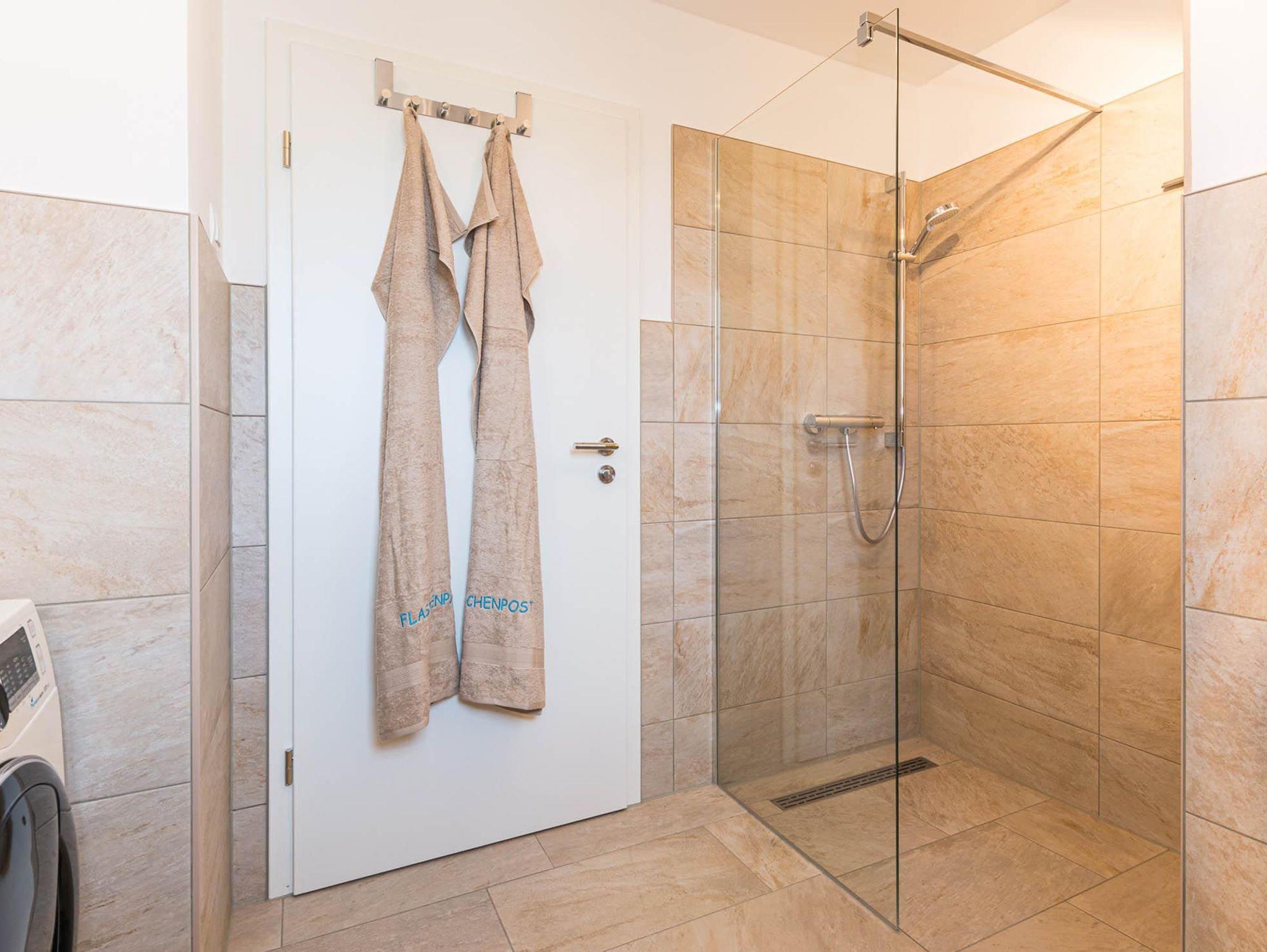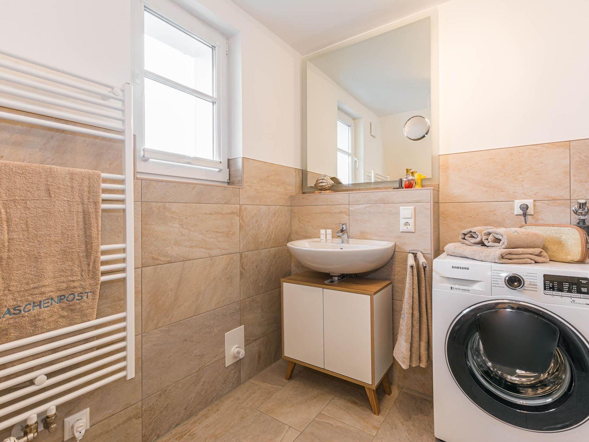Im Bad finden Sie eine bodengleichen Dusche, einen großen Waschtisch sowie eine Waschmaschine vor.