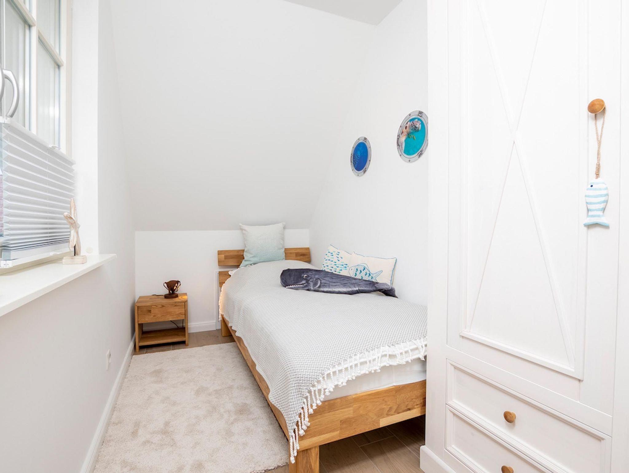 Im Obergeschoss des Ferienhauses befinden sich zwei Schlafzimmer für je zwei Personen. Eines der Hauptschlafzimmer hat Zugang zu einem separaten kleinen Zimmer mit Einzelbett. Die Schlafzimmer sind mit Boxspringbetten ausgestattet. Der ausgebaute Spitzboden verfügt über zwei weitere Einzelbetten. Drei von vier Schlafzimmern verfügen über einen Flatscreen-TV.