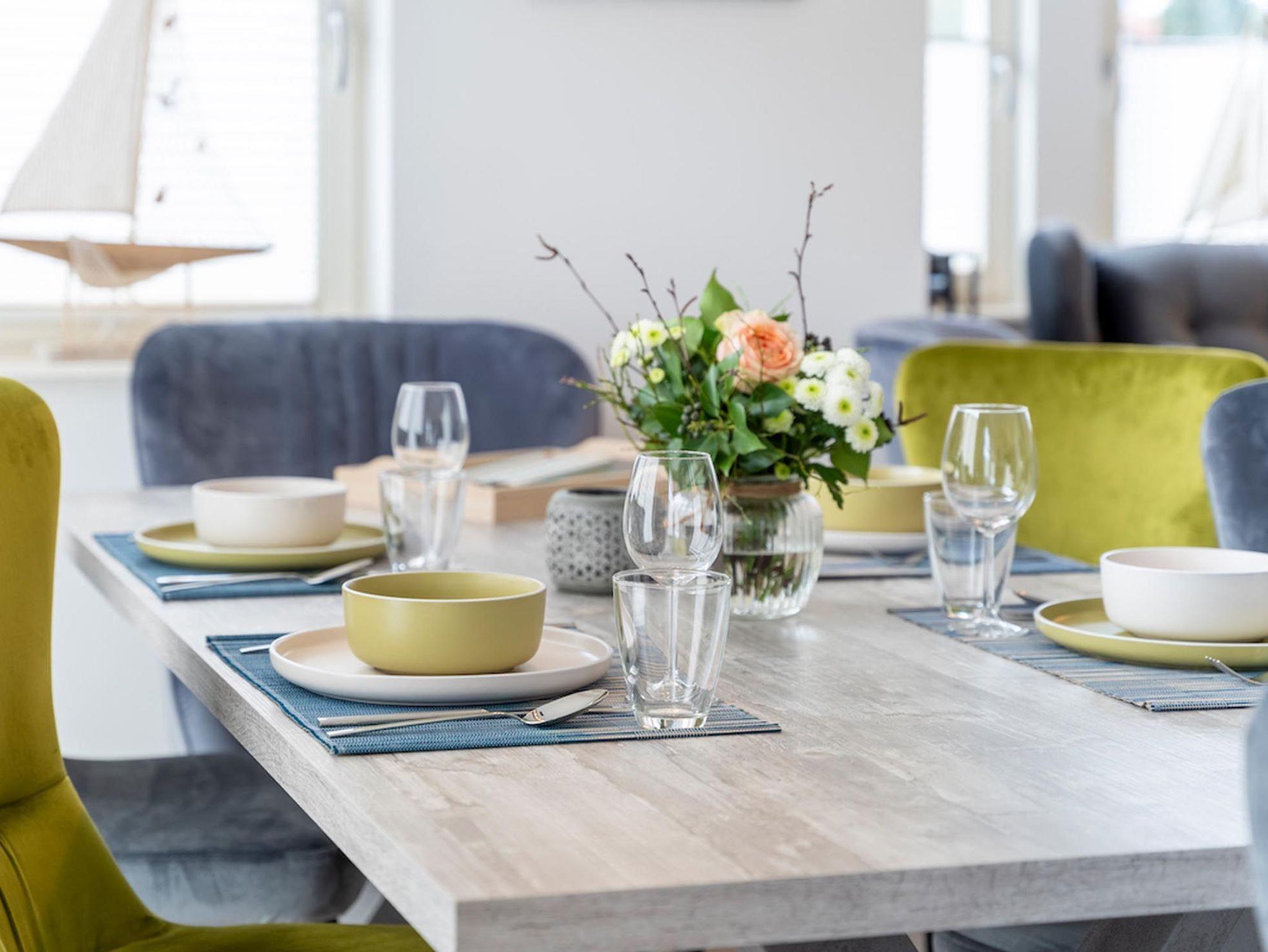 Betreten Sie den Flur des Hauses, von dem aus Sie zunächst das Gäste-WC mit bodengleicher Dusche und dann den großzügigen Küchen-, Ess- und Wohnbereich erreichen. Die Küche ist voll ausgestattet und lässt das Herz eines jeden Hobbykochs höherschlagen. Für die Familie bietet der große Esstisch oder die Sofalandschaft vor Flatscreen-TV und Kamin viel Platz zum Wohlfühlen. Auch von der südwestlich ausgerichteten Terrasse genießen Sie gemütliche Abende.