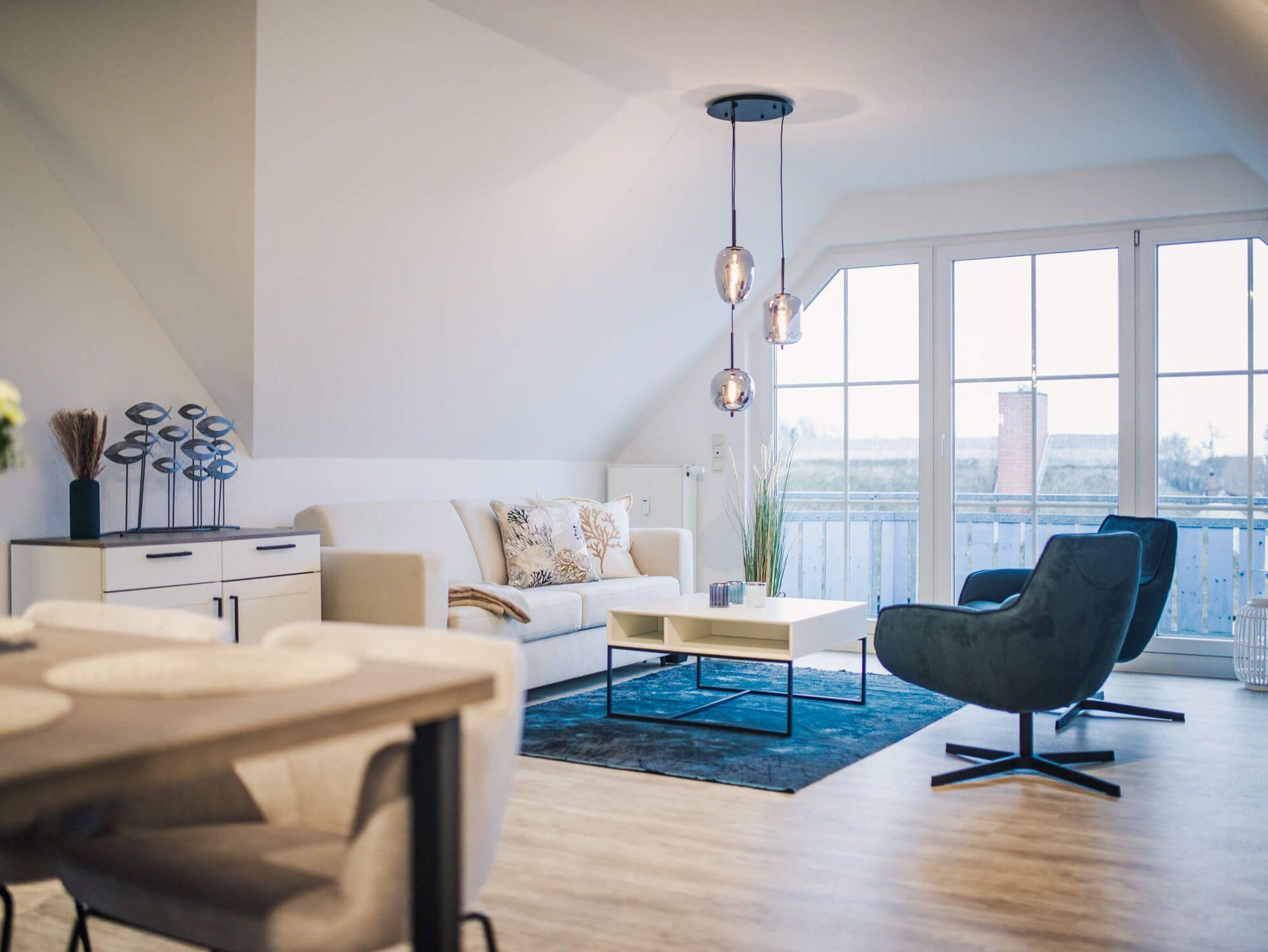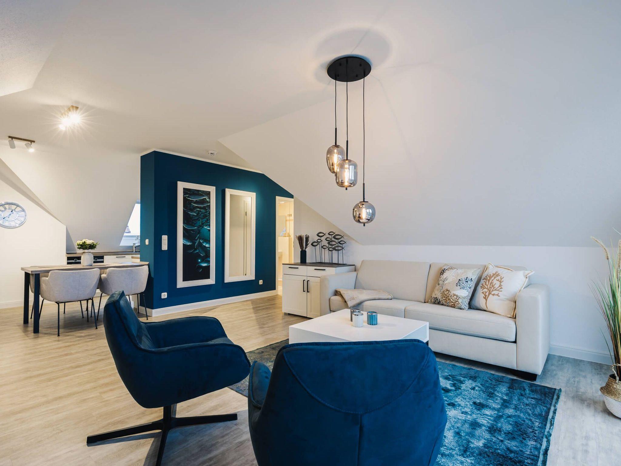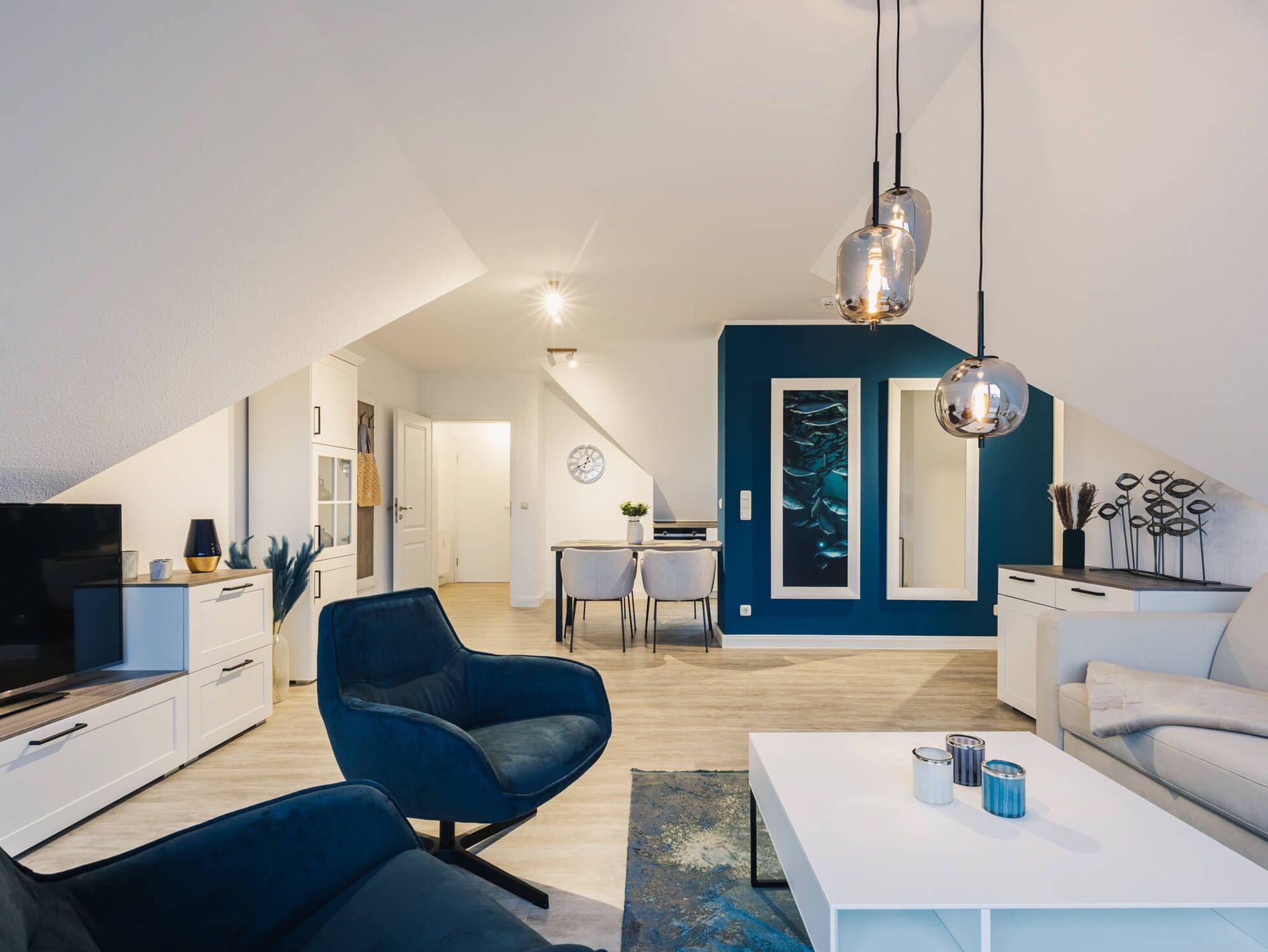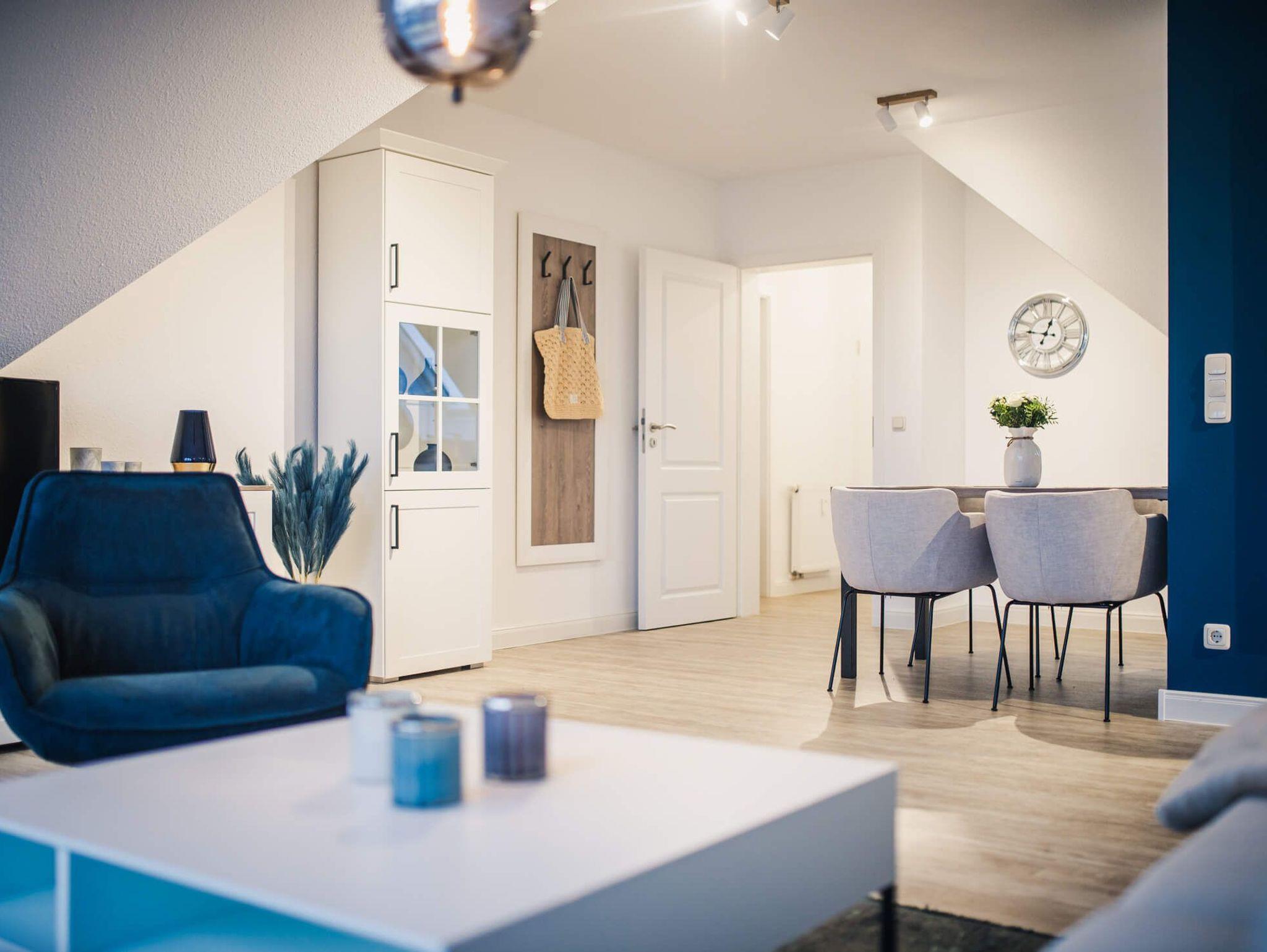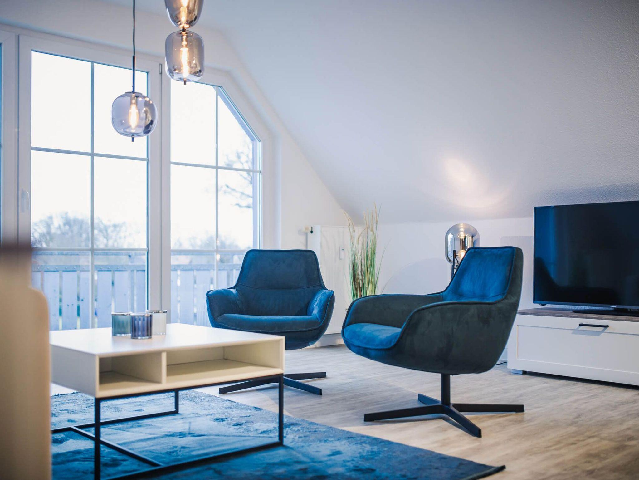 Familienfreundlich: Die Ferienwohnung Luv ist ideal für einen Ostseeurlaub mit Kindern geeignet. Das Schlafzimmer mit Boxspringbett bietet Platz für zwei Personen und im Wohnzimmer befindet sich ein Schlafsofa für weitere zwei Personen. Ein Kinderreisebett mit Matratze steht zur Verfügung.