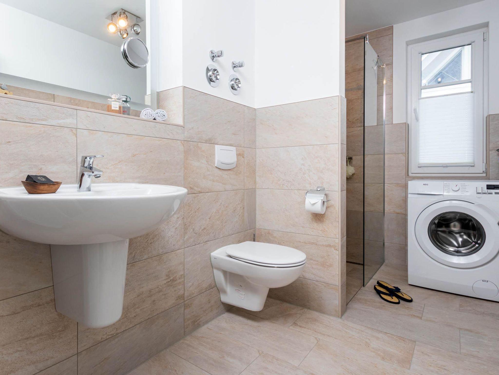 Im Bad finden Sie eine ebenerdige Dusche, einen großen Waschtisch sowie eine Waschmaschine.